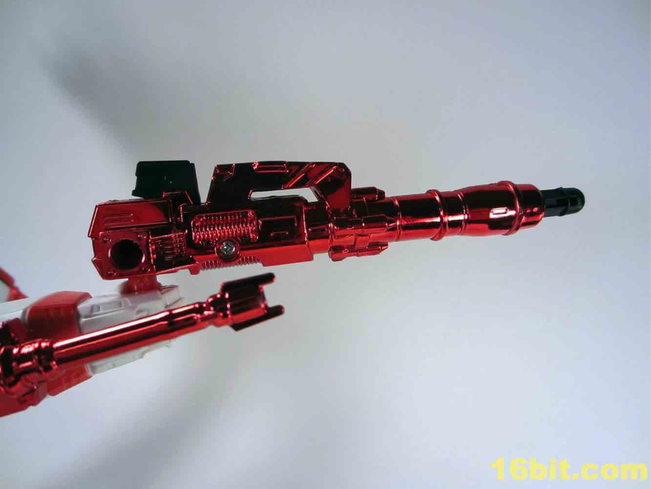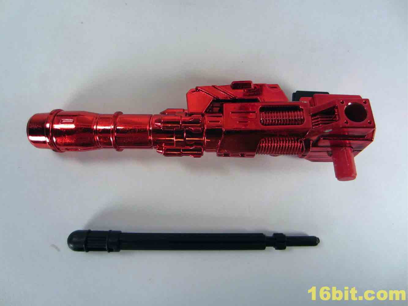 His own Photon Missile weapon fits snuggly in his hand, and the red chrome is already beginning to flake off. Tiny little bits of it are visible under the guns, and bits of the guns have silver visible from where the red used to reside. (Rob Roberts made this video showing that each gun is silver chrome with red paint, and how to remove it to show bare red plastic.) The gun fires nicely, and if you look at the first leaked images of the toy or instruction booklet, the guns changed a bit. They were originally red with black-tipped cannons, plus the toy lost some red striping on his chest and ankles in an effort to shave a few pennies off production pricing. (If you've ever been involved in making a toy, this can really add up.) I should also note, the current press photos of the Takara toy resemble this earlier incarnation.