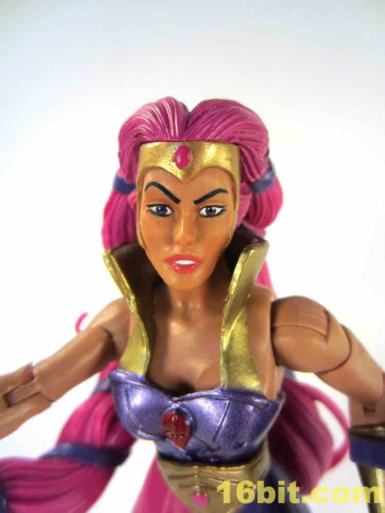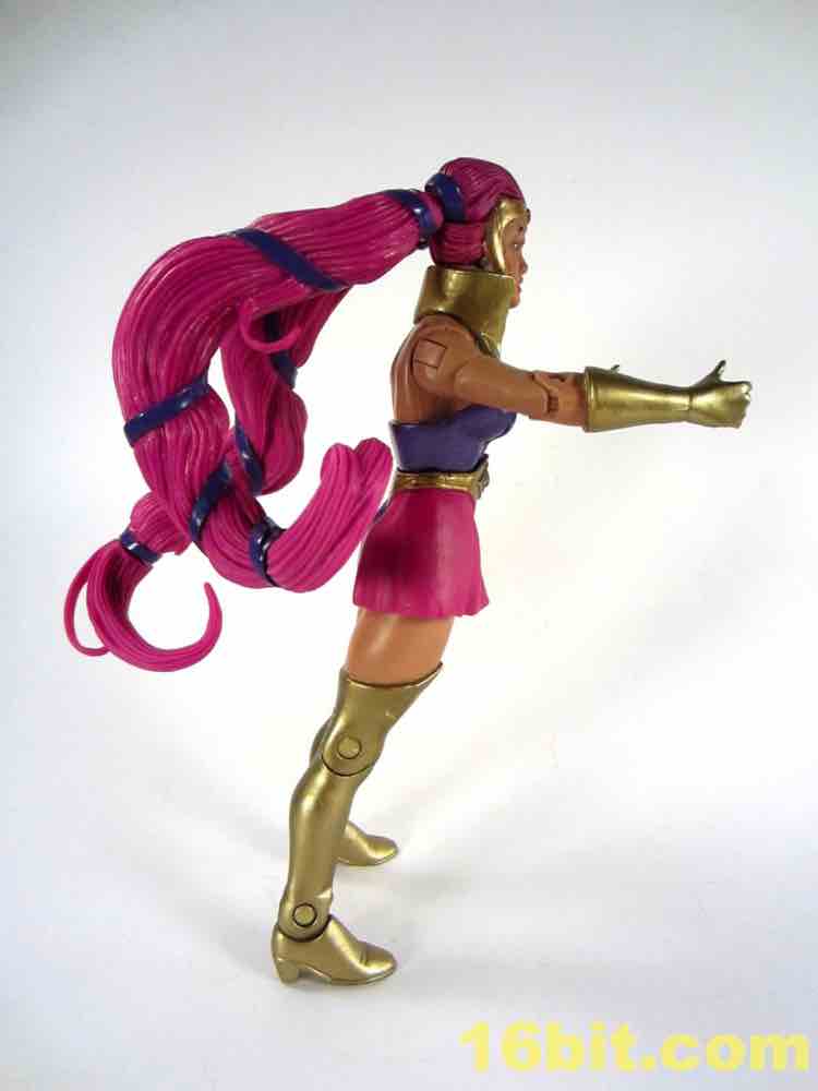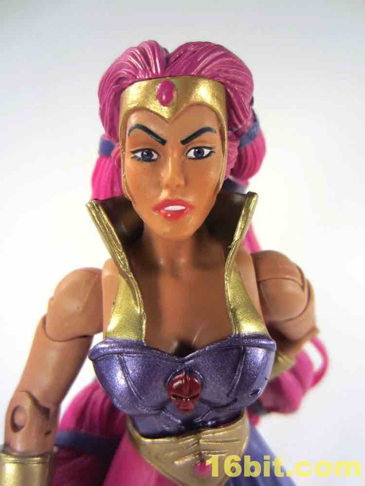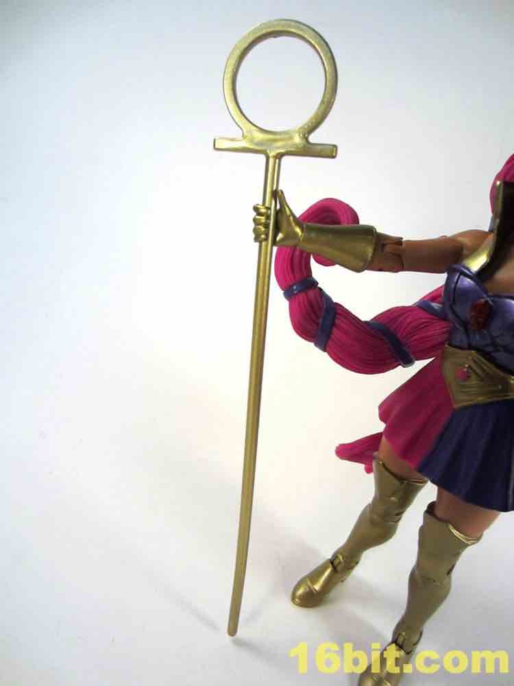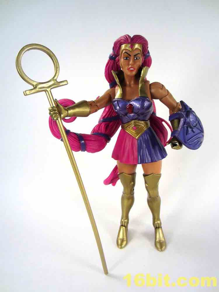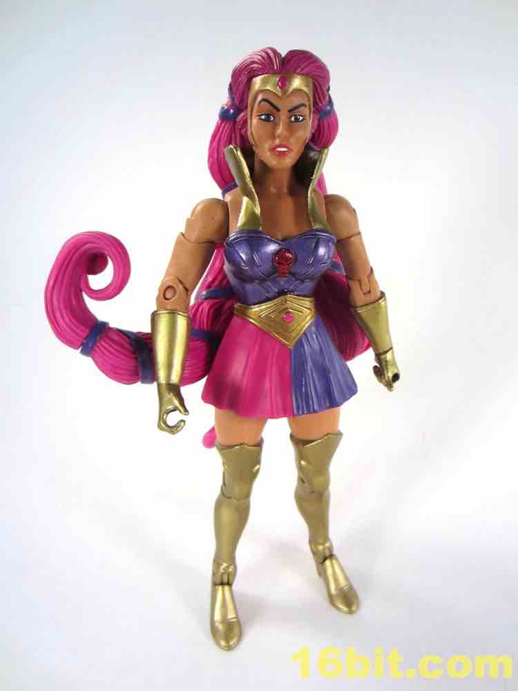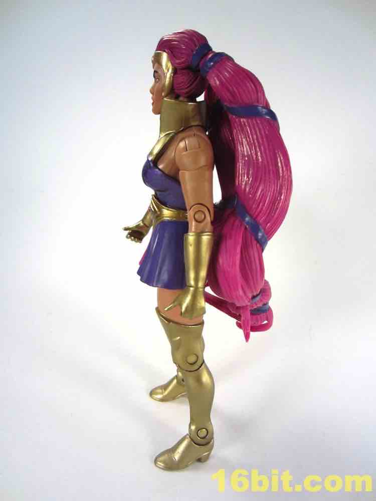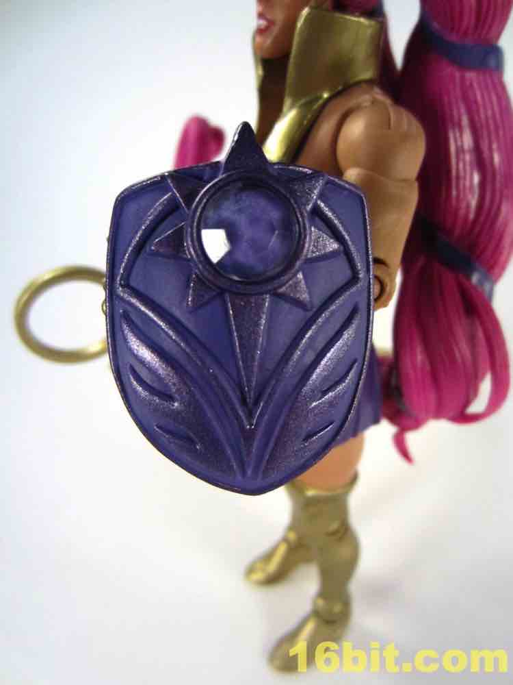 She's very purple, very pink, and a little gold - so "golden beauty" is a strange selling point. Her staff, while cool, doesn't hinder (or help) her standing up just fine and the shield is a tight fit on her arm. When I first saw the figure it didn't click that she was a bad guy - the coloring looks fairly heroic and consistent with the other Great Rebellion figures, but you'll note that her torso has a little Horde symbol in there. It's very similar to the one on Cas.shtmlella down to the raised collar and lightning bolts, but a new belt helps set it apart. Its two-toned split personality and her big twin tails remind me of a mix of Harley Quinn and some sort of viking warrior, but she looks pretty good as is.