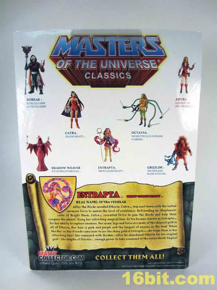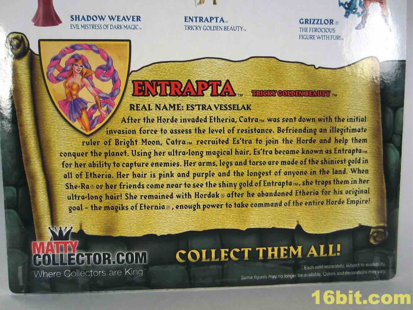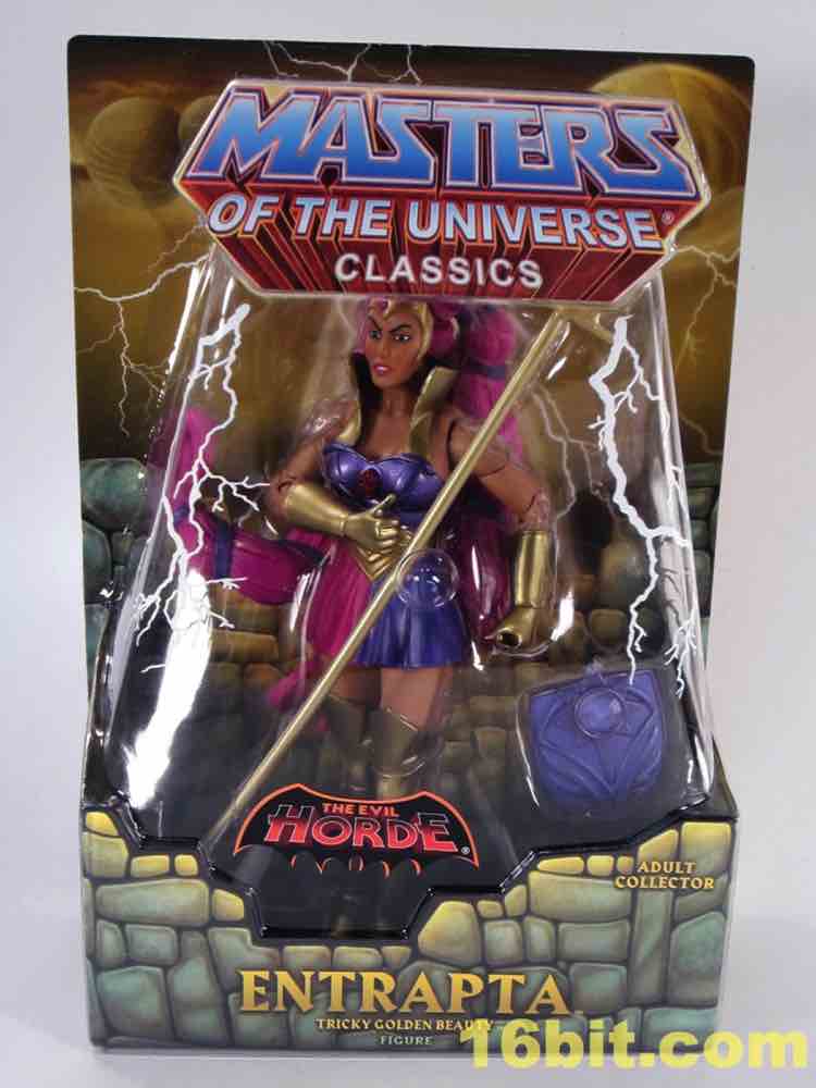 I don't know a lot about Princess of Power beyond what I saw in old magazine ads and reruns on Ion a few years ago. Their proliferation in Masters of the Universe Classics give me neat 1980s-style lady figures of exceptional quality, but I don't have the emotional attachment to Entrapta that I do, say, Madame Razz or Kowl or even Sea Hawk. She looks like a lot of other recent figures, which makes her fun given that the original doll on which she was based hit in 1988. Giant, heavy, articulated whirls of hair extend from her head and effectively force her neck joint to a specific place. While I expected her to tip over or be too back heavy, she took to a flat surface immediately without toppling over. I don't have this kind of luck with toys, so huzzah and kudos to Mattel for doing a bang-up job engineering what I assumed would be a figure that would spend a lot of time on her back. (Because of her hair.)