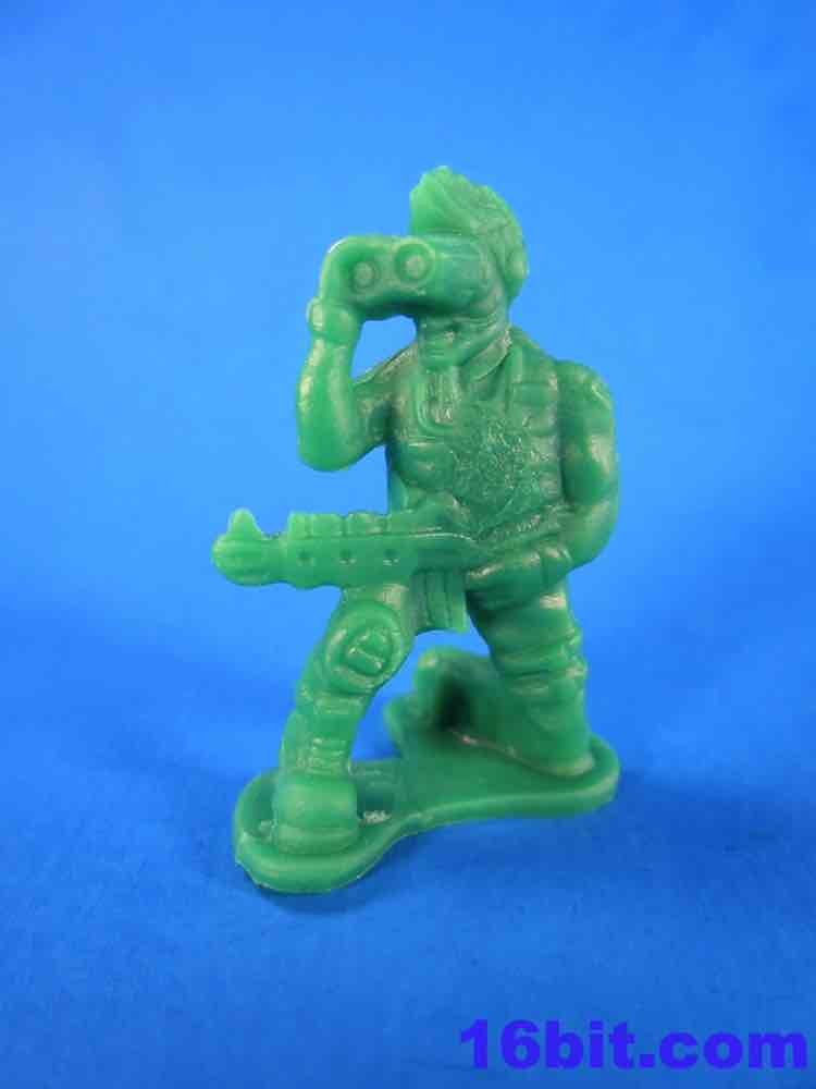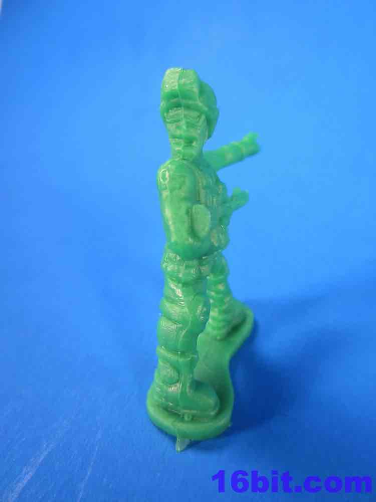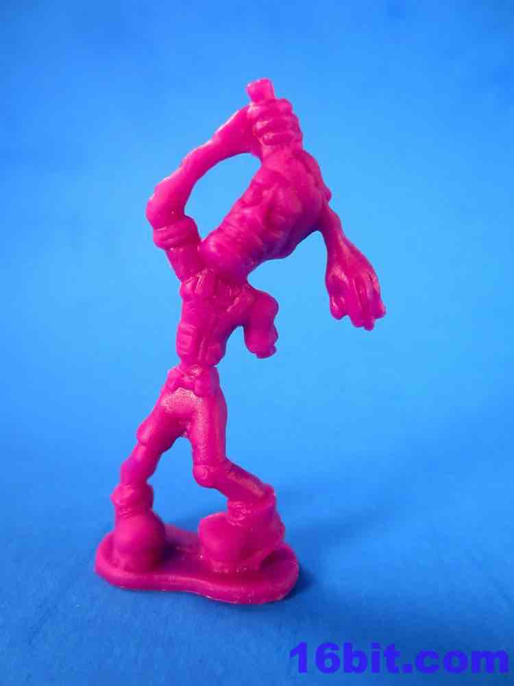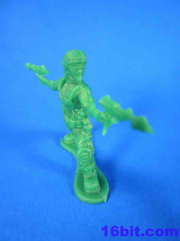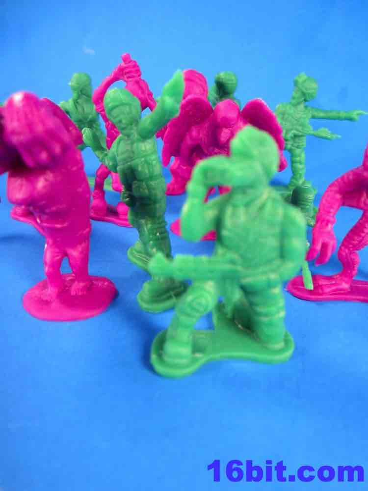 The Army Men have a lot of spirit, but they're kind of crappy. You get some great homages to previous Military man toys - a guy throwing a grenade, a sniper - but you also get a funky guy with a vest, no shirt, and two ray guns. The figures aren't bad in concept as they seem modern with lots of padding and armor. The overall look from a distance is great - but if you get up close, you'll see the seams are down the middle of their faces leaving messed-up goggles, noses, and mouths. Because of this, some look sort of like a cyclops or otherwise inhuman - if you can't see the faces, though, the poses are actually pretty great. A kneeling guy with a gun and binoculars is a nice touch, and the overall collection is quite varied. The sculpting is quite soft - to make cheaper figures, I assume this is intentional - and I'd say this is a pretty decent figure for about five cents. It ain't great, but if it didn't have the monsters I'd say pass on it.