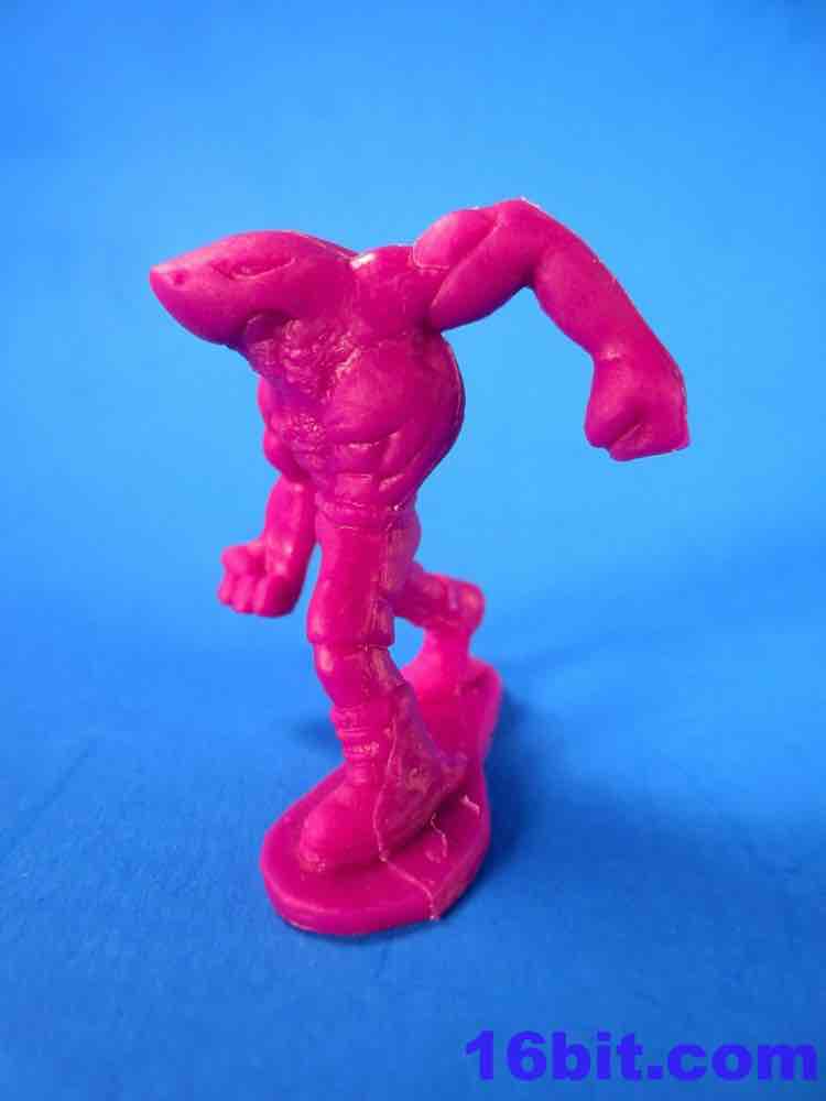 A one-eyed monster with long, bony fingers, a horrible jaw, and a head that looks like a villain from the first Final Fantasy game is a nice little ghoul. If you flip it over, you can see a bony spine and a tiny butt. His eye is freaky, gooey, and possibly bloodshot. I'm particularly impressed how they managed to give him a very narrow but stable neck by adding some extra plastic around the sides of the mouth, possibly resembling tissues of his body or even something as simple as drool. It's a striking, emmorable design - just like the last monster, a shark man. Another mutant, he has the body and head of a shark human legs, arms, and lower torso. His pose is dynamic, with swinging fists and muscular arms. He also has shoes and shorts, which seems to make him a former, unlucky beach goer of some sort. The poor fool. Of all the figures, this one seems to have the most difficulty standing.