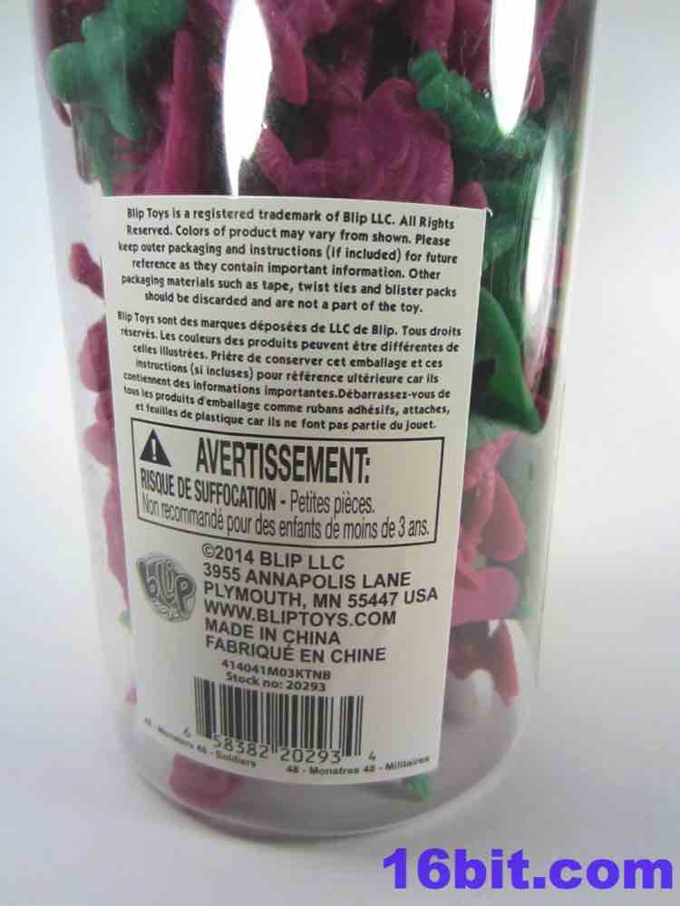 Item No.: No. 20293 Manufacturer:Blip Toys Includes:96 figures in a tube Action Feature:n/a Retail: est. $5.00 Availability:August 2014 Other: 6 green army men, 6 purple monster men