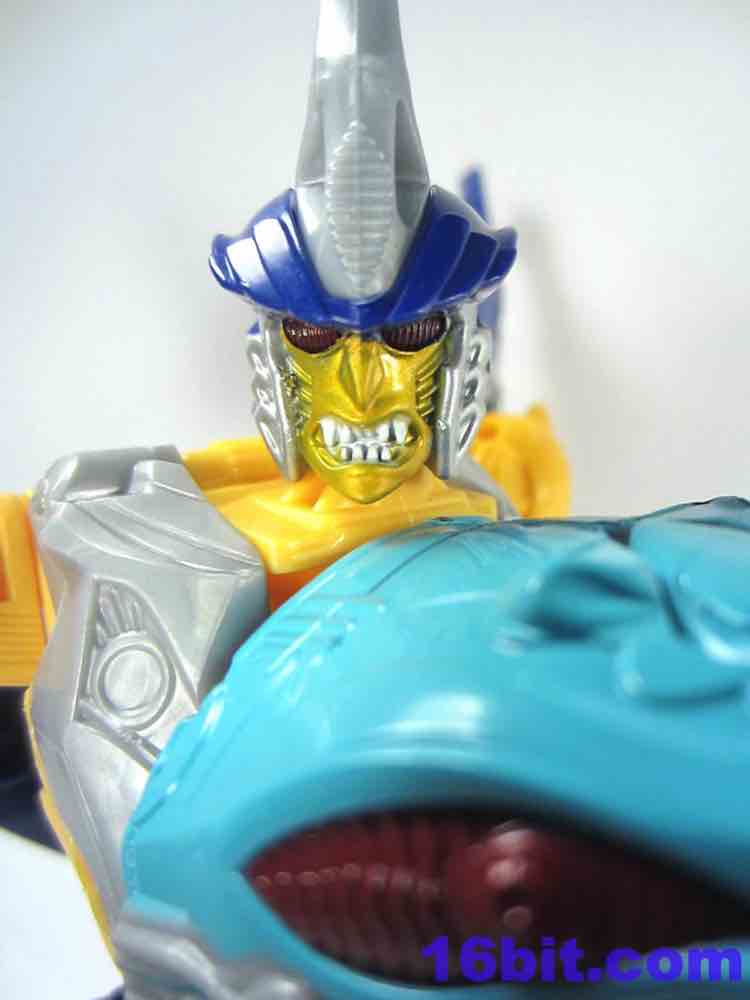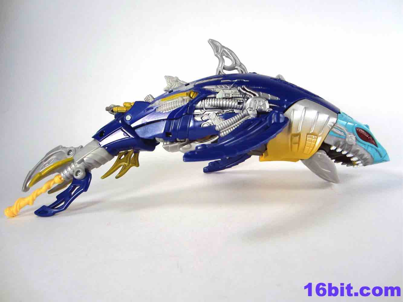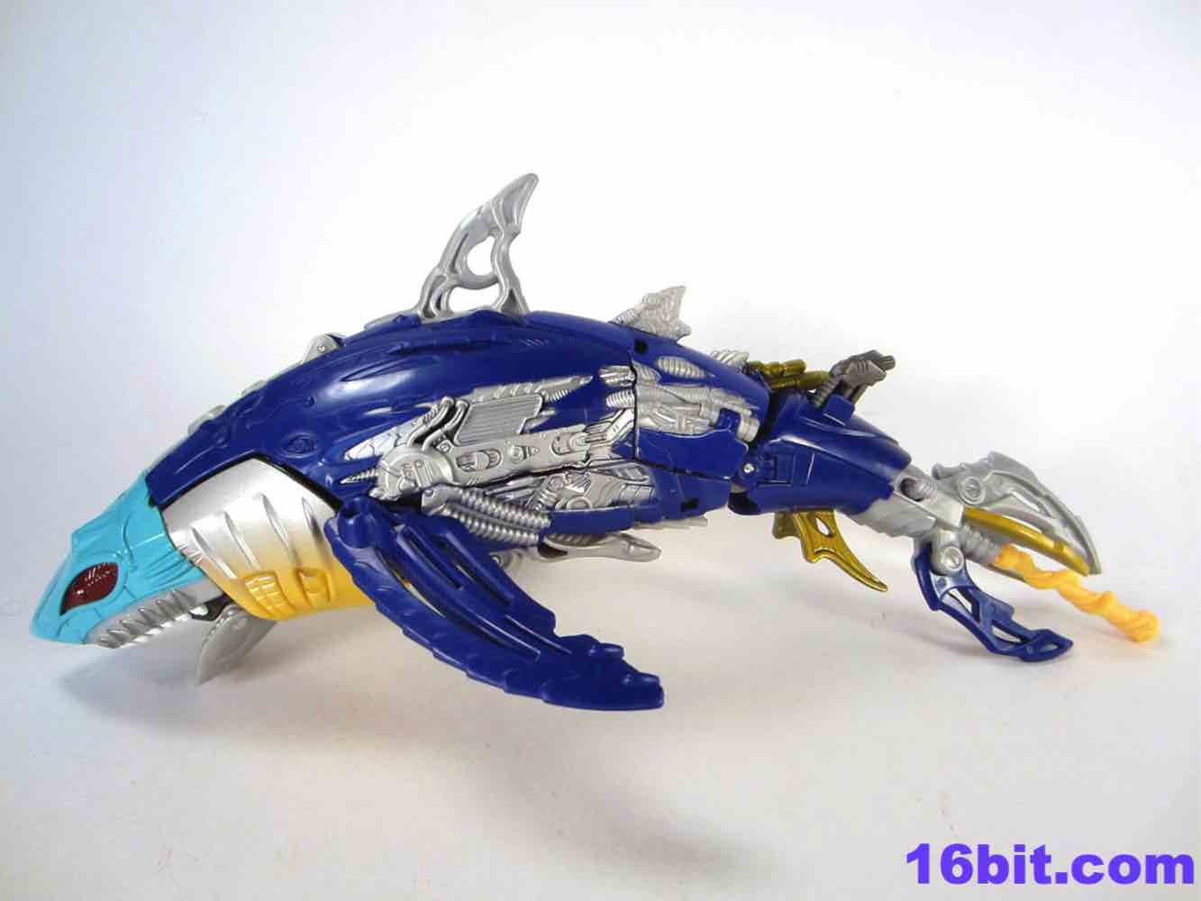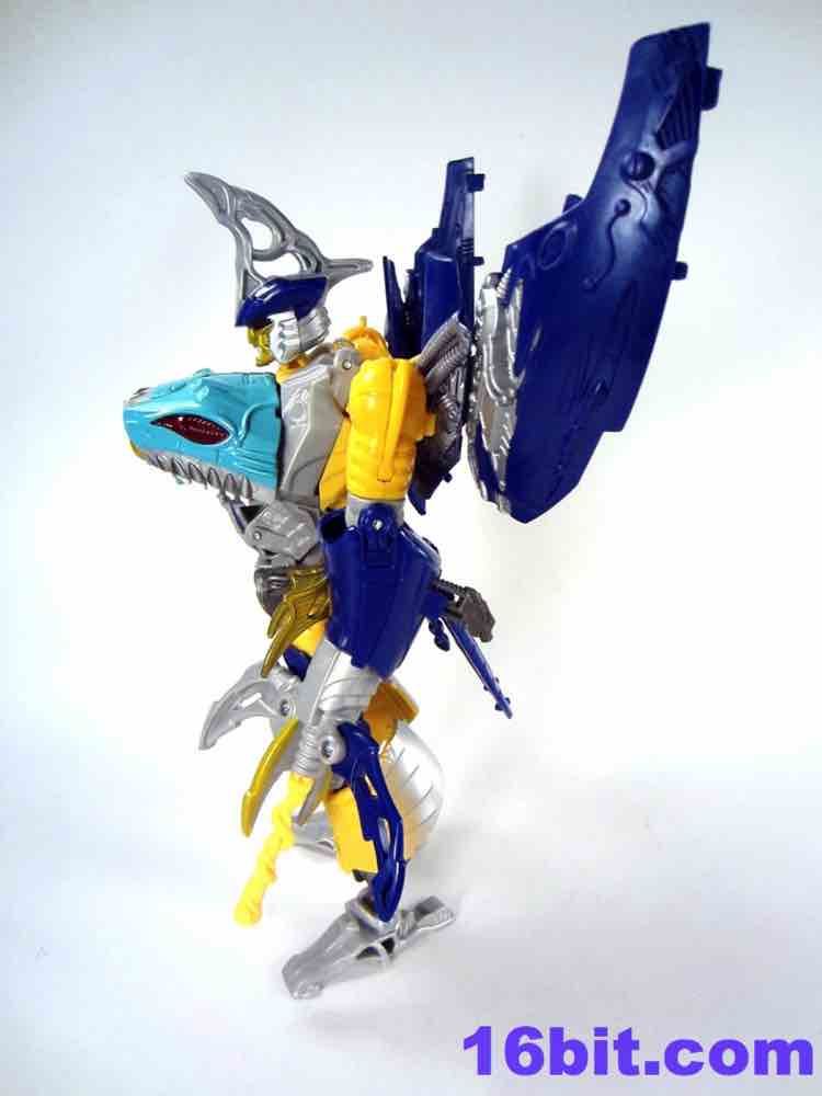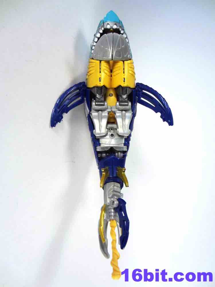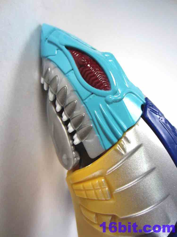 I won't say he's the greatest robot in town, but he's certainly a fun shark bot. The legs seem to move together when you move them at the hips, so be careful - but the knees and ankles also move to give him a chance to go through some cool poses. The joints are tighter than some of his shark ancestors, which is a plus for posing him. The giant shark wings are still here and weird, plus there are shark fins hanging off his waist. The original mold had them as removable weapons, which can fit into his hand. It's a neat change overall, and his mouth is pretty vicious with big, white teeth.