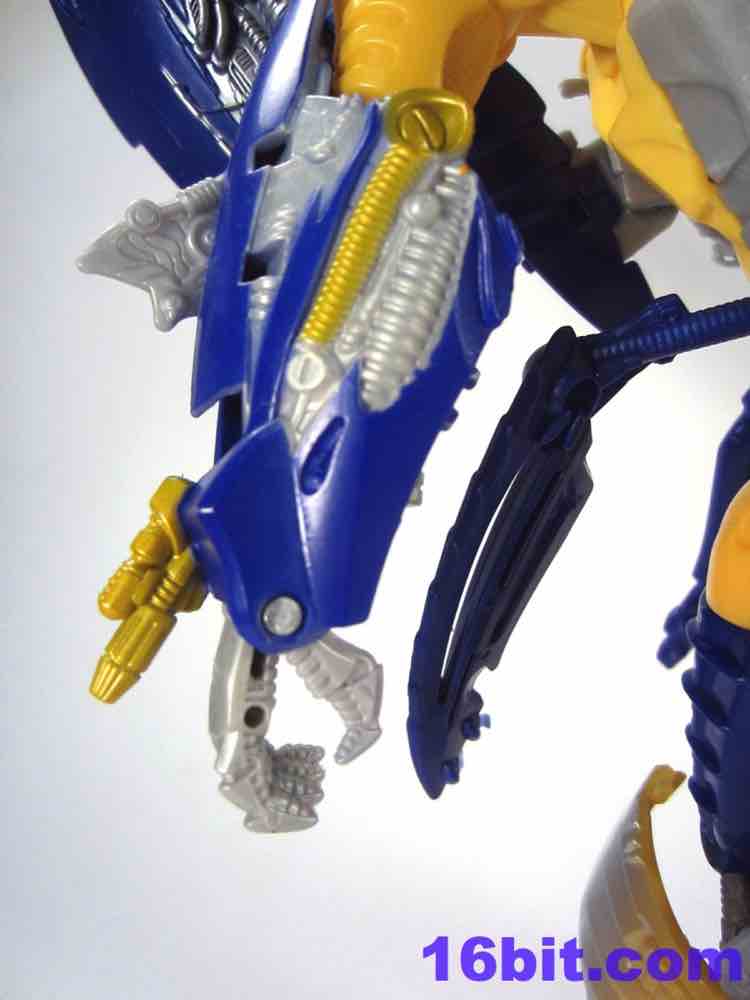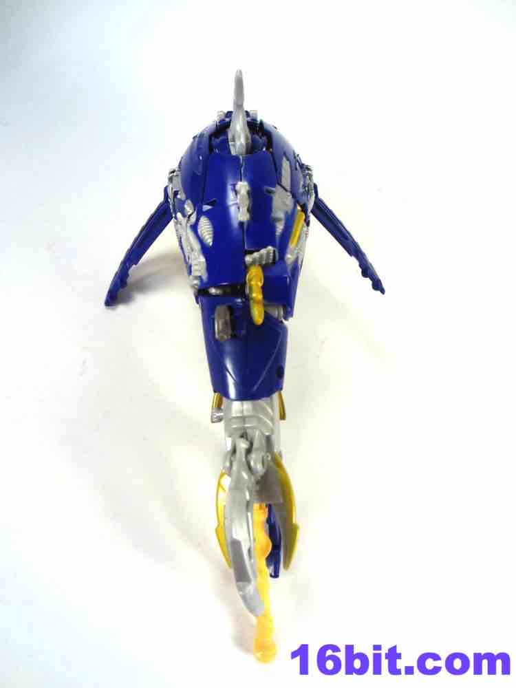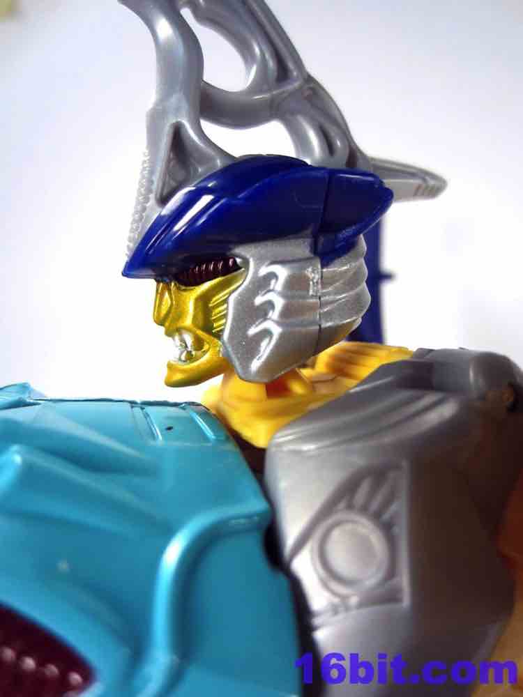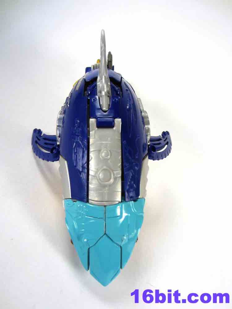 I bought - more like ran out and bought - the original TransMetals 2 Cybershark back when it first hit, and remember it as one of the first Beast Wars toys with Hasbro (and not Kenner) on the box. It was a big, bulky toy with lots of gimmicks and articulation, plus annoying shell wings made up of shark bits. Overall, it was neat - but it didn't get a lot of action. The BotCon toy was based on the simpler Energon Sharkticon - a fine and simple toy - so I quite liked it. This new Generations model is much larger at 7-inches tall (not counting his head fin) with about 19 joints, depending on how you feel like counting them. Gone is the separate rocket launcher - it's now integrated into his tail/left hand. The tail has two pointed and articulated elements, which gives him a little more personality. Heck, even his shoulders have little fins which can pop out - a nice touch, but ultimately something of a head-scratcher as they don't add much to his look or his functionality.