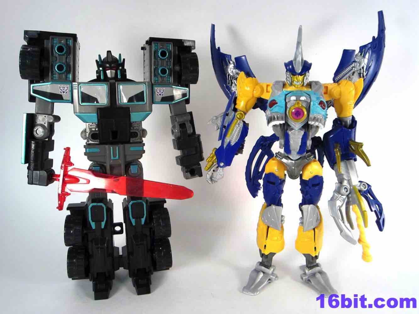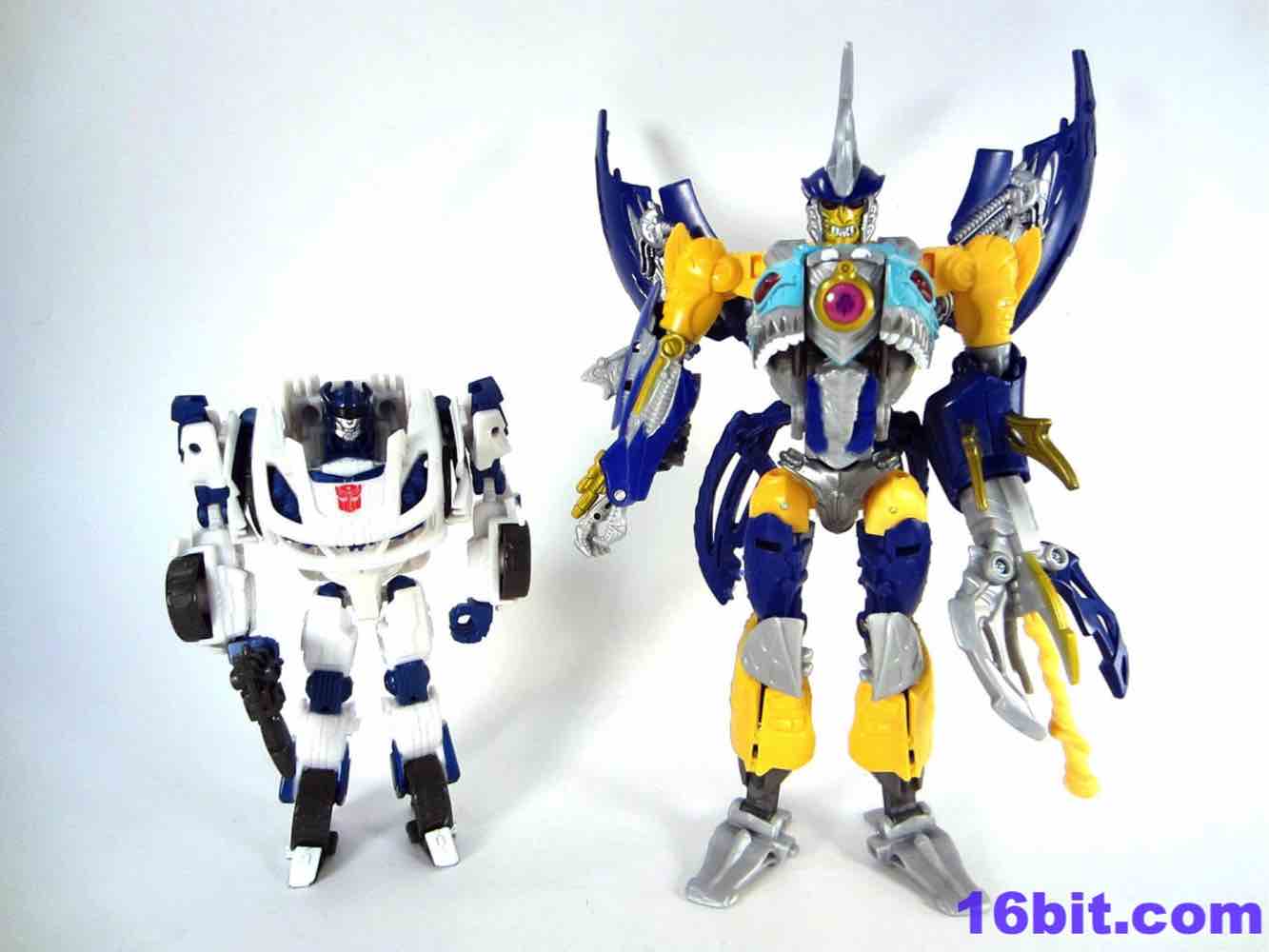The redesigned robot is much taller than most other figures, including his in-comic pal Jazz. Voyagers are far and few between this year, so I'd almost rather the toy be shorter - but he ain't bad. There's a lot of sculpted detail with wires, cables, cords, and other greeblies bringing him to life. Reformatted from previous releases, the shark head now rests on his chest and the "spark crystal" - now just a pink circle with a Predacon symbol - is on a cool rotating segment on the nose.