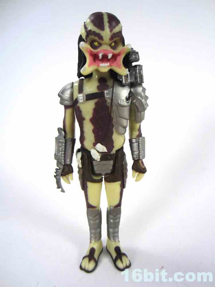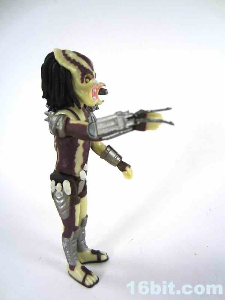 As many have mentioned, a 1987 movie done as a retro toy line would be more at home as a G.I. Joe-styled figure - plus it would give us an in for Billy, Dutch, Blaine, and the rest of the crew. Instead, you get a 1987 movie in a 1977 style - more or less - with a paint job that's a little more modern. The figure is molded in a yellow plastic with brown highlights, silver armor, and some pink, white, and yellow for the face. At a hair over 4-inches tall, he does tower over other figures slightly - which is exactly what you want here. I kind of wish he was more beefed up like Bigfoot, but hey, it's still pretty good. The detail is pretty light, with small skulls and the open fanged mandibles you know and love. The armor feels very lively thanks to the silver paint, and I would argue this makes it look better than a true retro figure. One of the tricky things to remember - and execute - is that those things kind of suck in spots. This one is largely pretty good. The head is big and expressive, but there's always the issue of "prior art." In the Predator's case, that prior art is the Alien which largely departed from many of the Kenner design cues of its day. The Alien is much larger, wider, and generally more fearsome - while the Predator is, proportionally, a tall guy in a mask, really. Beefing up his limbs, spreading his legs a bit, and giving him a weapon would have done him a lot of good - but let's take it for what it is, and what it is, is a fun little figure that is worth ten bucks.
