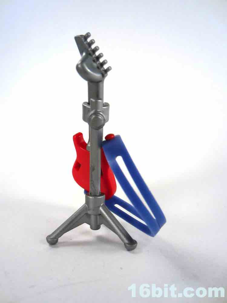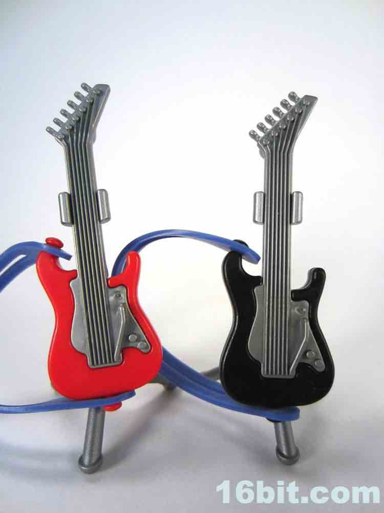 The two-piece guitars are sturdy and assemble in seconds. They fit in the stands nicely, or the figures can hold them with a semi-hidden grip on the flip side.