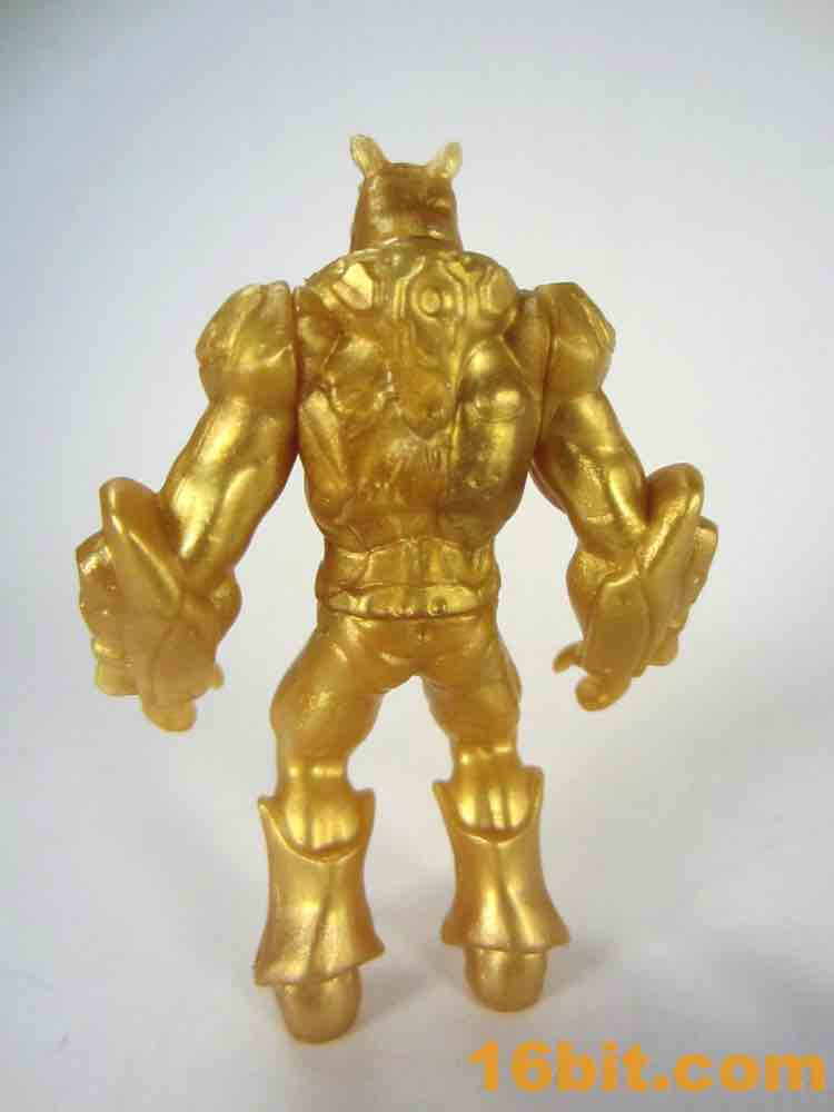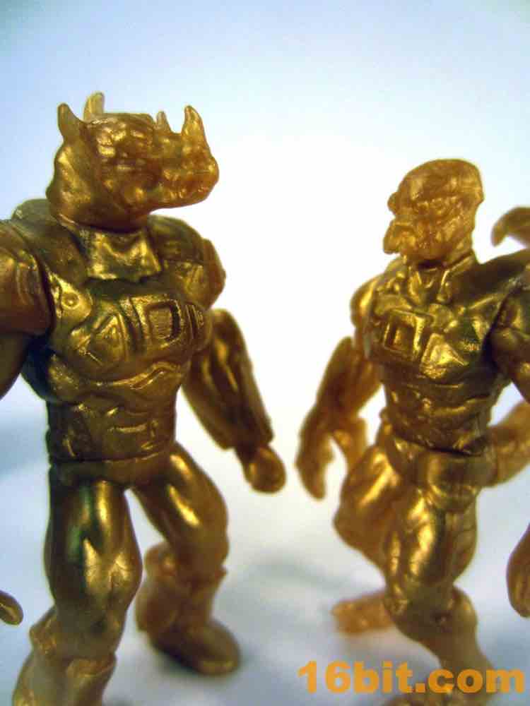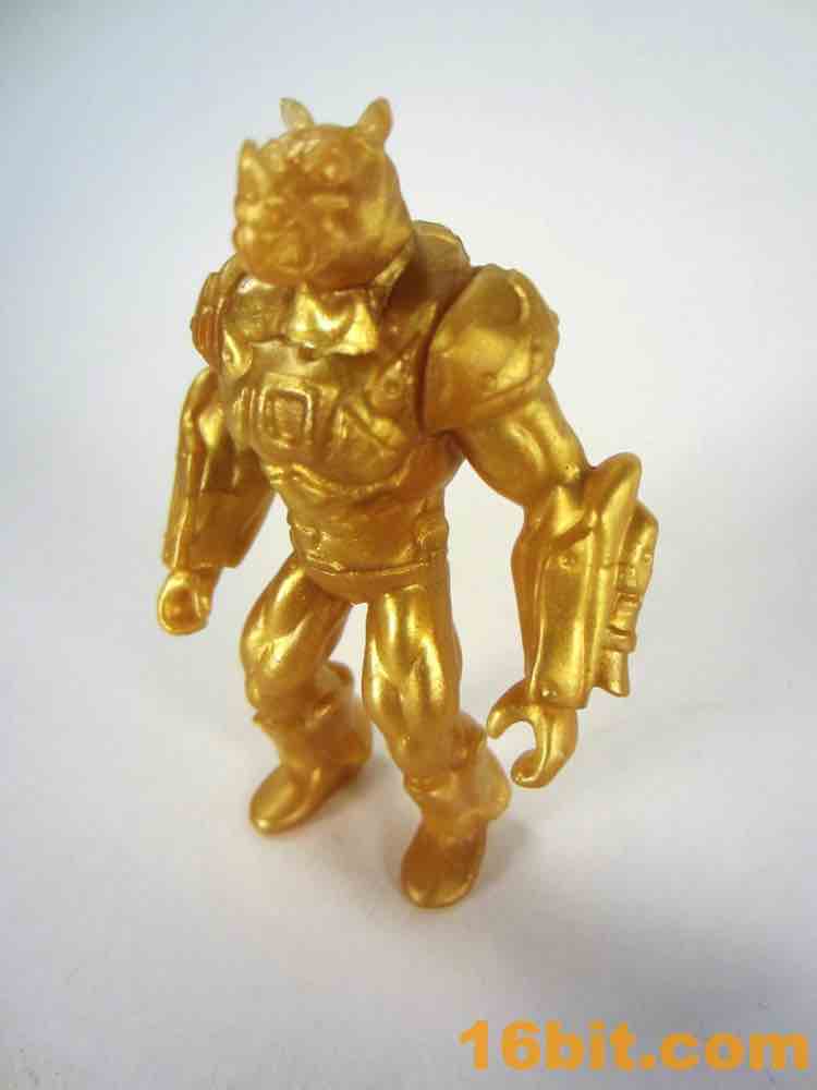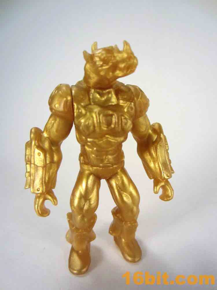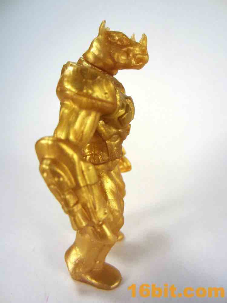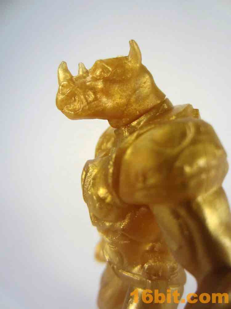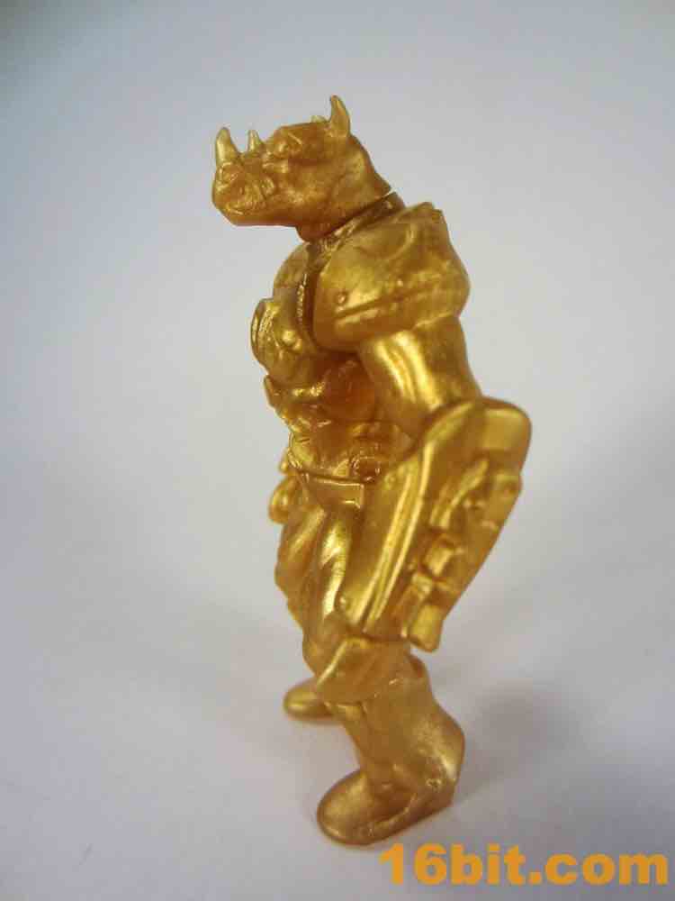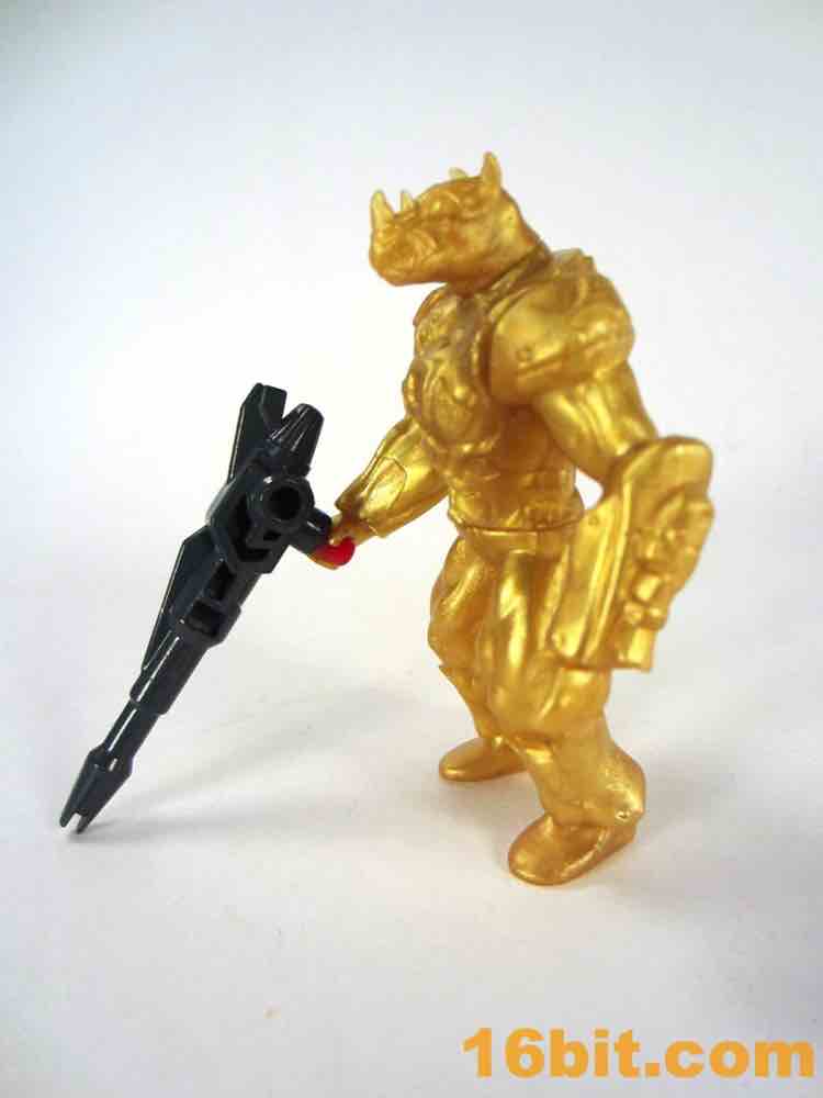 The other figure is a rhino, with 4 joints and an angry face. It's the steroid-enhanced sibling of Rocksteady you always wanted! A tiny head and huge arms makes him look like quite the bruiser, and these figures tend to look more ferocious and less cuddly than their inspiration. He's mean, let's say he's lean, and he has a face that says "I'm going to curb stomp you." Like with his counterpart, it's a little hard to make out some of the details in gold plastic, but they're there. The feet feel a tiny bit unfinished, but you get the mitten-like hands of the classic Battle Beasts as well as some swell wrist armor. Each one looks like it could be a gun or a flame thrower, with minor shades of Boba Fett.