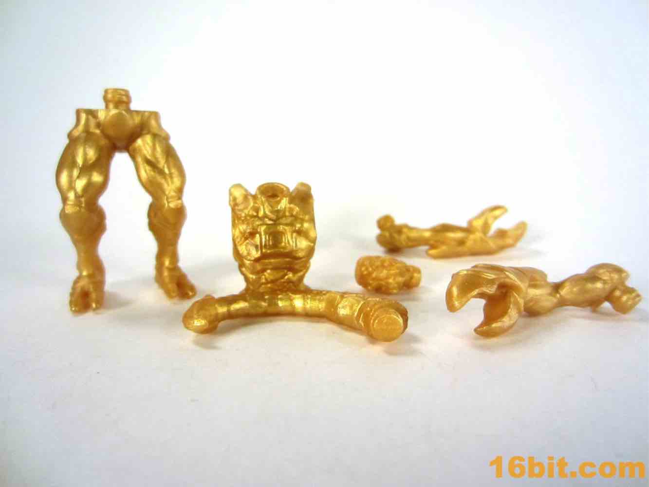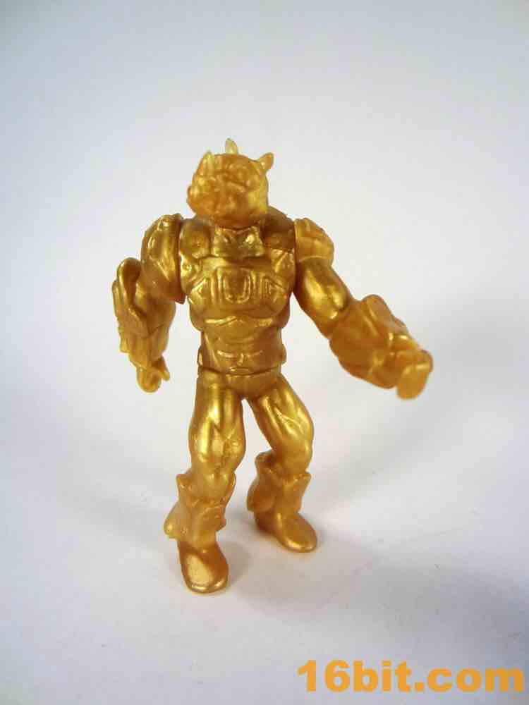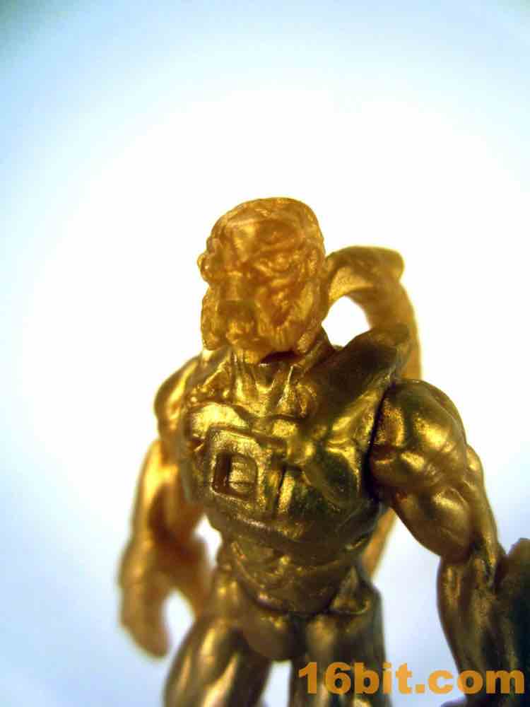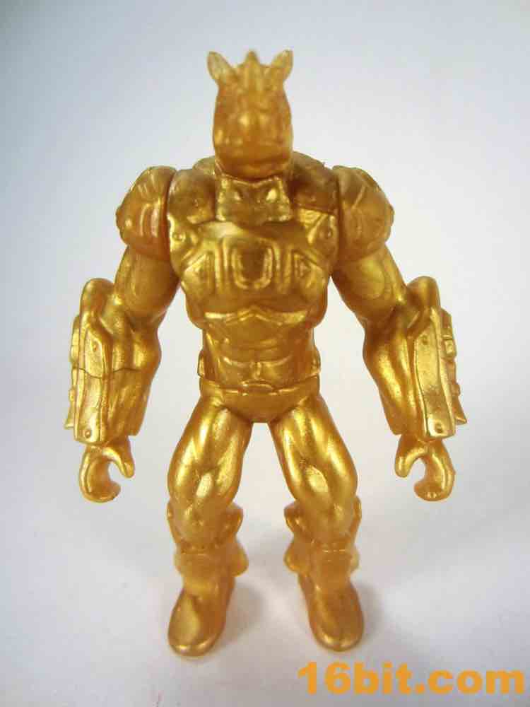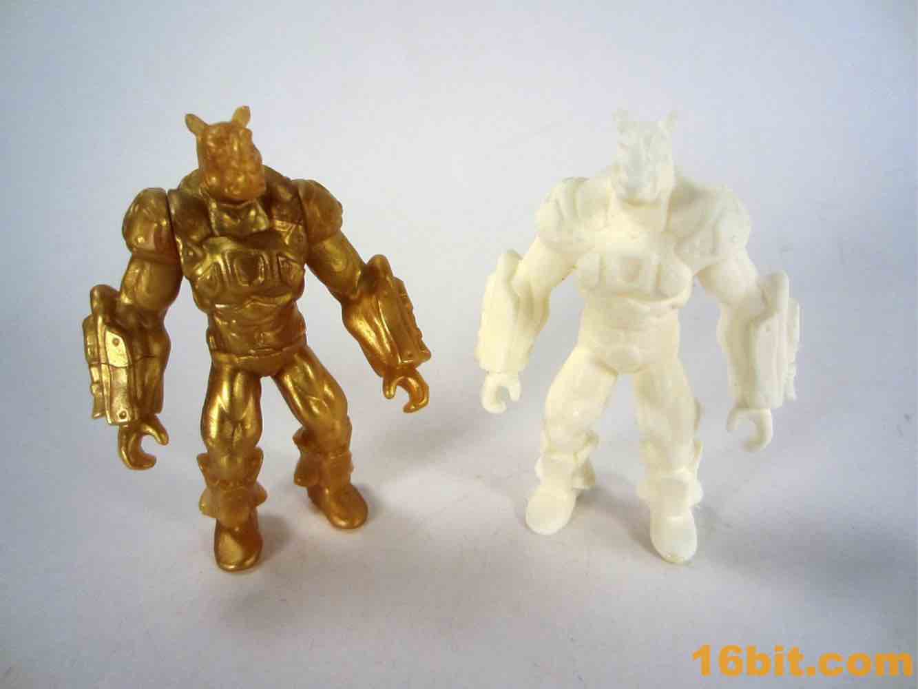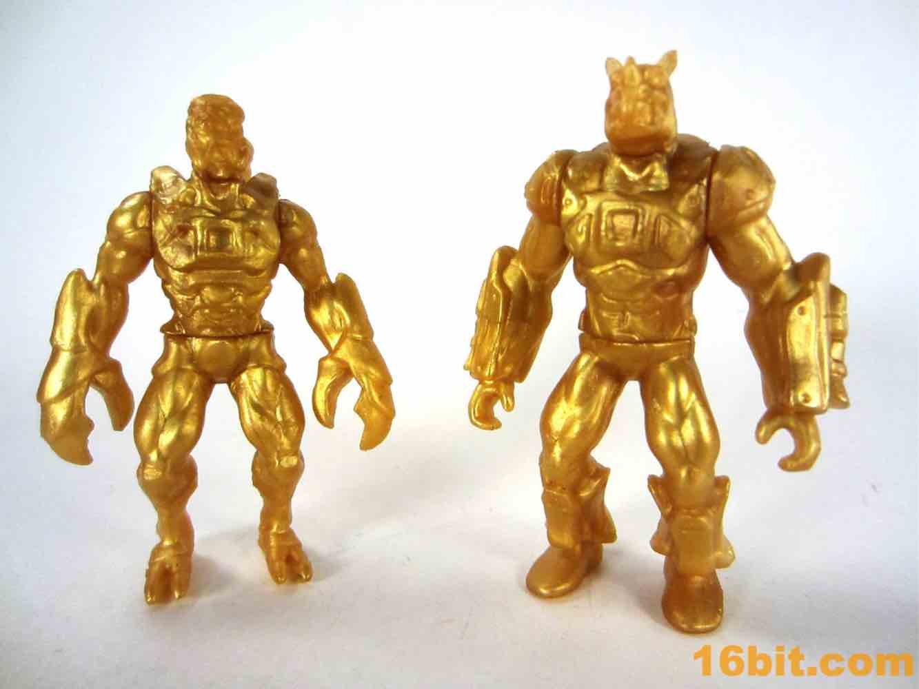 The other figure is a rhino, with 4 joints and an angry face. It's the steroid-enhanced sibling of Rocksteady you always wanted! A tiny head and huge arms makes him look like quite the bruiser, and these figures tend to look more ferocious and less cuddly than their inspiration. He's mean, let's say he's lean, and he has a face that says "I'm going to curb stomp you." Like with his counterpart, it's a little hard to make out some of the details in gold plastic, but they're there. The feet feel a tiny bit unfinished, but you get the mitten-like hands of the classic Battle Beasts as well as some swell wrist armor. Each one looks like it could be a gun or a flame thrower, with minor shades of Boba Fett.