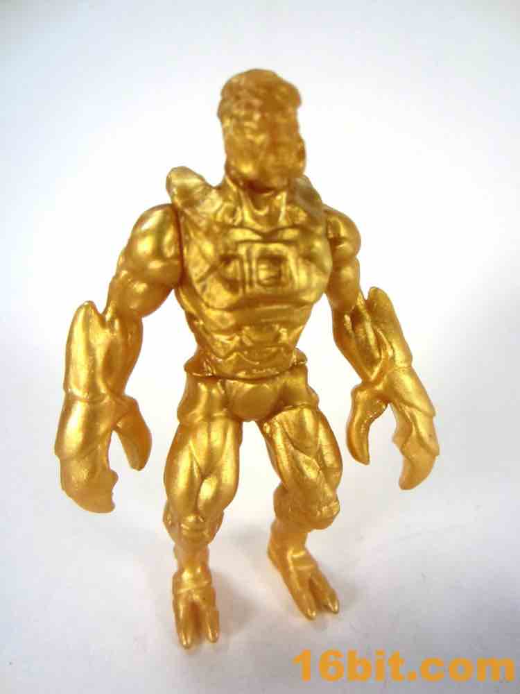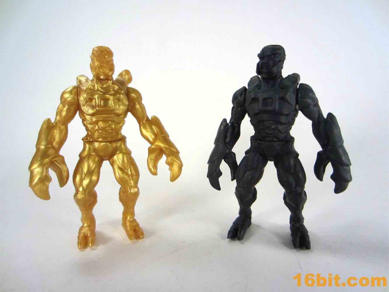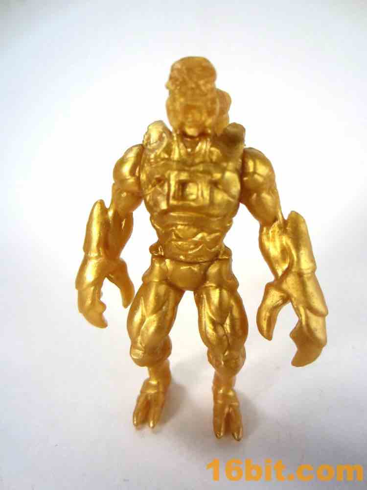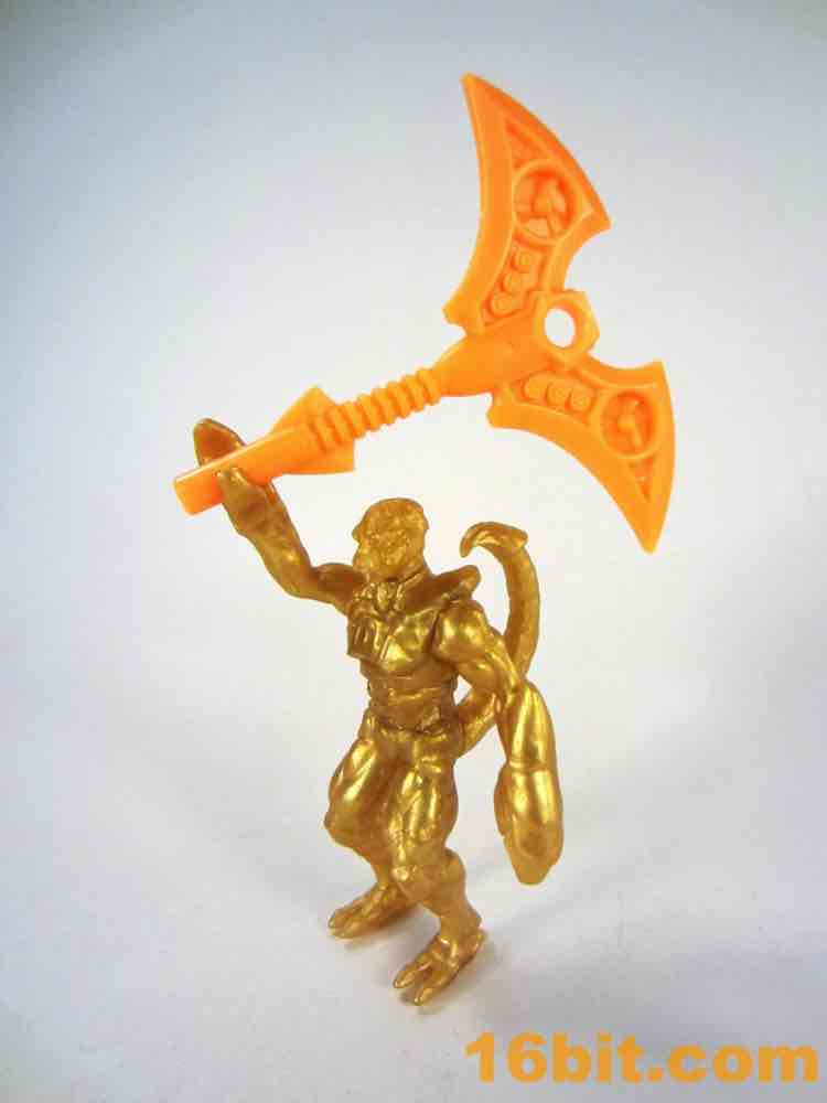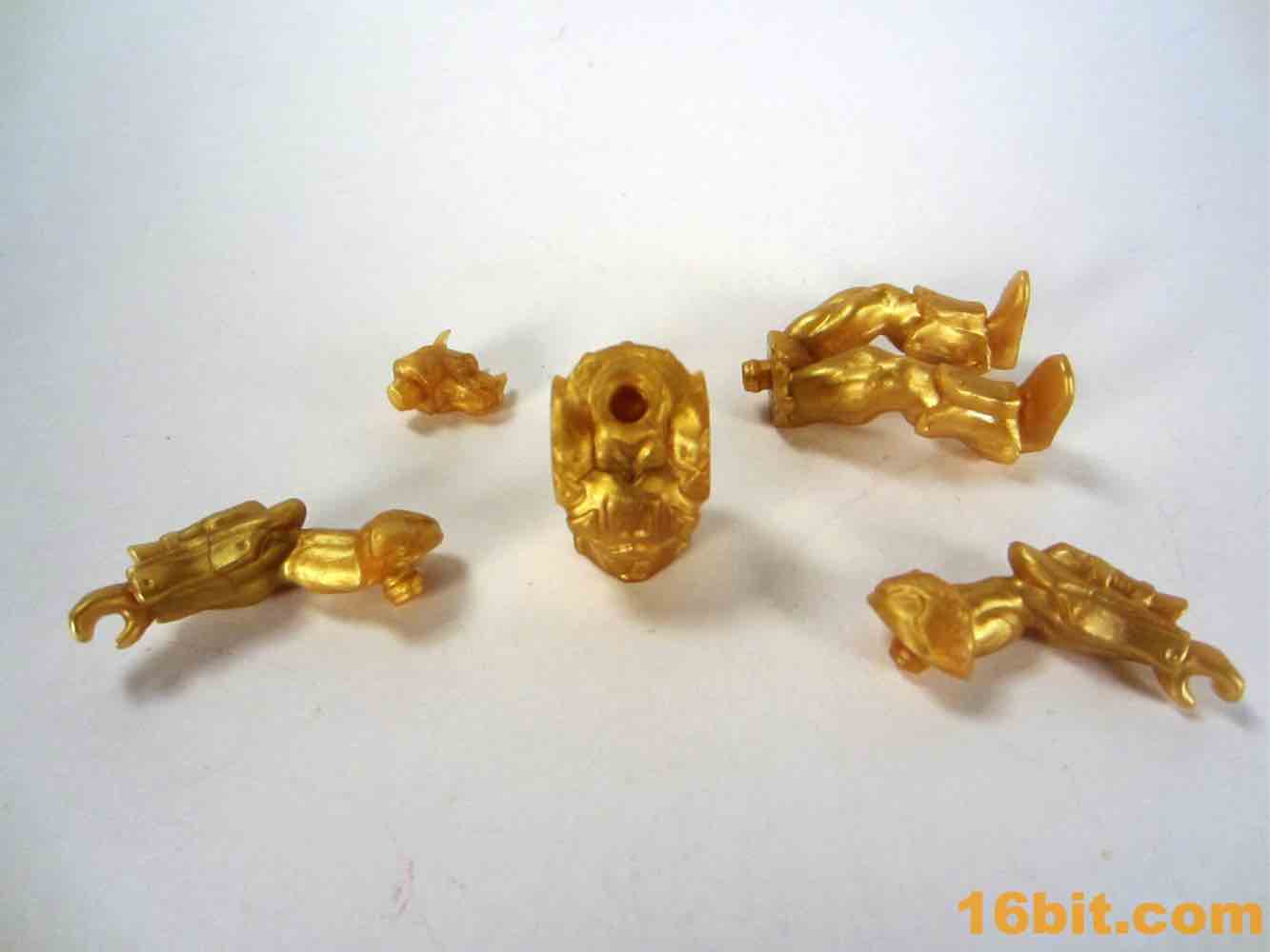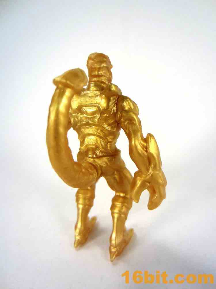 The other figure is a rhino, with 4 joints and an angry face. It's the steroid-enhanced sibling of Rocksteady you always wanted! A tiny head and huge arms makes him look like quite the bruiser, and these figures tend to look more ferocious and less cuddly than their inspiration. He's mean, let's say he's lean, and he has a face that says "I'm going to curb stomp you." Like with his counterpart, it's a little hard to make out some of the details in gold plastic, but they're there. The feet feel a tiny bit unfinished, but you get the mitten-like hands of the classic Battle Beasts as well as some swell wrist armor. Each one looks like it could be a gun or a flame thrower, with minor shades of Boba Fett.