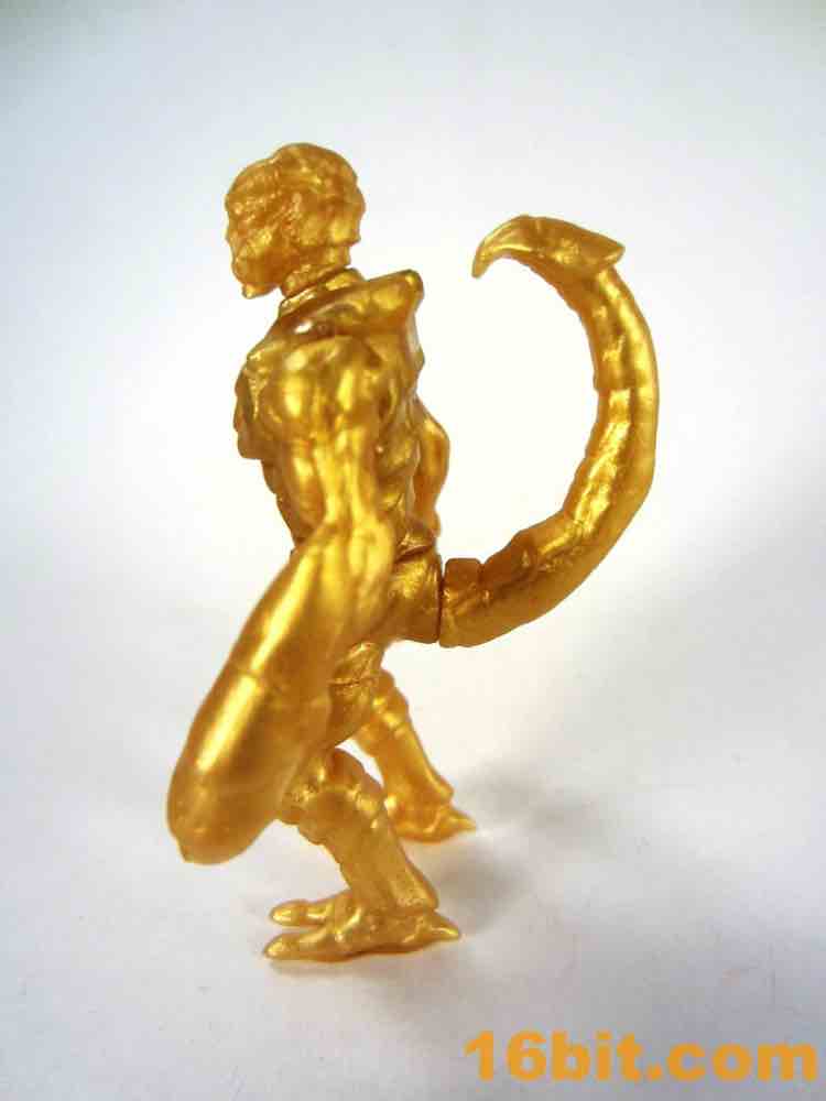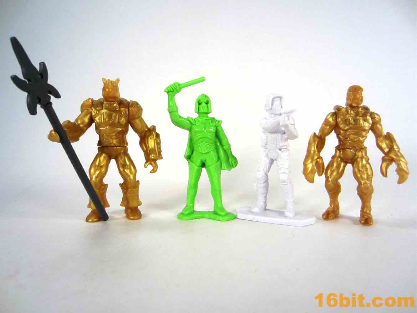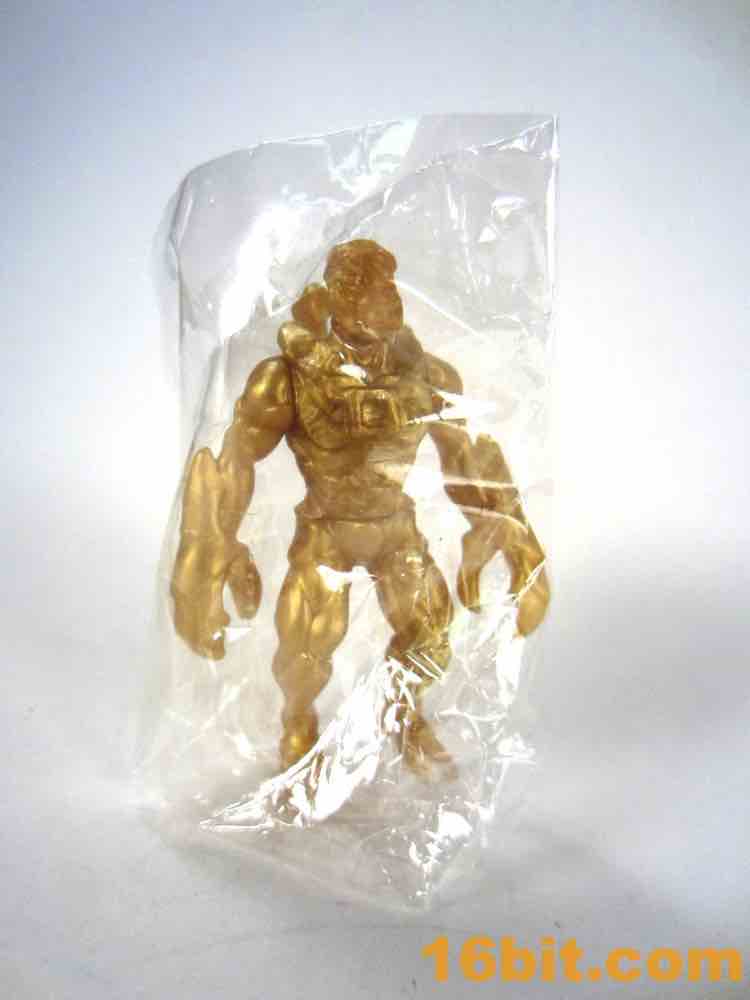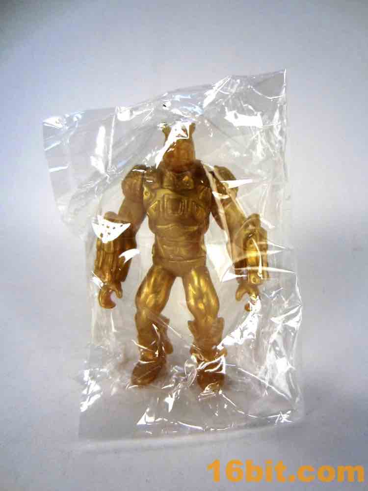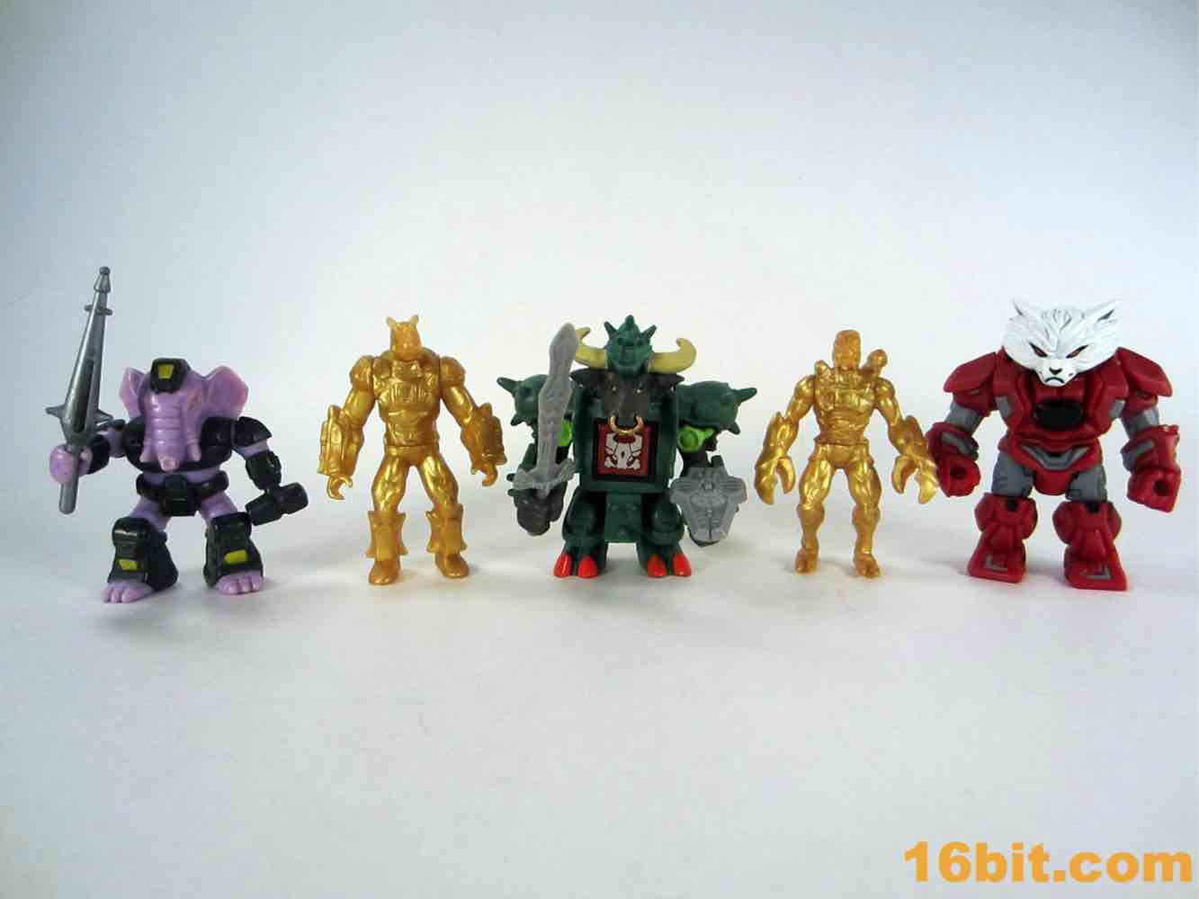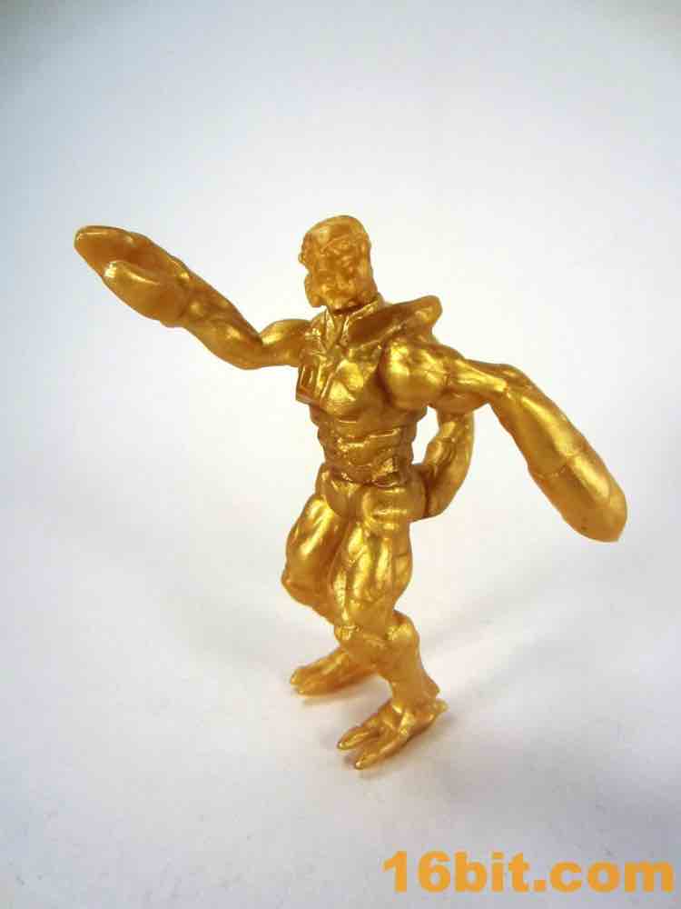 The other figure is a rhino, with 4 joints and an angry face. It's the steroid-enhanced sibling of Rocksteady you always wanted! A tiny head and huge arms makes him look like quite the bruiser, and these figures tend to look more ferocious and less cuddly than their inspiration. He's mean, let's say he's lean, and he has a face that says "I'm going to curb stomp you." Like with his counterpart, it's a little hard to make out some of the details in gold plastic, but they're there. The feet feel a tiny bit unfinished, but you get the mitten-like hands of the classic Battle Beasts as well as some swell wrist armor. Each one looks like it could be a gun or a flame thrower, with minor shades of Boba Fett.