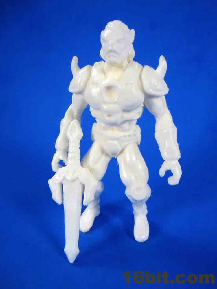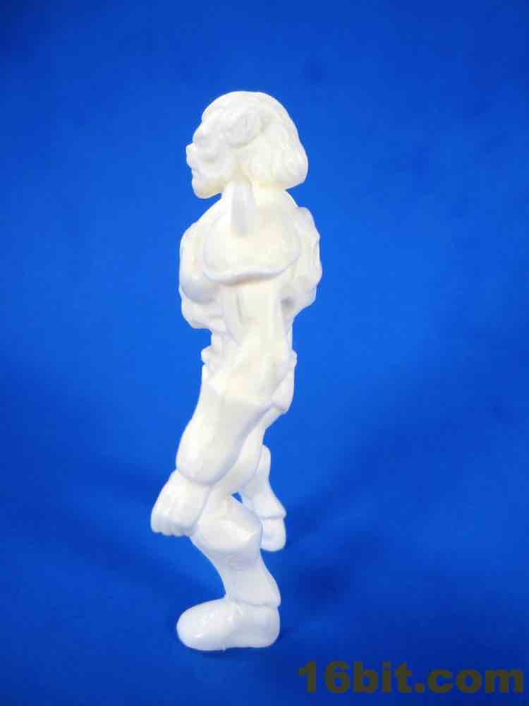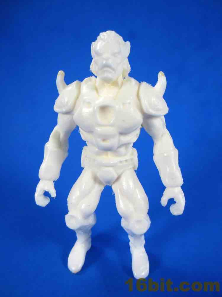 Due to the material of the white samples, the detail is light - but it's neat to see what might be should these get made. There are horns on the shoulders, and little rivets. The pose is undoubtedly similar to Masters of the Universe with bent knees and crazy leg muscles - I mean seriously, look at those thighs! You could kill someone with those. The face has a blunter snout than most beast figures and feels like it got a pinch of Michael Biehn in here. There's a shape in the chest that's similar to the sticker hole for Battle Beasts, its function unrevealed at this time.