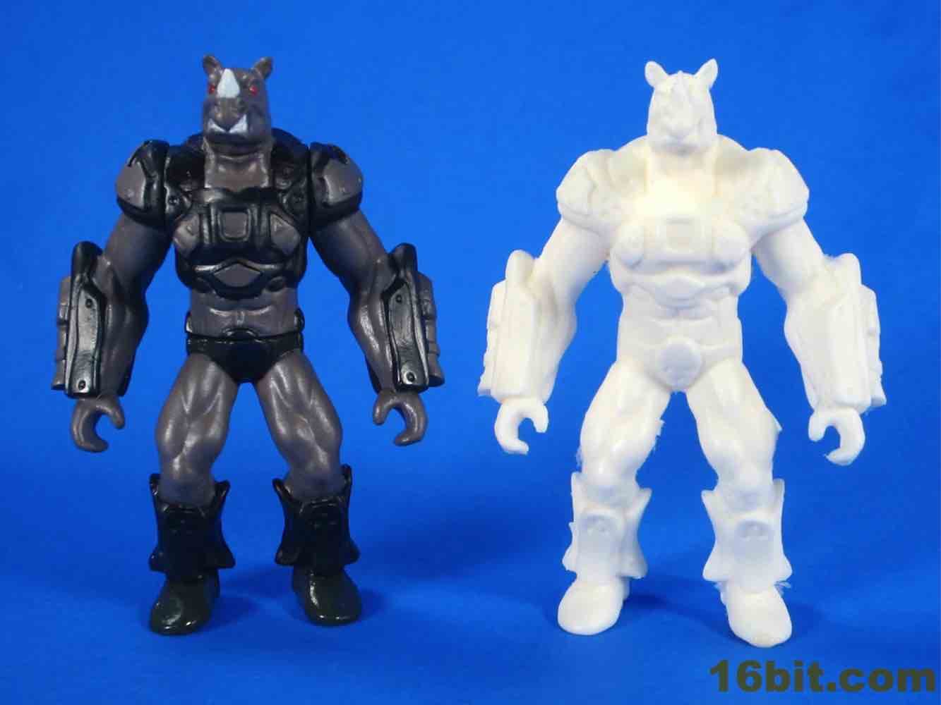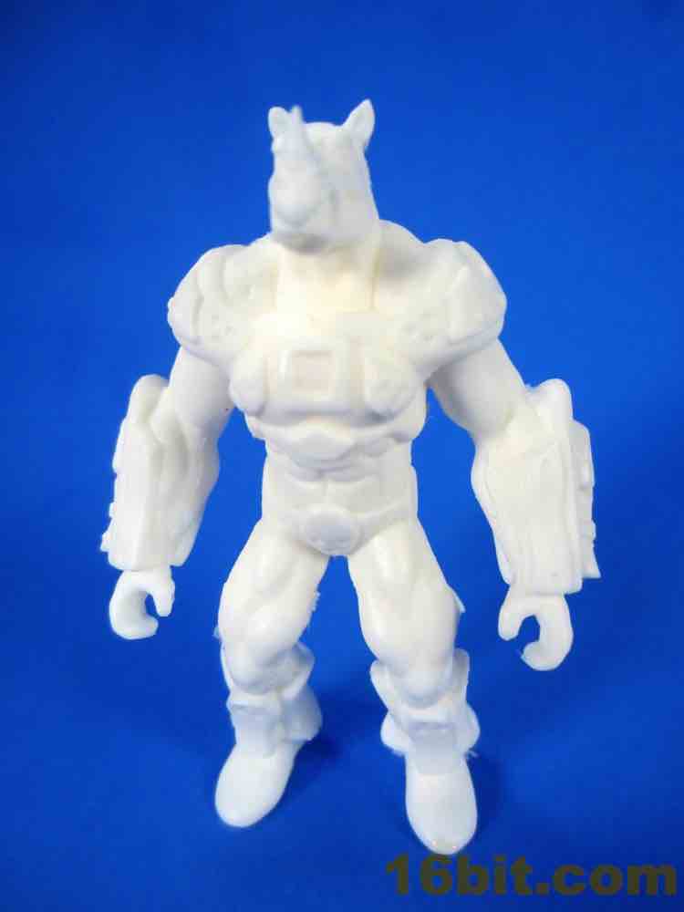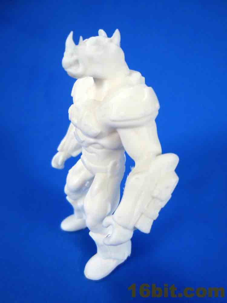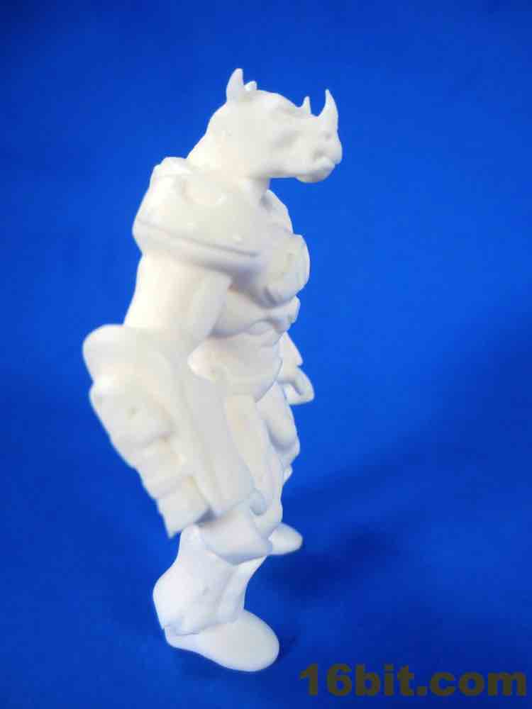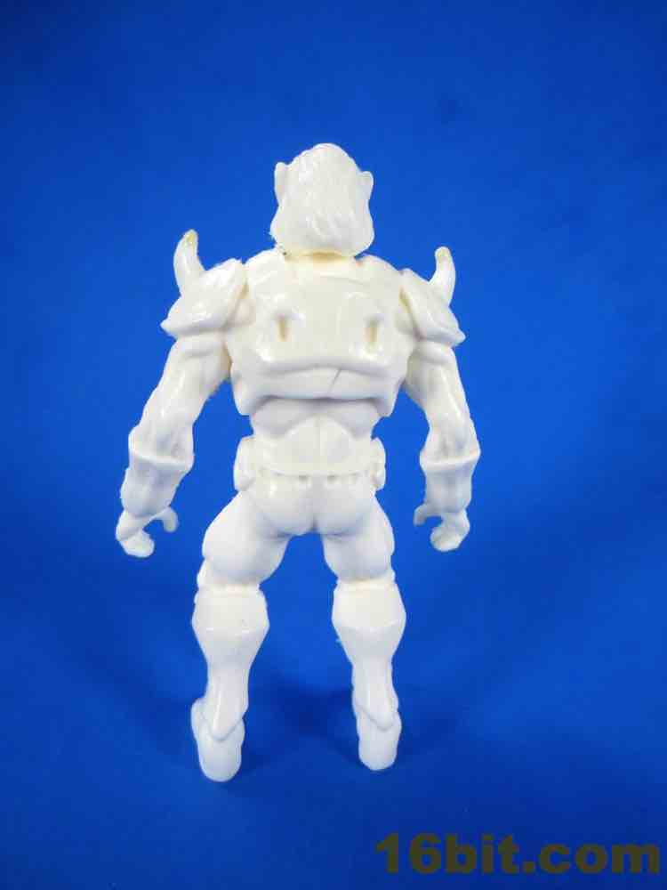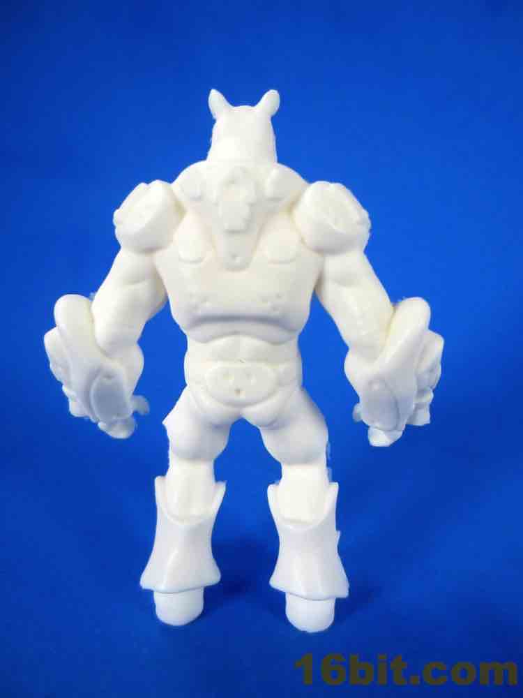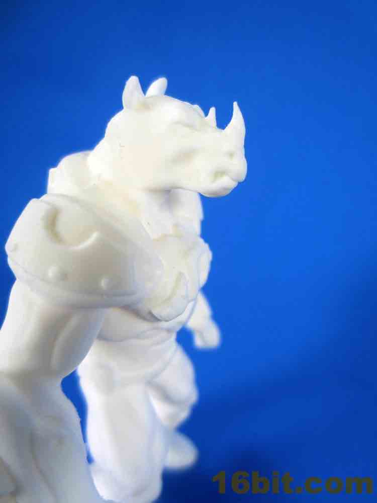 This early printing of the figure is solid - there's no articulation and the feet sit flat on the table. Due to the proportions it feels like a Rhino head has been transplanted on a barbarian body, and the cybernetic armor feels closer to original Battle Beasts than any of the other recent beast revival lines. Were the figures squat and shorter, they would probably be your future hands-down favorite instead of merely being pretty good. The horns on the nose are so pointy that, as I examine this prototype, I can't imagine them being replicated for a mass-produced figure. I've seen a lot of prototypes up close in my day, but the level of sharp detailing here is unusually impressive.