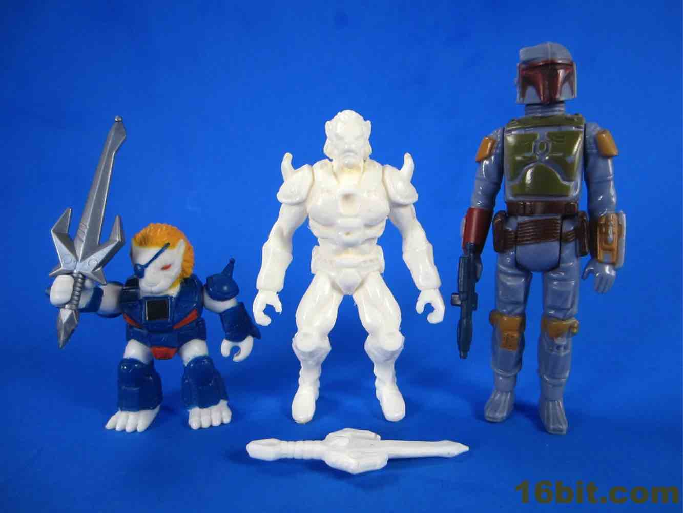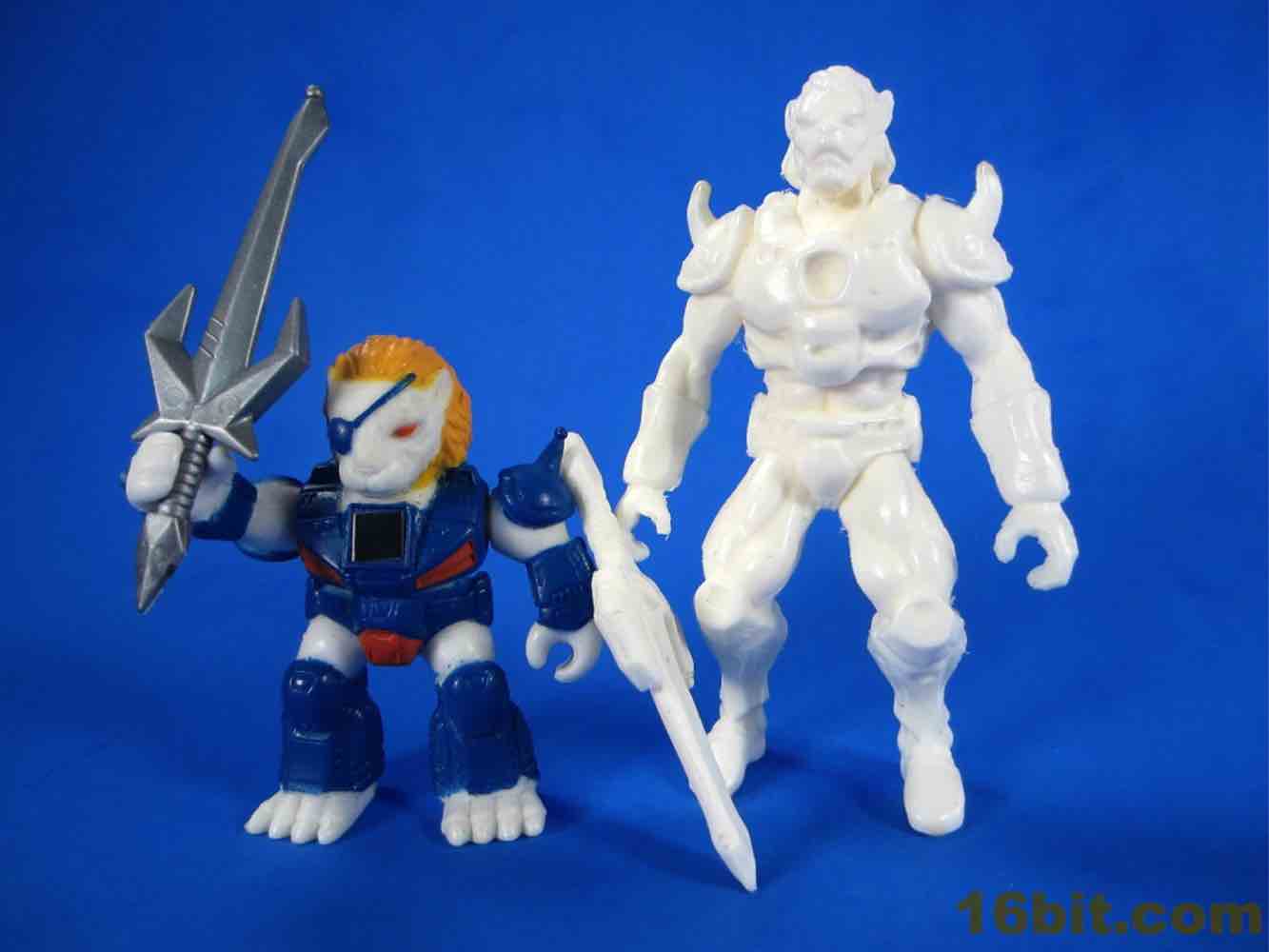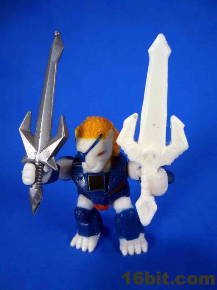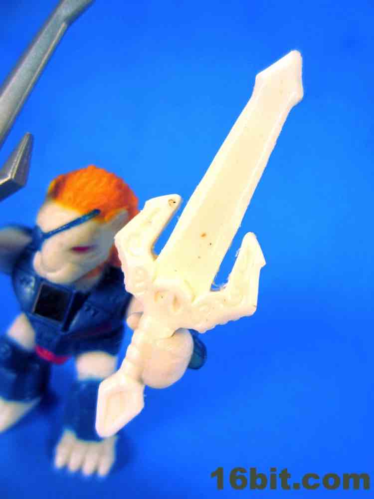 The Lion had the most interesting back story. It's loosely based on the "Pirate Lion" figure, giving us the basic look and feel (and eyepatch, and armor) of that classic figure in a totally different style. The larger 3-inch size makes it a bit of an odd duck - it's too big for the mini-figures, it's too short for 3 3/4-inch, and stylistically it doesn't gel with Glyos or Imaginext. At one point, the Rise of the Beast line (or at least one figure) was going to be made in this larger size due to what the factory claimed they could (or would) do - apparently some factories have an aversion to small toys. Due to the hard white material, there's not enough "give" in the plastic to hold the weapon - I don't want it to break, I want it to stay in good shape, so I can't photograph the weapon in his hand.