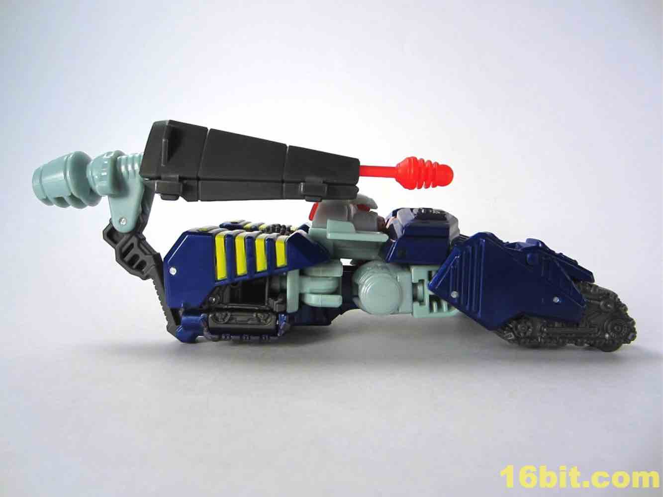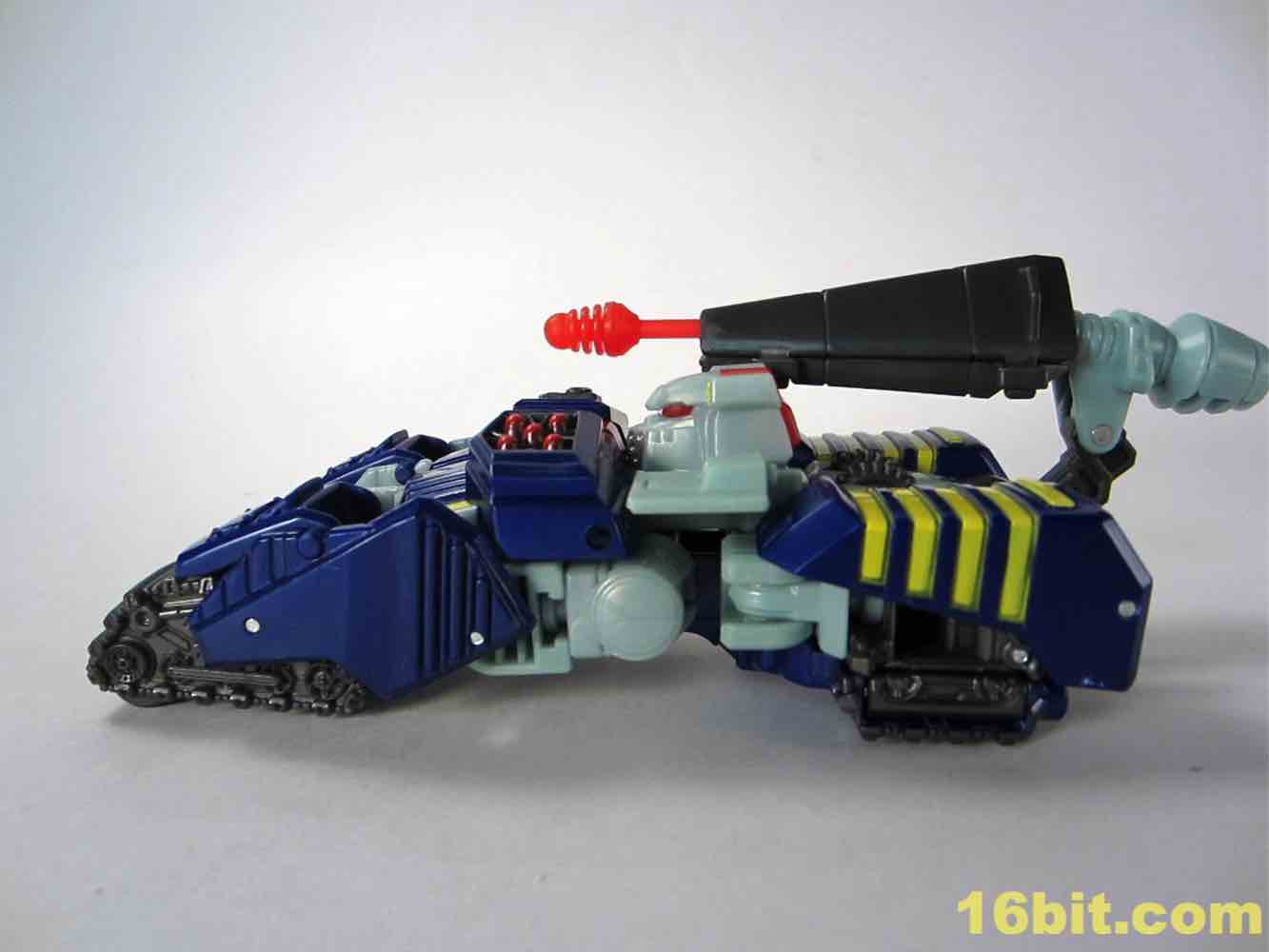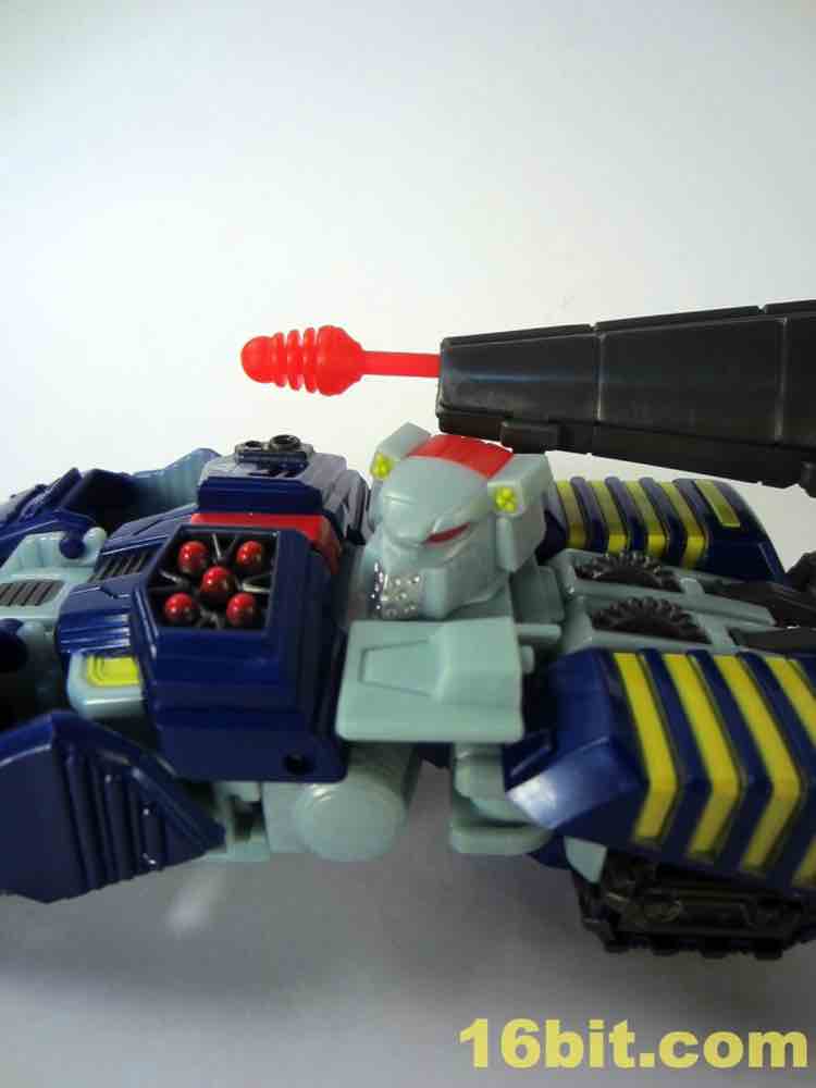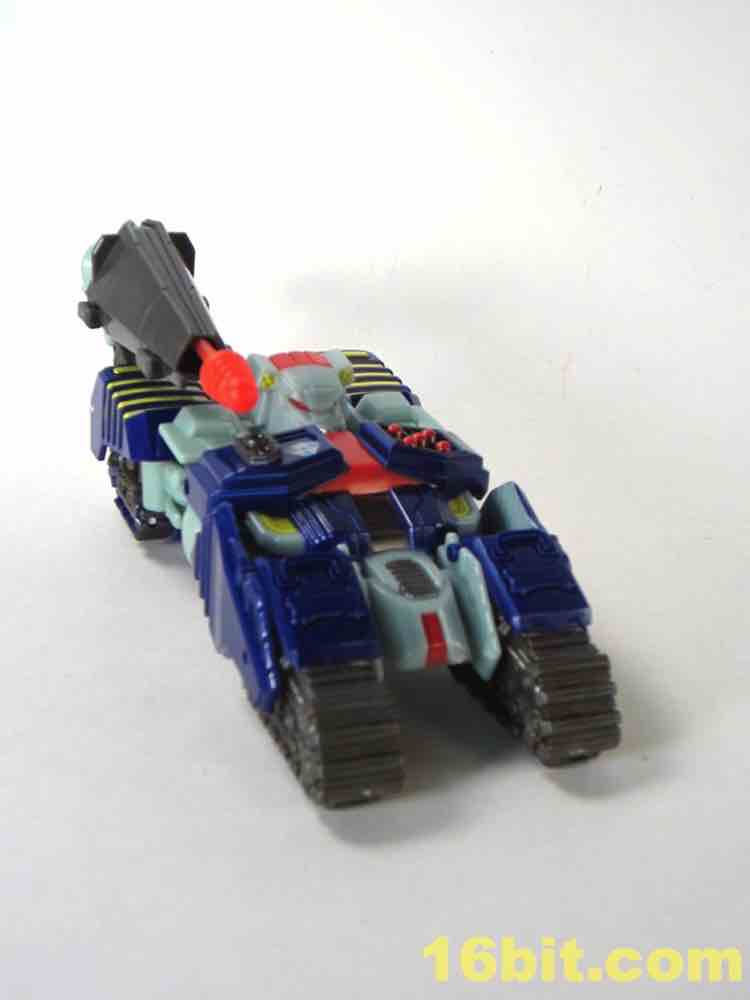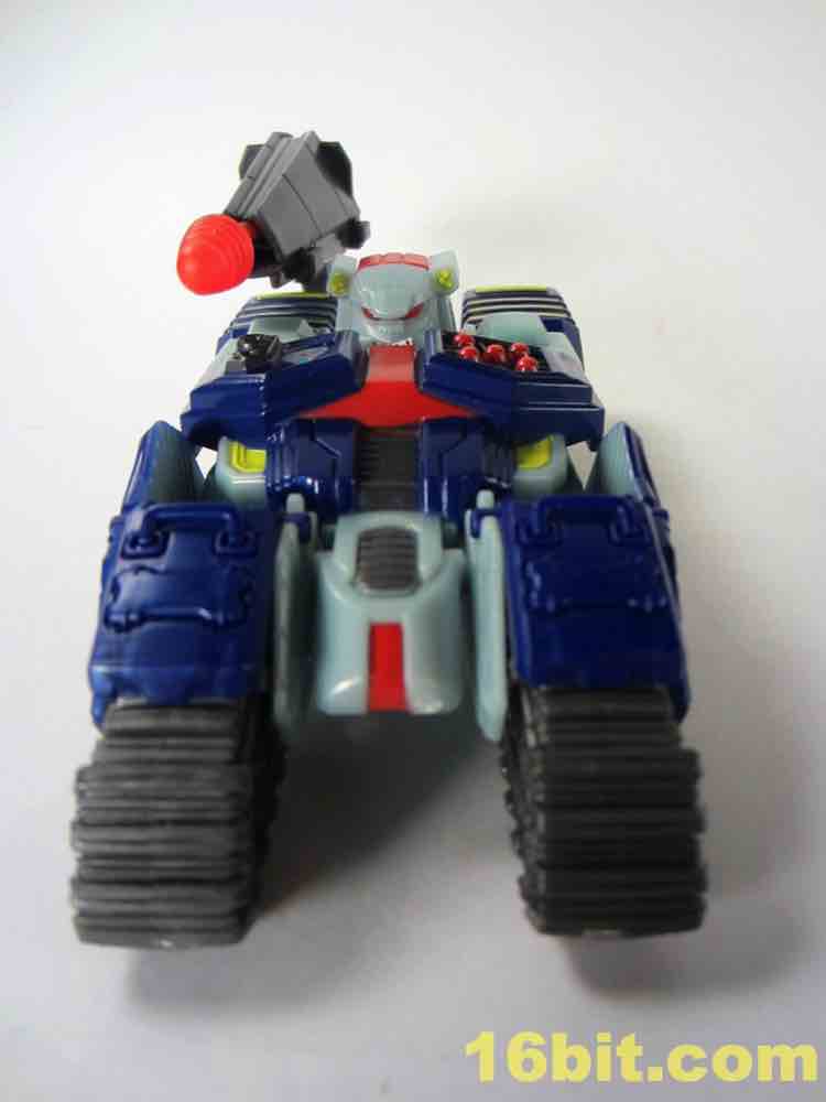 The 4 1/3-inch tall Vehicon warrior has about 21 meaningful points of articulation, depending on how you want to count his various pieces. The legs really aren't conducive to being moved, but you can swap them around for more "legs" or more "treads". The height doesn't change a bit, but it's a nice display option if you like such things. There are no 5mm peg holes for weapons, but the geared claws open nicely to grip certain accessories. The paint is great, but the choice of the metallic, pale blue plastic seems odd. A silver color or something with a smidgen less translucency to it would look a little better, but the bright reds and dark blues really do sing. I imagine a redeco of this figure would be even better, but this one is pretty good. Nothing pops off, and transformation is quite simple. Tuck the arms back pop the robot head up into the tank head, and then you can pretend what you get is tank-like. As alt modes go, it does look like the Beast Machines vehicle vaguely but may be one of the weaker, more gappy beings in the Cybertronian mototpool. Basically, you're buying this figure for the swell robot mode and an acceptable tank.