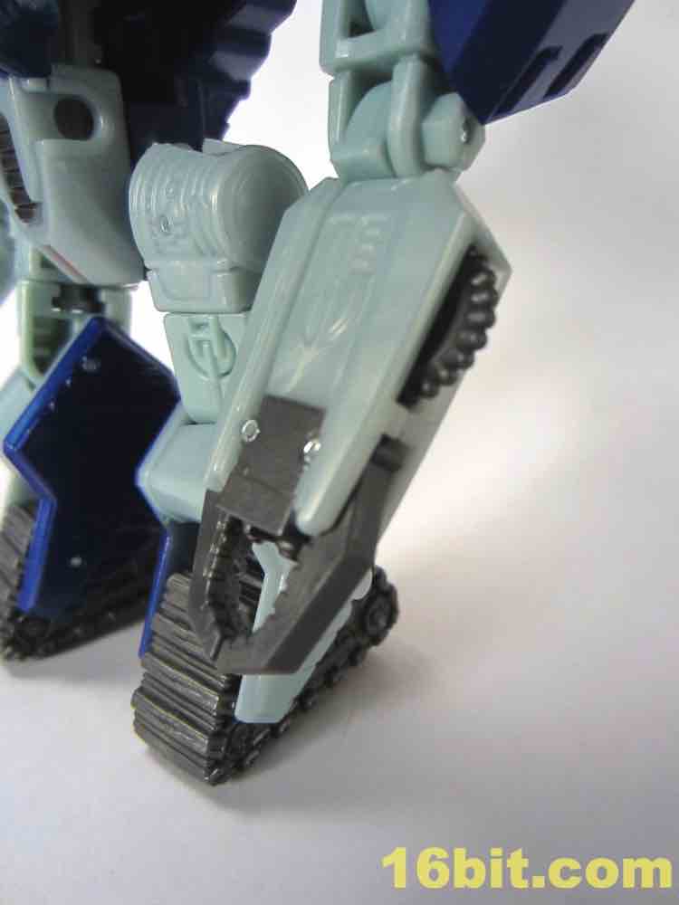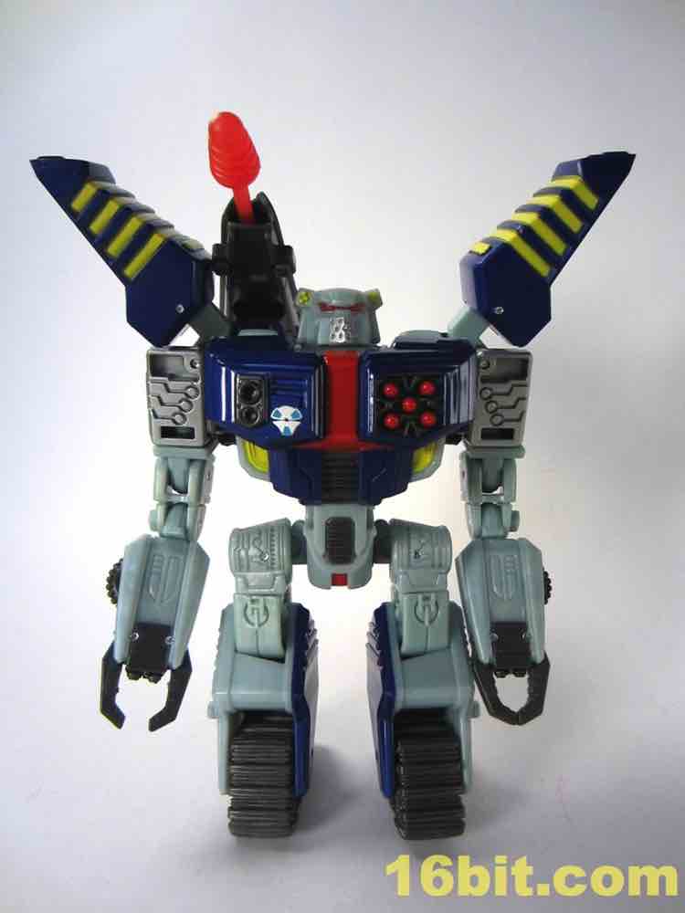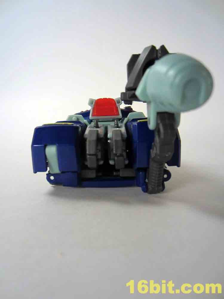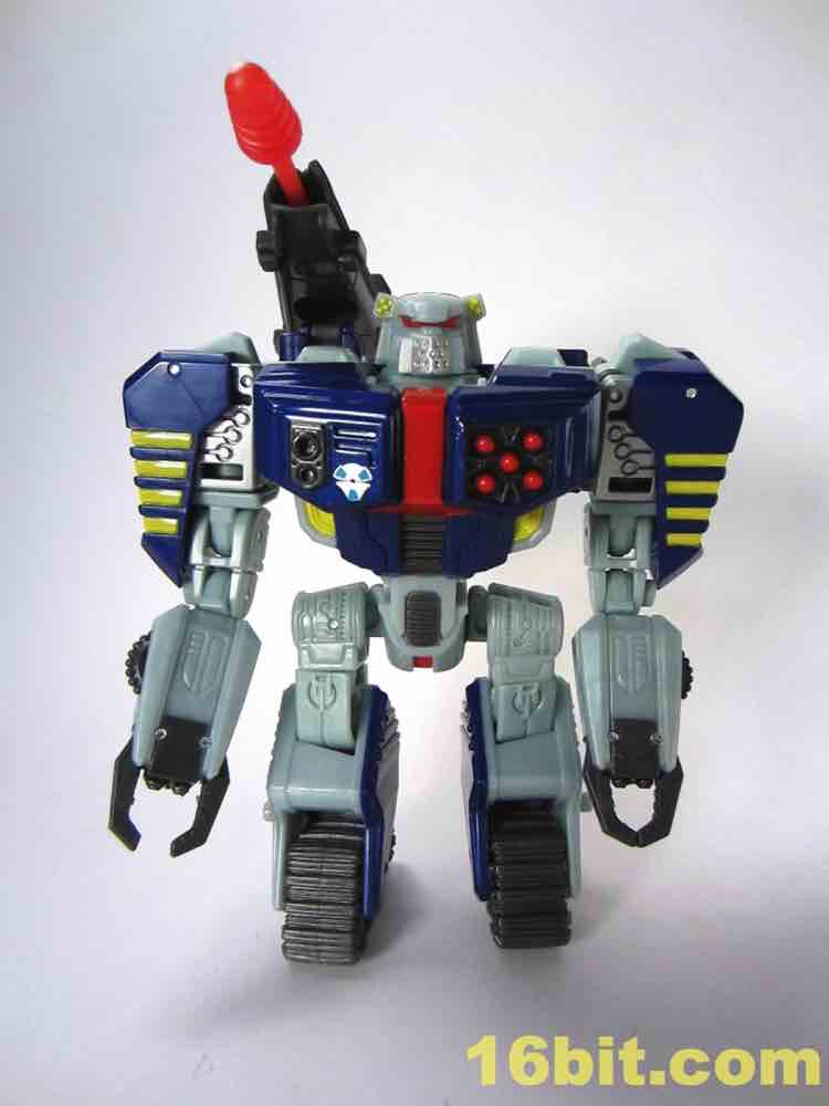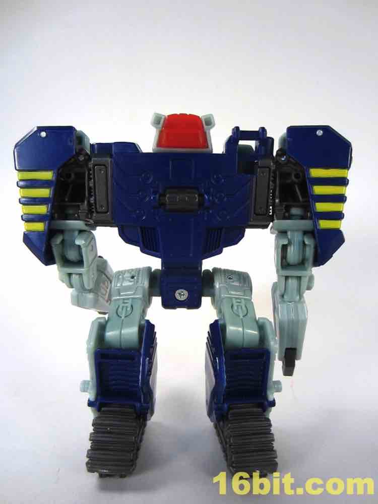 The 4 1/3-inch tall Vehicon warrior has about 21 meaningful points of articulation, depending on how you want to count his various pieces. The legs really aren't conducive to being moved, but you can swap them around for more "legs" or more "treads". The height doesn't change a bit, but it's a nice display option if you like such things. There are no 5mm peg holes for weapons, but the geared claws open nicely to grip certain accessories. The paint is great, but the choice of the metallic, pale blue plastic seems odd. A silver color or something with a smidgen less translucency to it would look a little better, but the bright reds and dark blues really do sing. I imagine a redeco of this figure would be even better, but this one is pretty good. Nothing pops off, and transformation is quite simple. Tuck the arms back pop the robot head up into the tank head, and then you can pretend what you get is tank-like. As alt modes go, it does look like the Beast Machines vehicle vaguely but may be one of the weaker, more gappy beings in the Cybertronian mototpool. Basically, you're buying this figure for the swell robot mode and an acceptable tank.