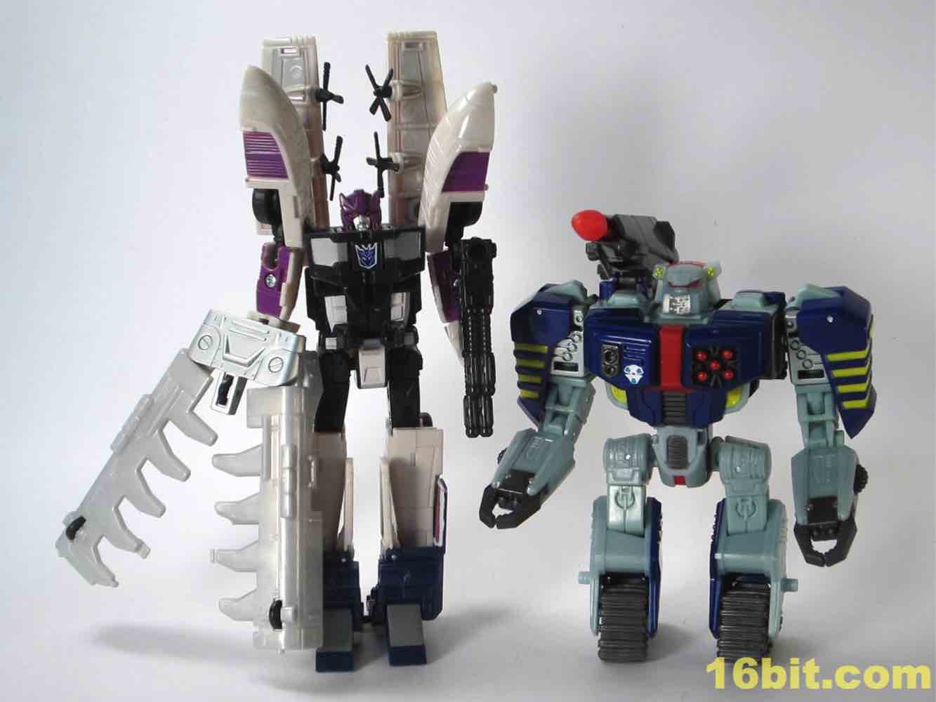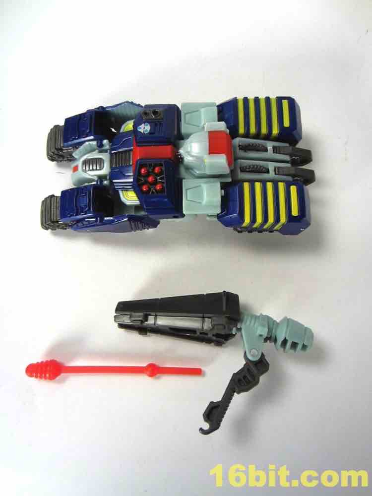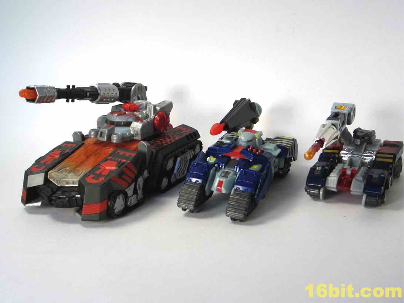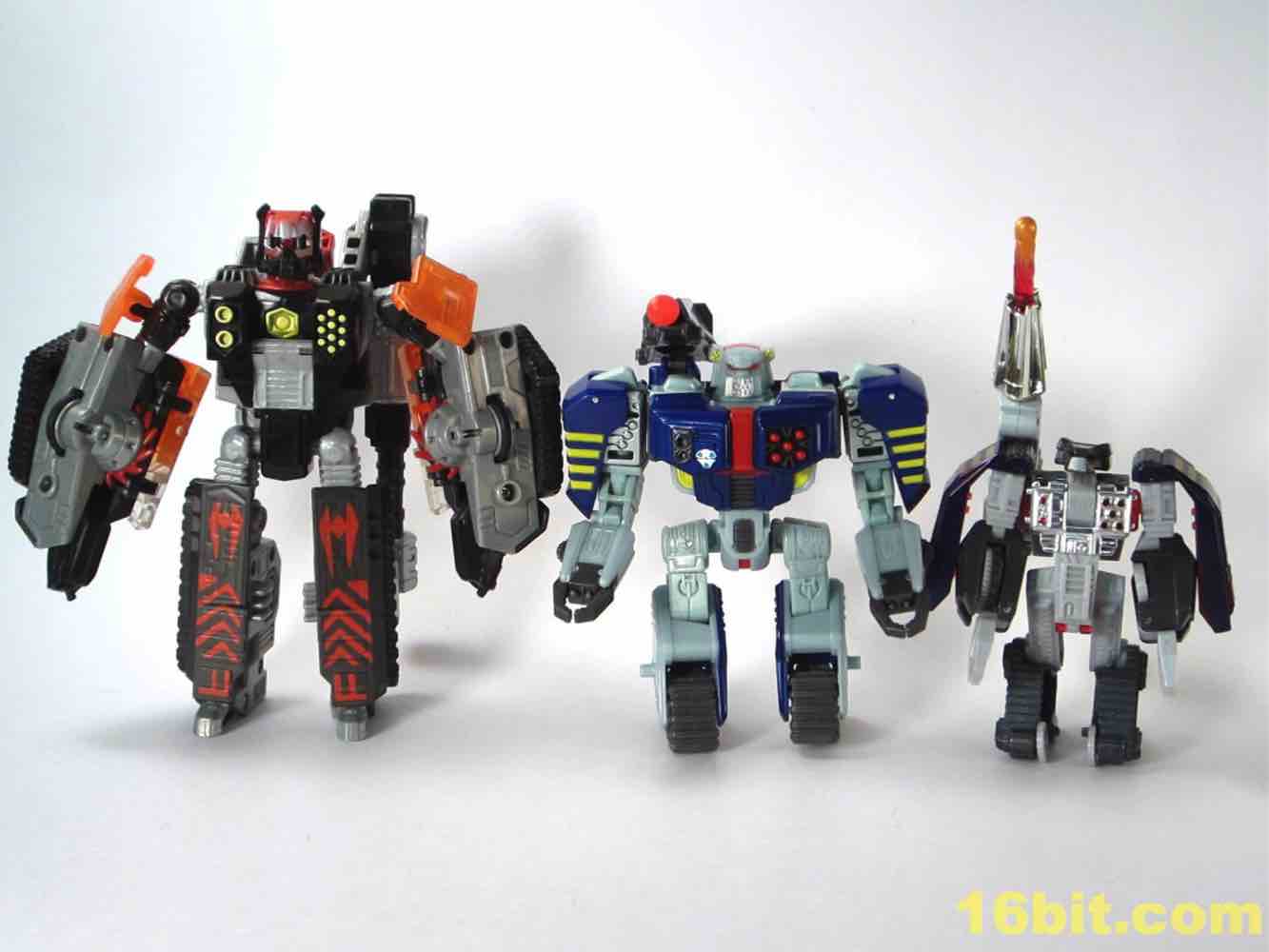 The 4 1/3-inch tall Vehicon warrior has about 21 meaningful points of articulation, depending on how you want to count his various pieces. The legs really aren't conducive to being moved, but you can swap them around for more "legs" or more "treads". The height doesn't change a bit, but it's a nice display option if you like such things. There are no 5mm peg holes for weapons, but the geared claws open nicely to grip certain accessories. The paint is great, but the choice of the metallic, pale blue plastic seems odd. A silver color or something with a smidgen less translucency to it would look a little better, but the bright reds and dark blues really do sing. I imagine a redeco of this figure would be even better, but this one is pretty good. Nothing pops off, and transformation is quite simple. Tuck the arms back pop the robot head up into the tank head, and then you can pretend what you get is tank-like. As alt modes go, it does look like the Beast Machines vehicle vaguely but may be one of the weaker, more gappy beings in the Cybertronian mototpool. Basically, you're buying this figure for the swell robot mode and an acceptable tank.