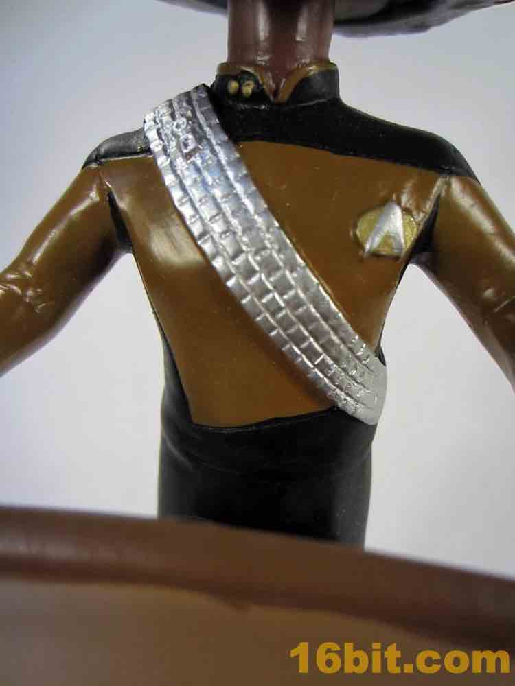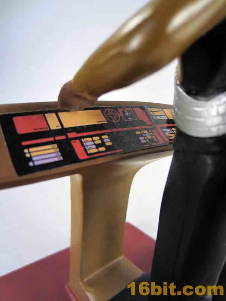 Once out of the box, his head bobbles. That's about it. The sculpt is pretty good, the commbadge is over to the side a bit much and the baldrick looks a little less like a series of woven bike chains. That's a plus. His hands don't quite touch the console so the sticker can fit under there, but the head sculpt is quite nice. It makes the body look even smaller - it's a big head! - but the detailing is good. You get the "Donna Reed" hairdo of the earlier episodes, a determined facial expression, and hands that look ready to punch in some data or analyze some space Skyping or whatever it is he'll be doing this week.