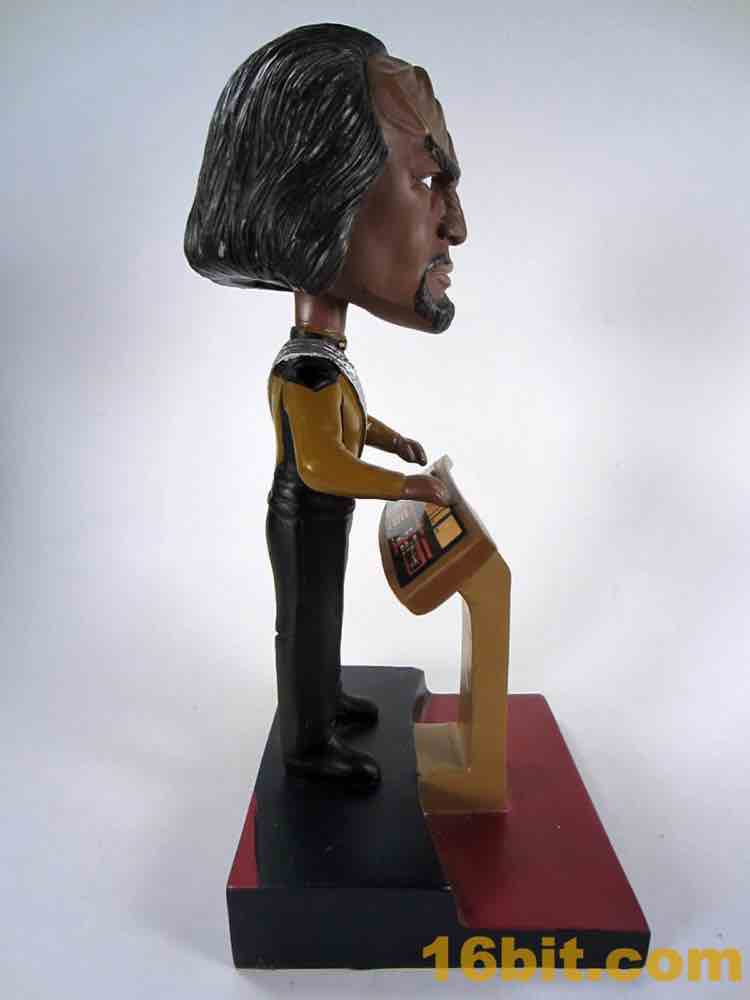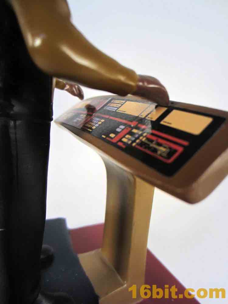 Worf is tall and thanks to his base, pretty heavy. Starfleet's first Klingon stands about 7 1/2-inches tall and stands at his tactical station, which is represented with a sticker showing off various details and things. The base has the carpeting painted so there's really not much for you to do other than pop open the box and stand him on your desk - as opening toys go, the lack of tape or other fasteners made it pretty easy to get out. I like that. Oh, and I'm as biased as all heck.