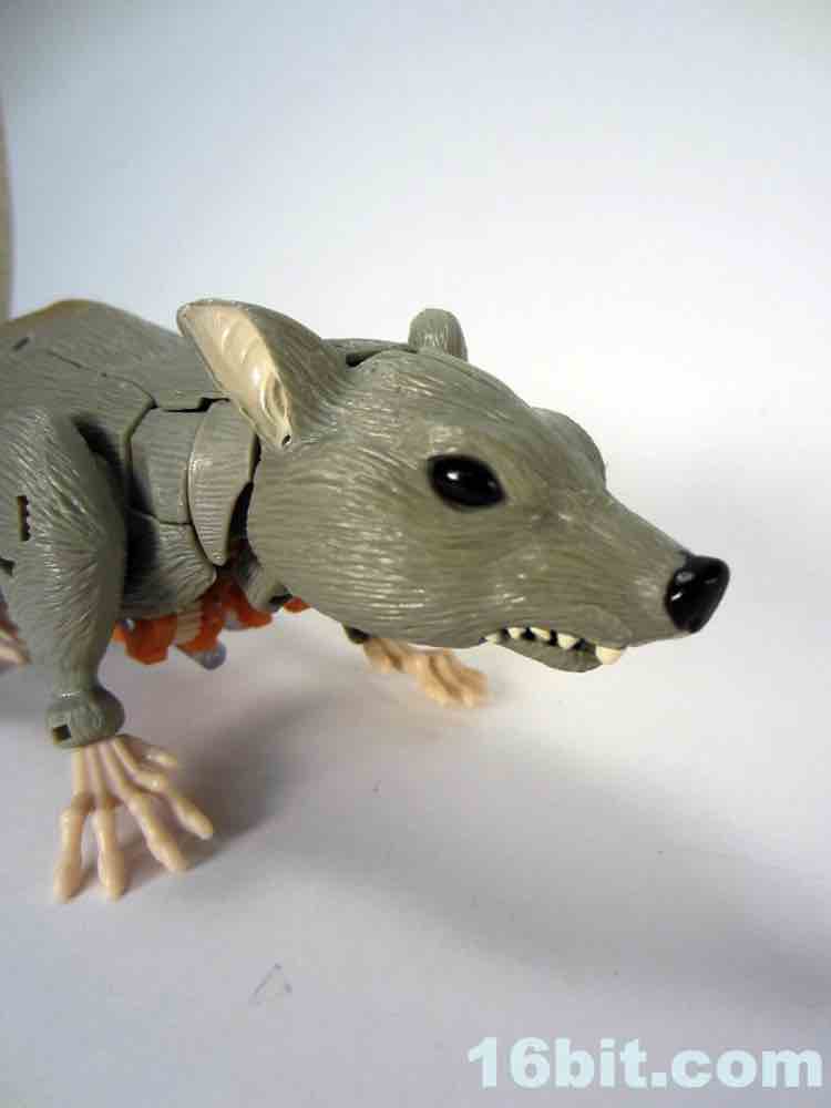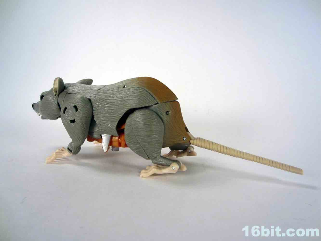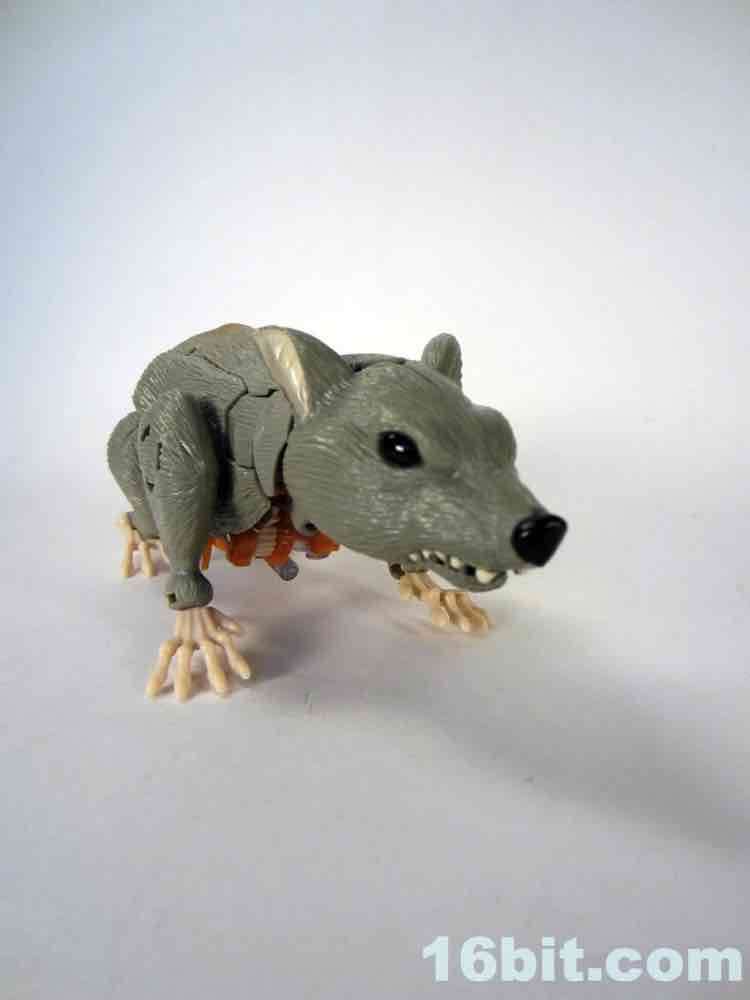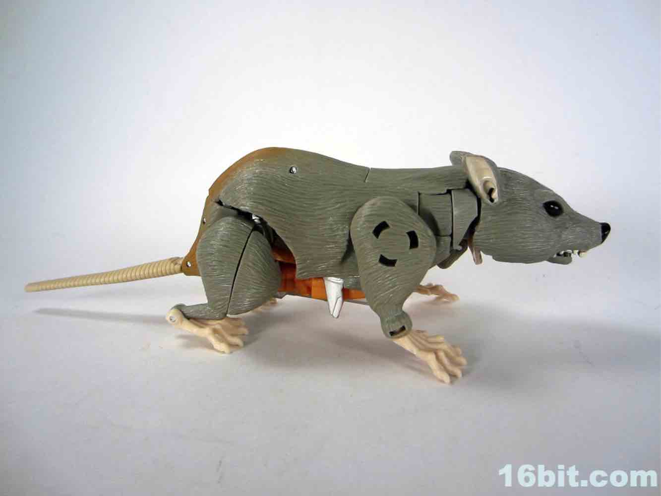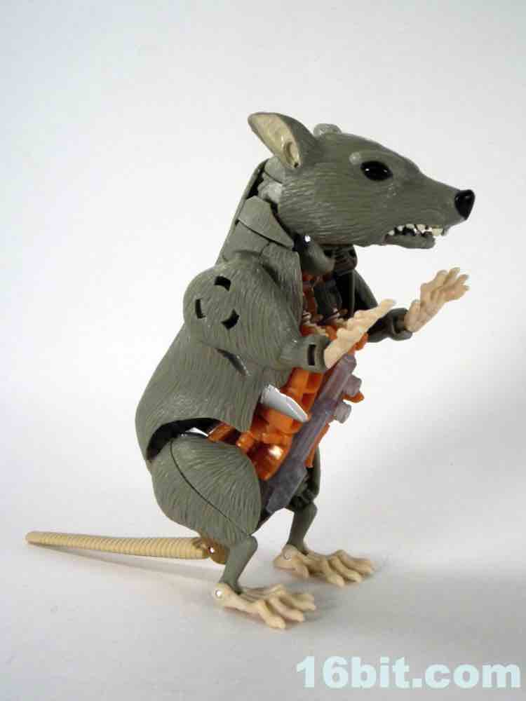 Transformation is a pain in the neck. It's clever in spots, but also annoying - the rat feet fold out of the robot feet, which is clever, but getting the shins to split open and twirl around is annoying. Massaging the arms and various rat panels into rat form requires some patience, whereas the original 1990s toy took about two seconds thanks to a spring-loaded transformation mechanism. I'd say it's one of the more obnoxious deluxe toys, but once you get him in either mode it's not like he'll be flopping around. Joints are nice and tight, and unlike the 2010 Perceptor nothing is going to fall off or unpeg while you play with him.