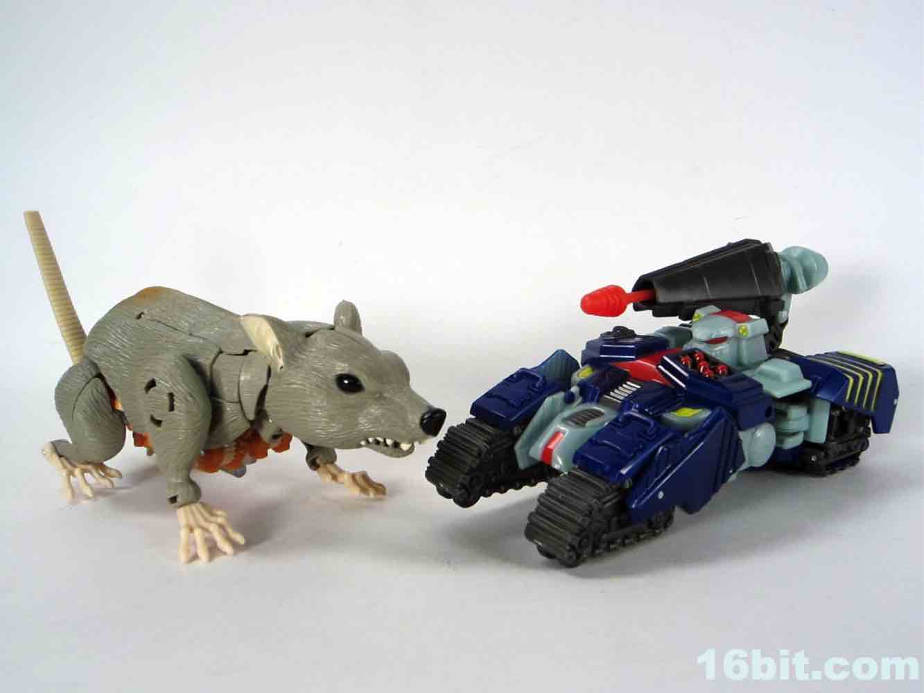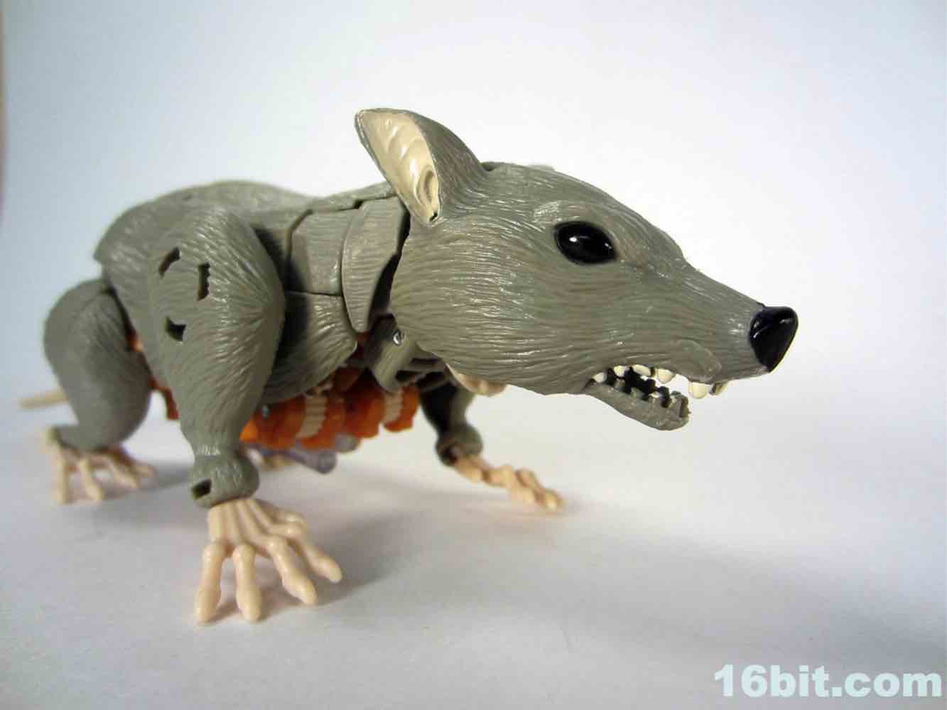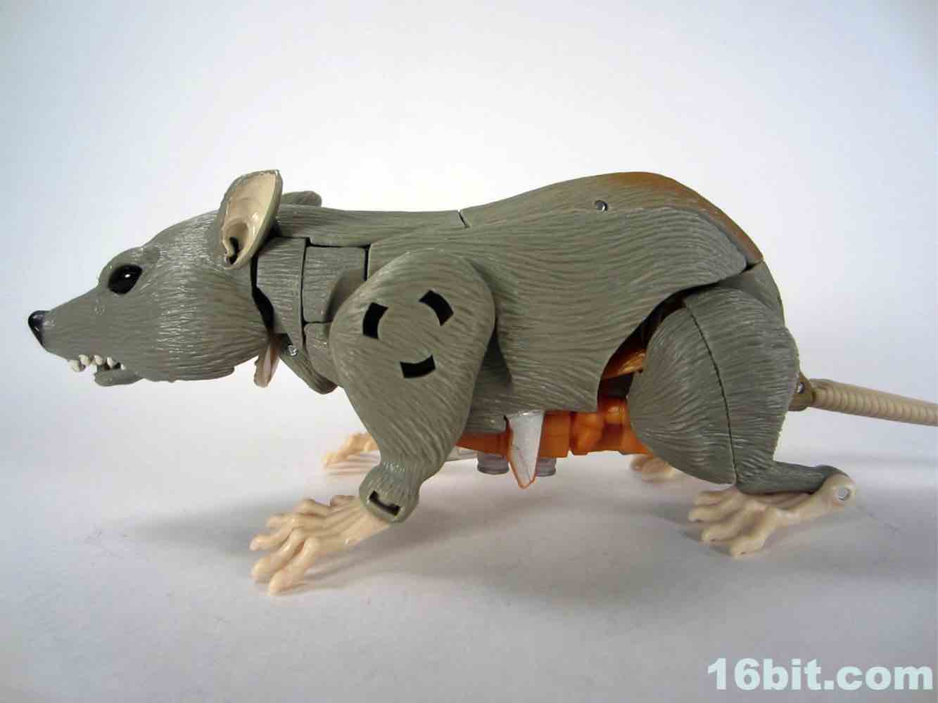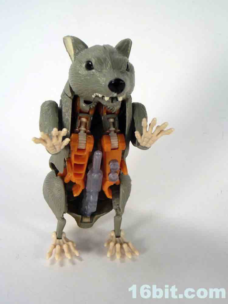 Transformation is a pain in the neck. It's clever in spots, but also annoying - the rat feet fold out of the robot feet, which is clever, but getting the shins to split open and twirl around is annoying. Massaging the arms and various rat panels into rat form requires some patience, whereas the original 1990s toy took about two seconds thanks to a spring-loaded transformation mechanism. I'd say it's one of the more obnoxious deluxe toys, but once you get him in either mode it's not like he'll be flopping around. Joints are nice and tight, and unlike the 2010 Perceptor nothing is going to fall off or unpeg while you play with him.