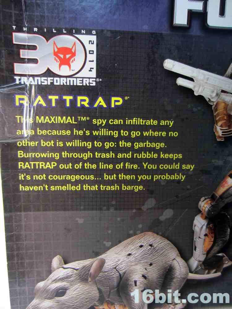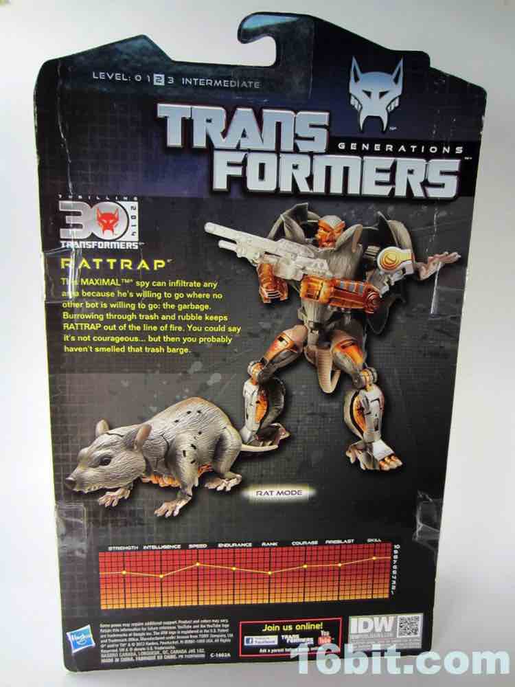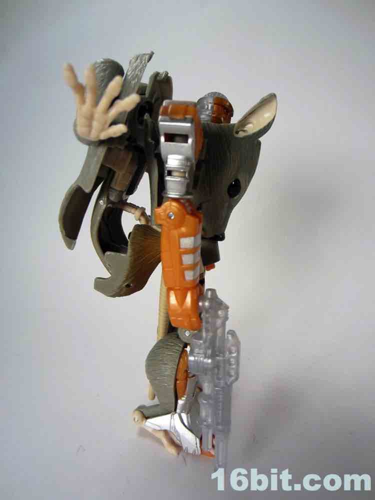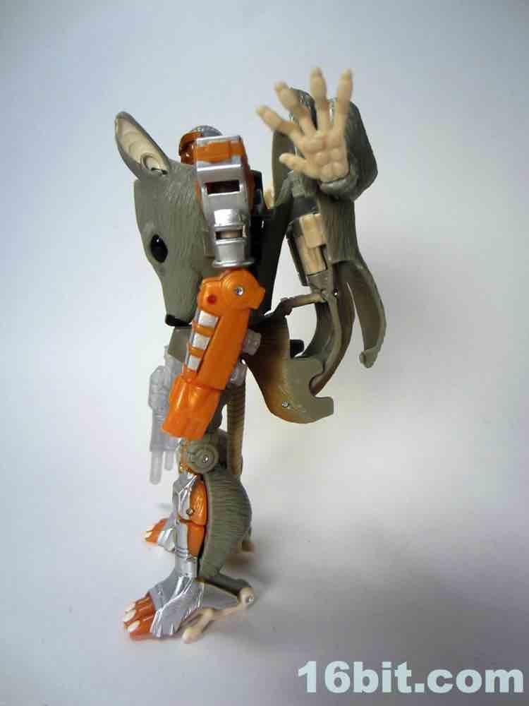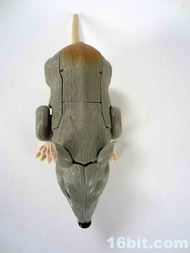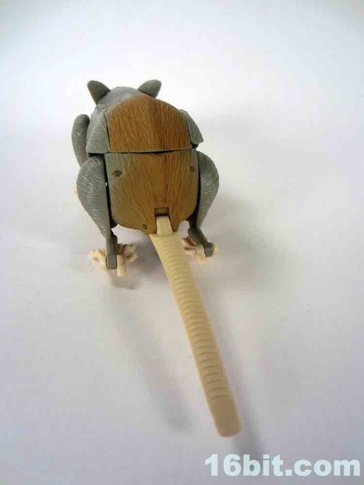 Transformation is a pain in the neck. It's clever in spots, but also annoying - the rat feet fold out of the robot feet, which is clever, but getting the shins to split open and twirl around is annoying. Massaging the arms and various rat panels into rat form requires some patience, whereas the original 1990s toy took about two seconds thanks to a spring-loaded transformation mechanism. I'd say it's one of the more obnoxious deluxe toys, but once you get him in either mode it's not like he'll be flopping around. Joints are nice and tight, and unlike the 2010 Perceptor nothing is going to fall off or unpeg while you play with him.