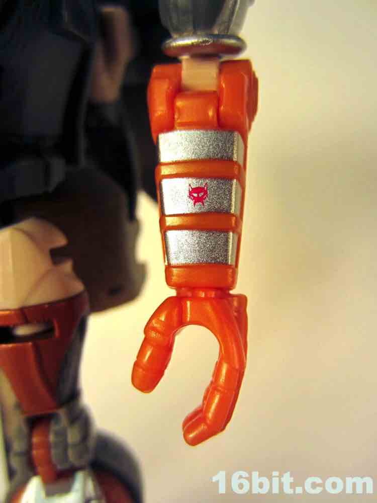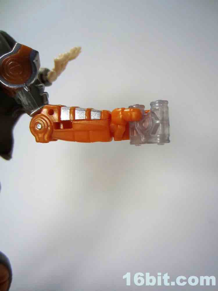 While .shtmlinator took a design from nearly two decades ago and improved it while being pretty much the same size, Rattrap doesn't seem to have a lot in common with his tiny $5 ancestor. The robot mode is 5-inches tall, with about 13 points of articulation depending on how you feel like counting. There are no ankle or wrist joints, and the hands are a little tight for his included weapon and many other 5mm accessories. They fit, but be careful - the plastic in the arms is sturdy, so snapped thumbs could happen if you're careless. The arms are nicely detailed and feature the smallest Maximal symbols I've ever seen, but the elbows don't quite get a 90-degree bend and as such he feels a little stiff. The left forearm has an opening panel with a removable clear plastic bomb accessory that could probably do double-duty as binoculars. It's a nice bonus, and you can see it hanging out of the bottom a tiny bit.