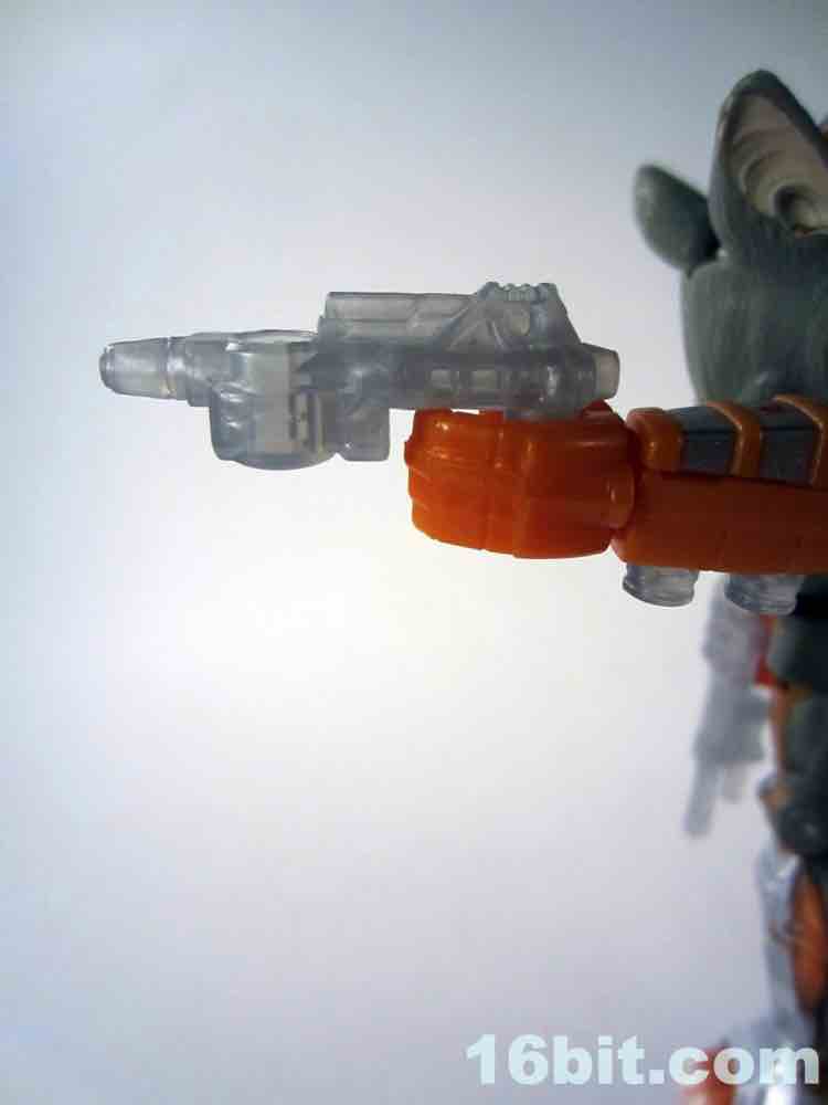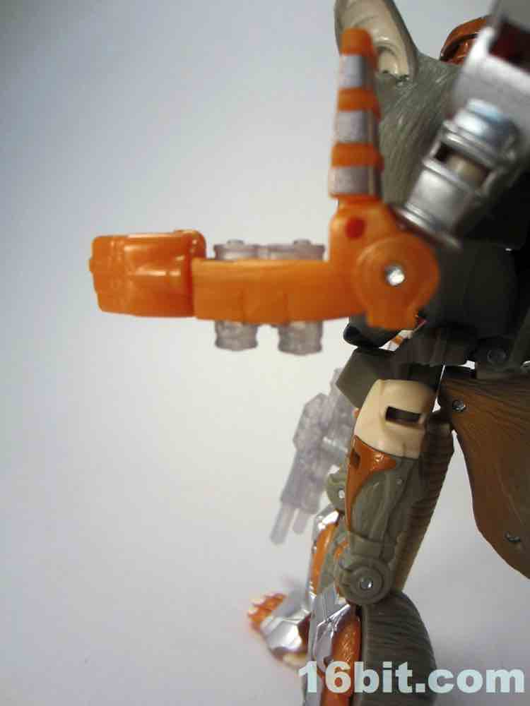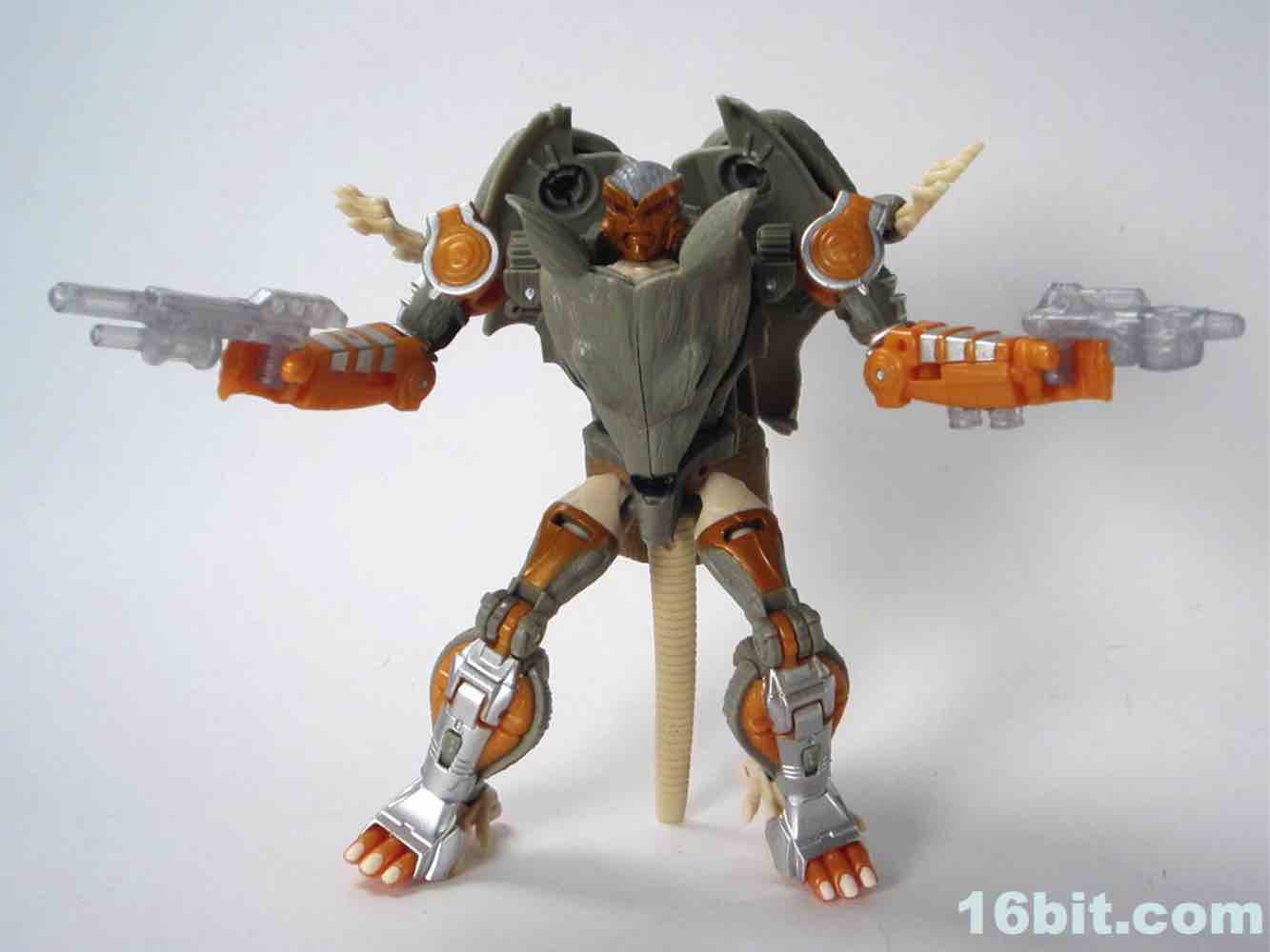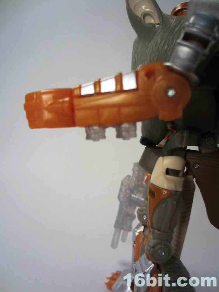 The guns store under the belly in rat mode, plus there's a flexible, bendable rat tail which is either totally awesome or totally gross. I like it. He has a mouth, 4 articulated limbs, and can even stand on his hind legs. There's a little extra flap behind the rat head so if you rotate it down, it covers the gap that would reveal the robo innards. It's a nice touch, but it doesn't take into account you can see all the robot bits on his rat belly if he stands on his own two feet. It's a toy that clearly shows a lot of through, but not all if it works as well as .shtmlinator or Rhinox.