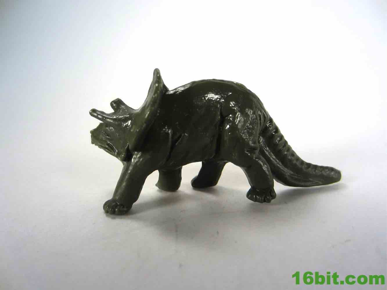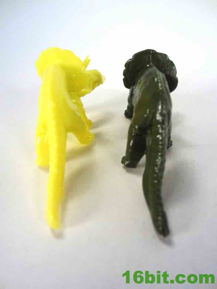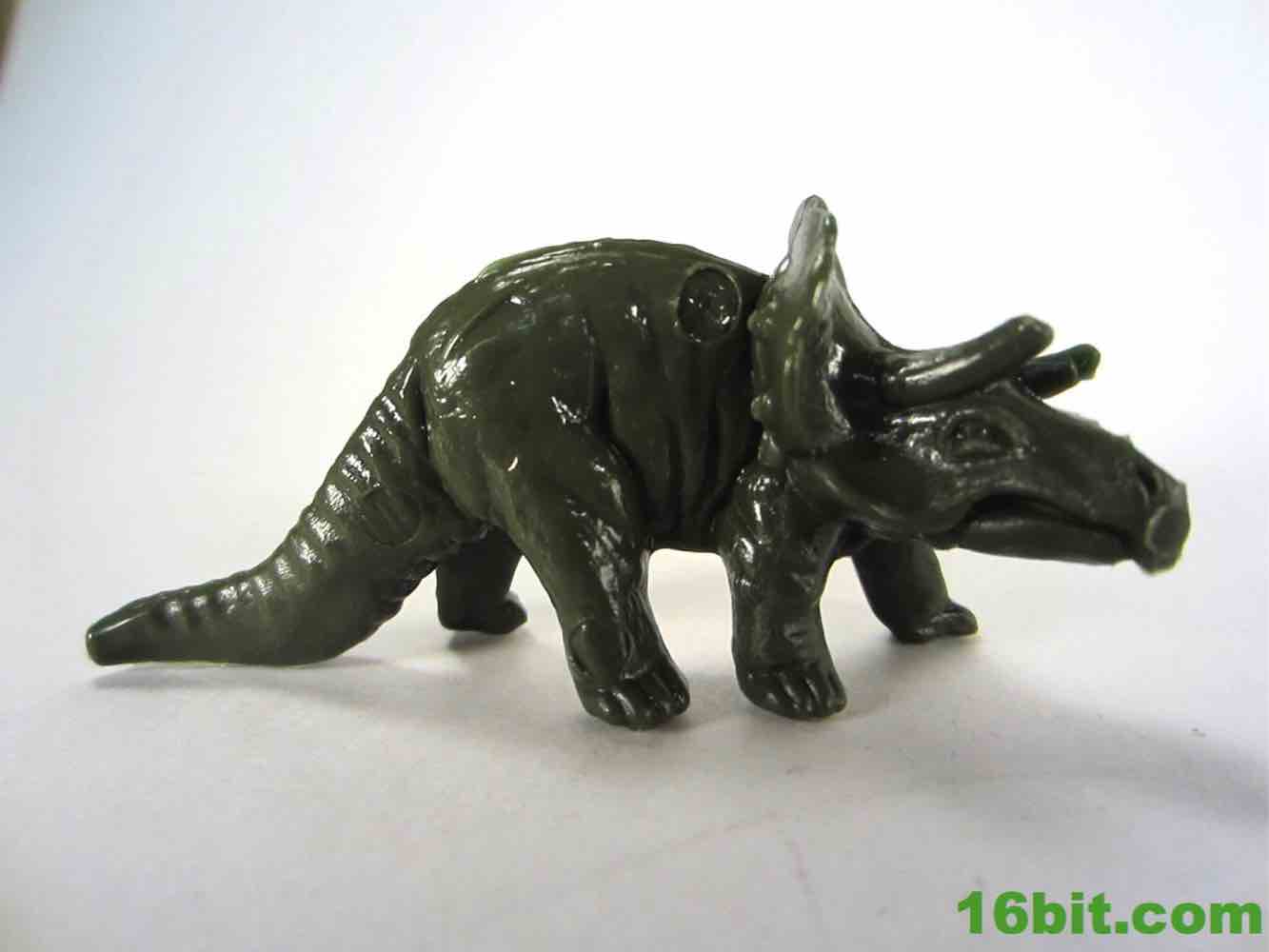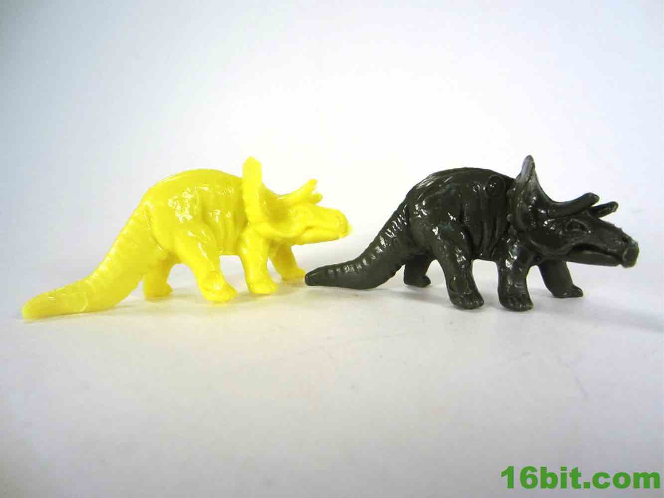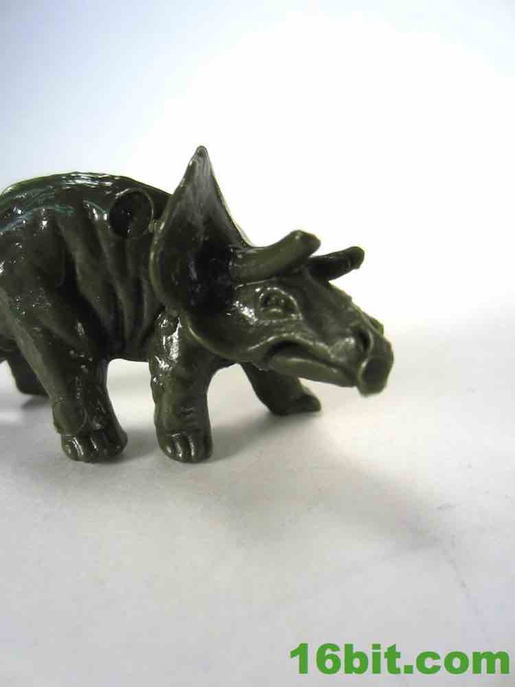 Rounding out the set is the triceratops, or so I assume. Older versions of the mold have three visible horns, while this one has two truncated horns and no central nose horn. The smoother skin is consistent with later releases, although there are some creases and folds here and there. The frill has a little bit of detailing, and the head has some good cuts for the eyes, nose, and mouth. I assume the tool had some wear or this was de-fanged due to safety issues, because without the three horns it's a pretty weak triceratops. Some of the later releases were like this too, so it's not like the lessened design is a new thing - there's a lot floating around out there like this. I'm not crazy about the design without the third horn, but it's not unreasonable to see some fossils (or actual extant animals) with horns that were favored a little too much that resulted in filed-down horns or antlers or whatever. Granted, I'd rather they be longer so I could customize them were I so inclined, but it's still cute and small and pretty nifty.