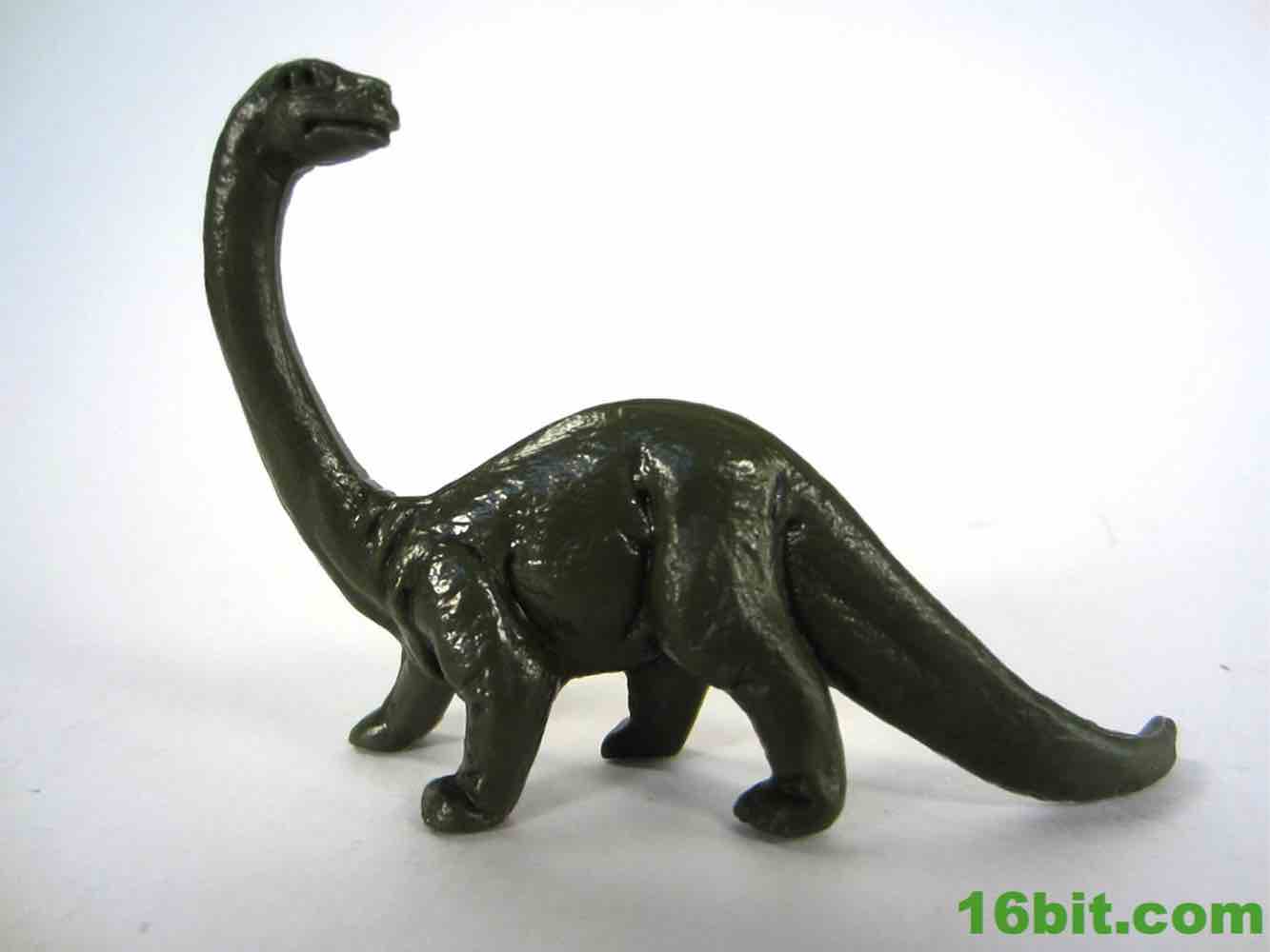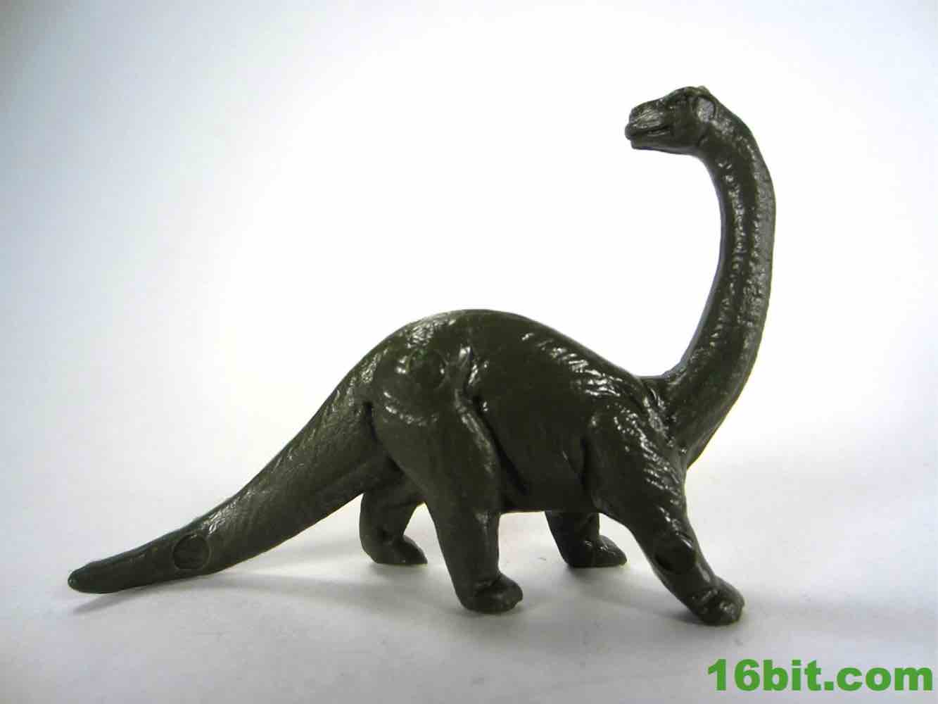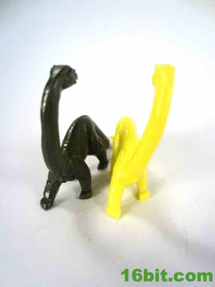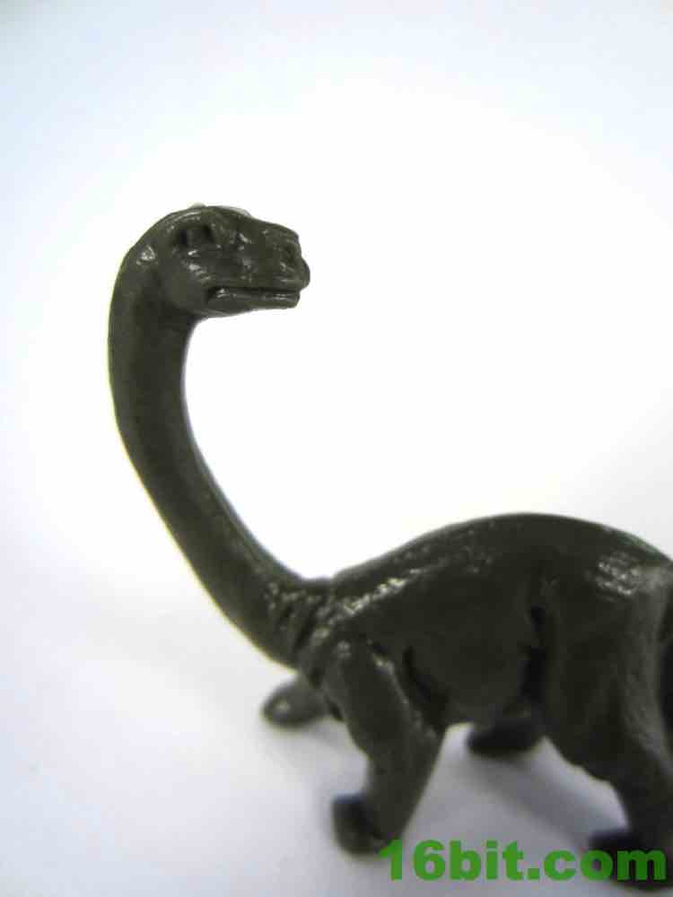 The long-necked dinosaur - presumably a brontosaurus given the marketing of the past century, likely actually an apatasaurus. The same design has been used a few times, with its unique hooked neck design having made numerous appearance in cheap dinosaur bags over the years. I've got a few copies of this mold in various larger and smaller sizes, and I'm fairly sure I read another company or two also had figures in this style. I really dig it, mostly because the pose isn't used on most other, bigger sauropod toys. The skin texture is good, it feels a little waxy. The head is nice and sharp with clear eyes and nostrils, plus a mouth that also seems to look a little frustrated or irate. You can't beat that. The tail drags, as most of these do, and the pose is perfect for a creature looking over his shoulder while being chased down by angry meat-eating dinosaurs. This dinosaur was my favorite as a kid, and getting (new copies of) the original really makes my day. I'd love to see these in some other colors too. He's about 2-inches tall.