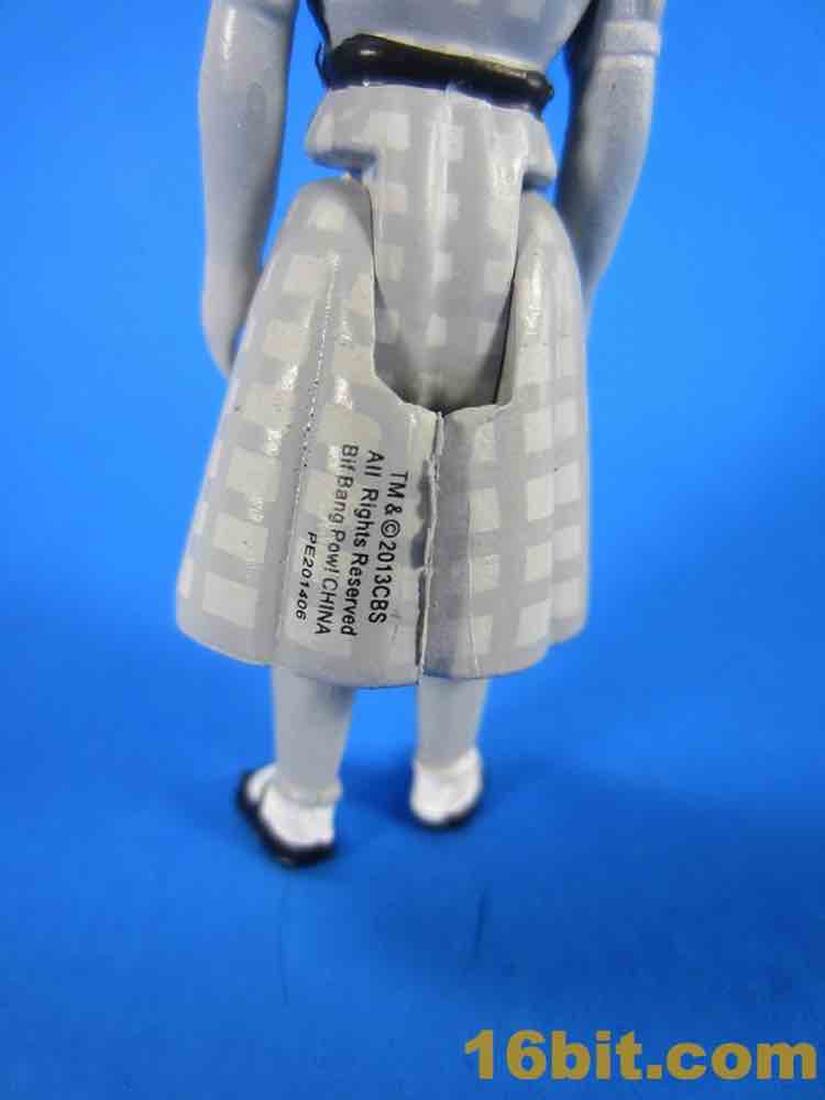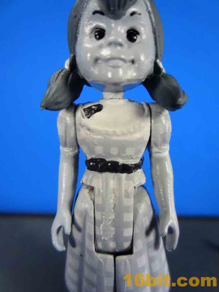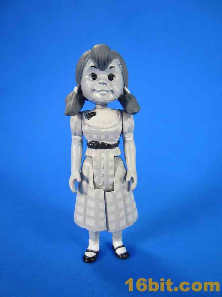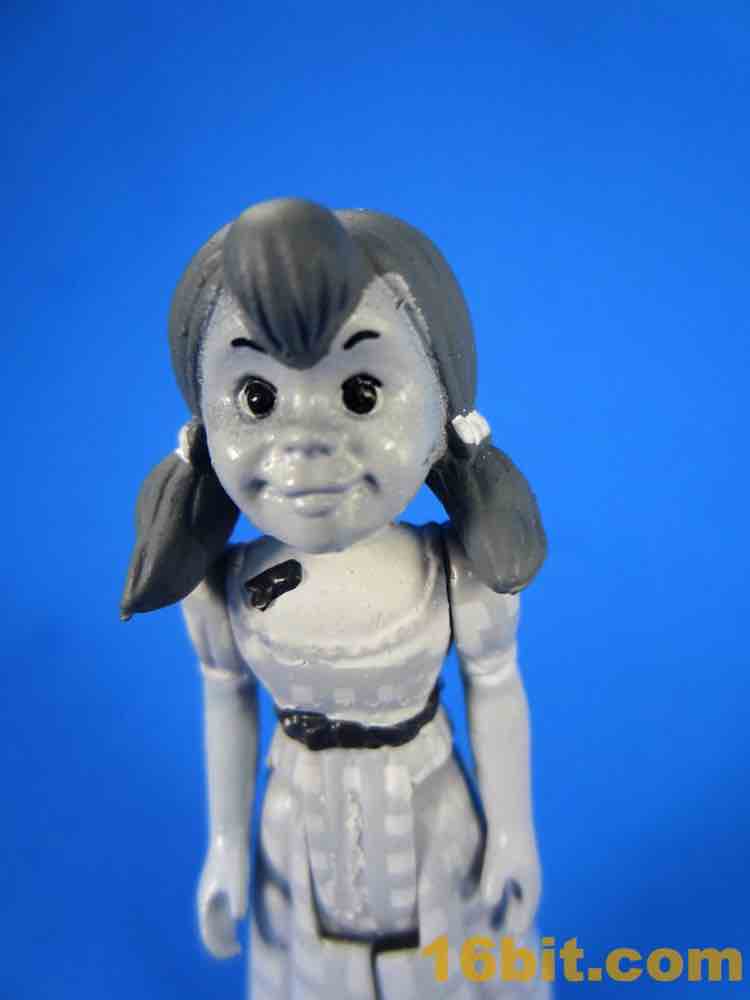 The arms are a tiny bit skinny, even for a figure of this size, but it's not like you'd like her more if she were thicker. The figure's stiff pose and innocent-meets-creepy face works really well. She has small shoes with painted socks, and a decent pattern on the fabric that turned out well. Her only real flaw is that it seems the figure was wet after painting, so you'll see some weird crumbly bits if you get too close - which is what anyone who photographs an action figure is likely to do. Like Kanamit, her legs are hollow in the dress area for reasons unknown. (This was not intended, but it's here and it doesn't hurt anything.)