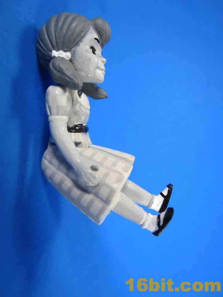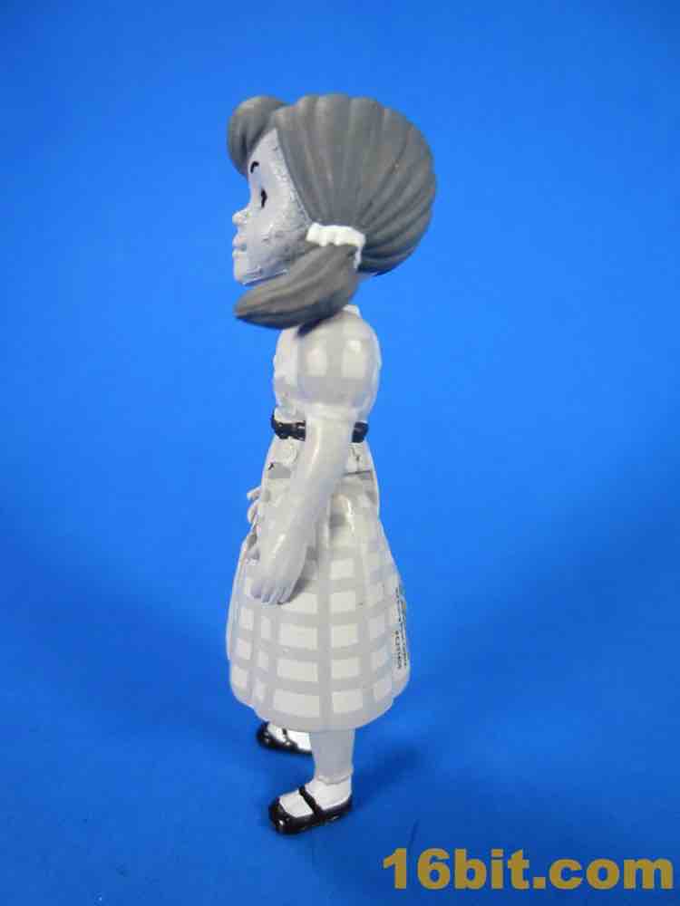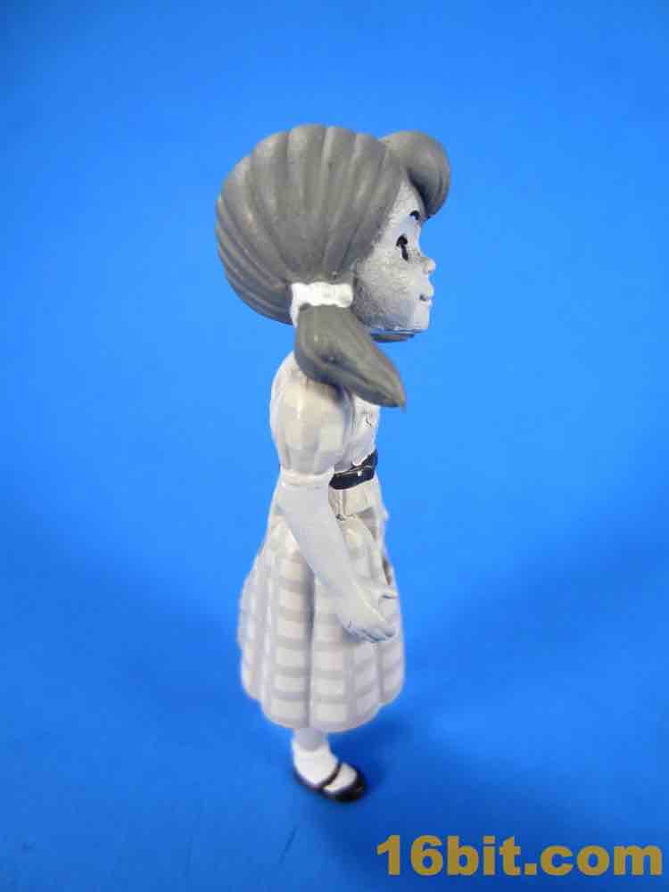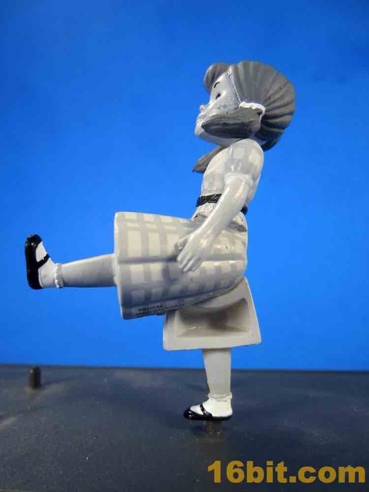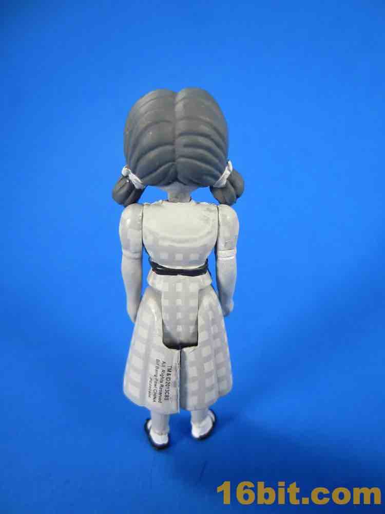The arms are a tiny bit skinny, even for a figure of this size, but it's not like you'd like her more if she were thicker. The figure's stiff pose and innocent-meets-creepy face works really well. She has small shoes with painted socks, and a decent pattern on the fabric that turned out well. Her only real flaw is that it seems the figure was wet after painting, so you'll see some weird crumbly bits if you get too close - which is what anyone who photographs an action figure is likely to do. Like Kanamit, her legs are hollow in the dress area for reasons unknown. (This was not intended, but it's here and it doesn't hurt anything.)
