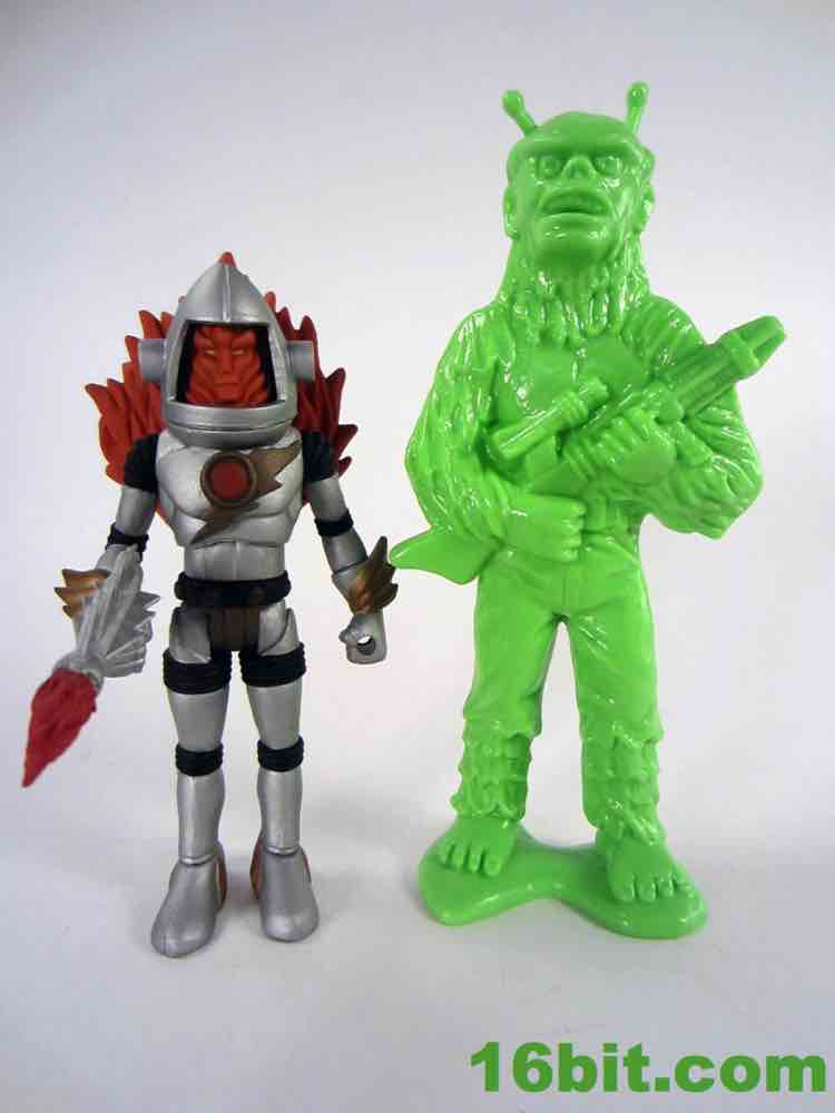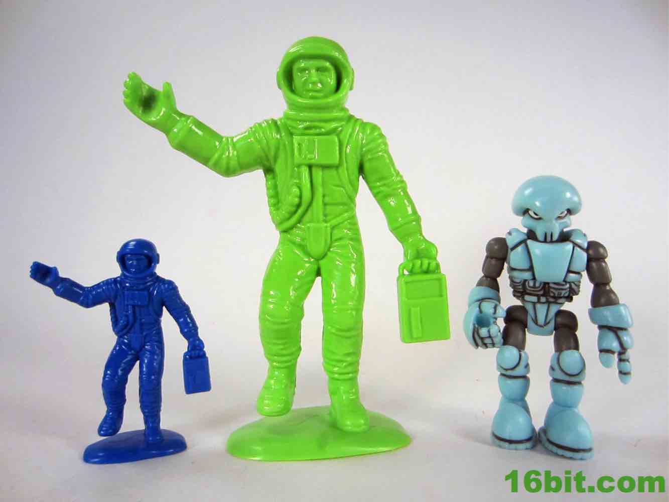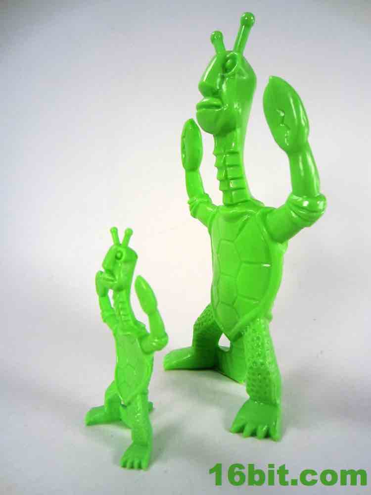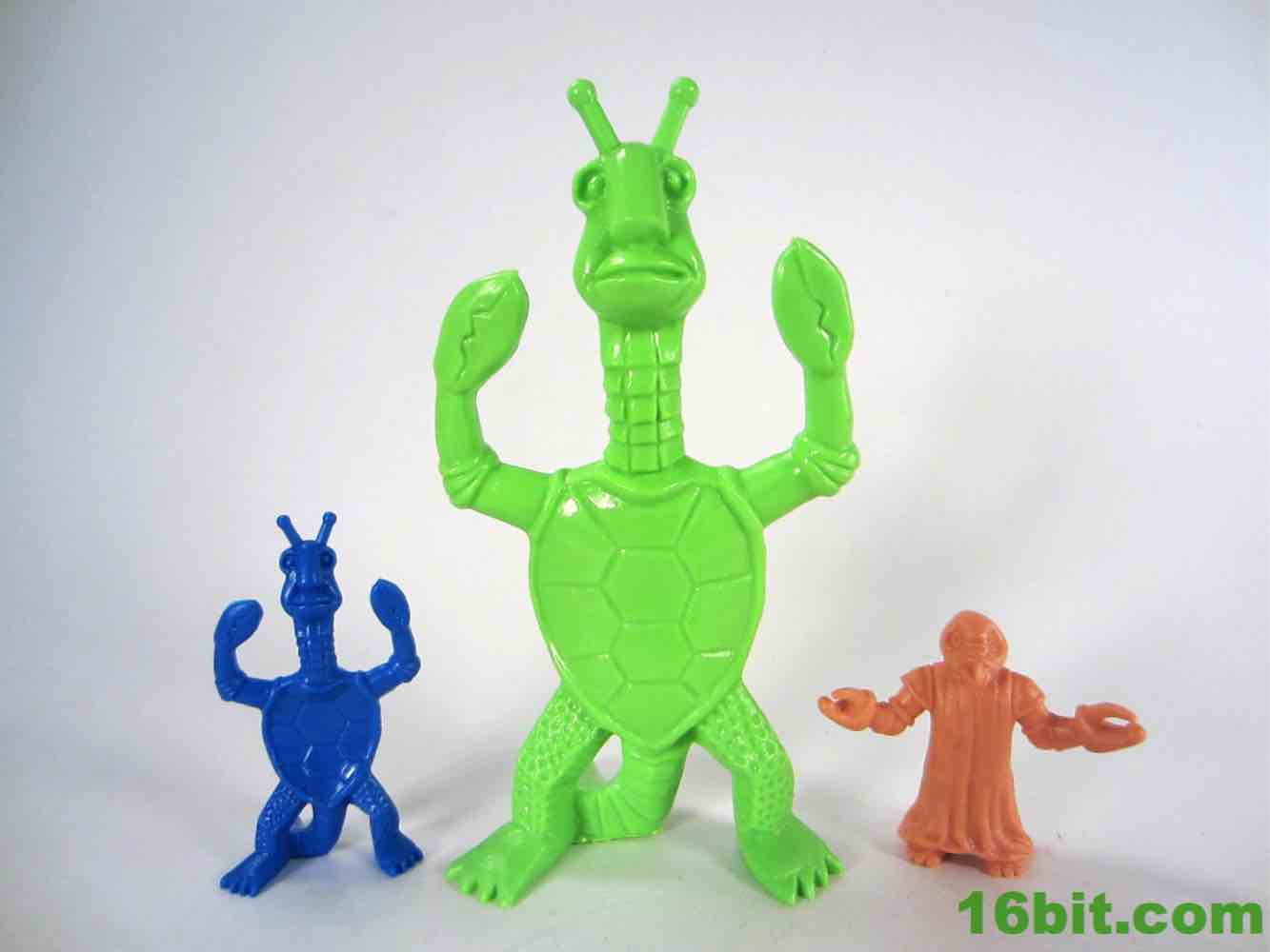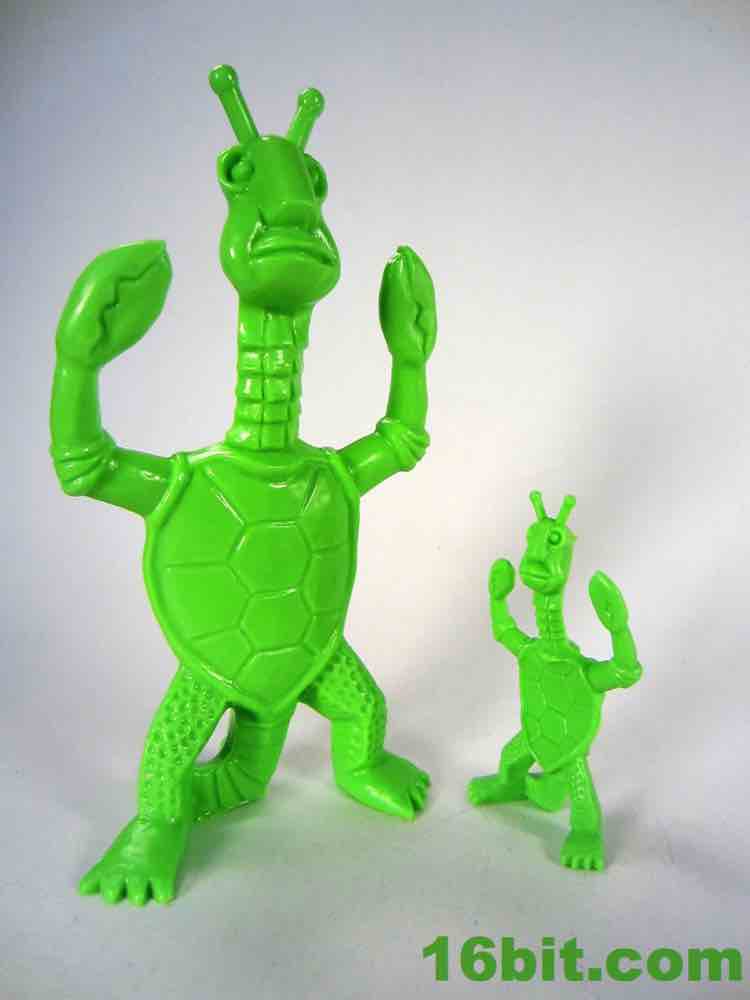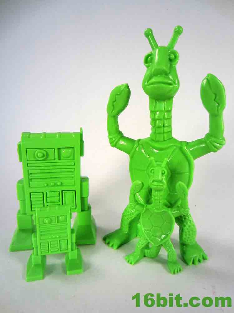While most of this kind of figure is smaller, usually around 60mm scale, these are the size of action figures. The non-poseable figures measre 2 3/4-inches to 5-inches tall, giving you something that's a lot bigger for painting or display. However, you don't get the massive quantity of figures to trade or give away after you keep your own set. The per-figure price is $2.63 each, which is still quite a deal but not as ridiculously good as the 26-cent miniature versions. I guess the question to if they're 10 times as cool as the mini ones is up to you - if you're older, I'm sure you'll appreciate being able to see details without squinting. Even if you're not old, the changes to the space turtle lobster alien's alternate shell sculpt and the altered robot alone may be worth getting just for the curiosity of it - if you didn't know, the mini sculpts changed over the years. The jumbo ones are based on the earliest mini release, hence some changes.