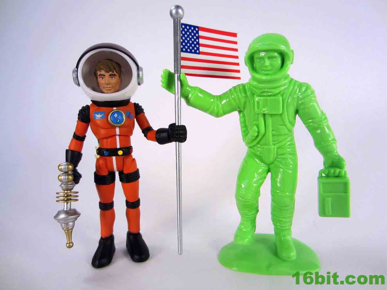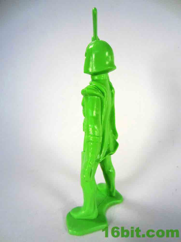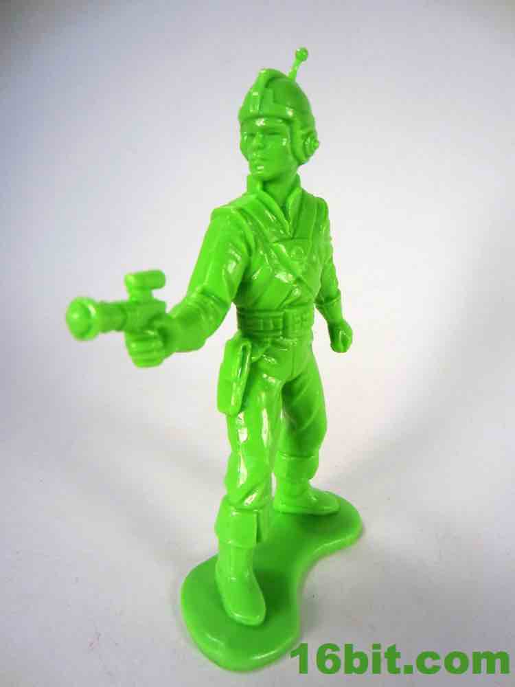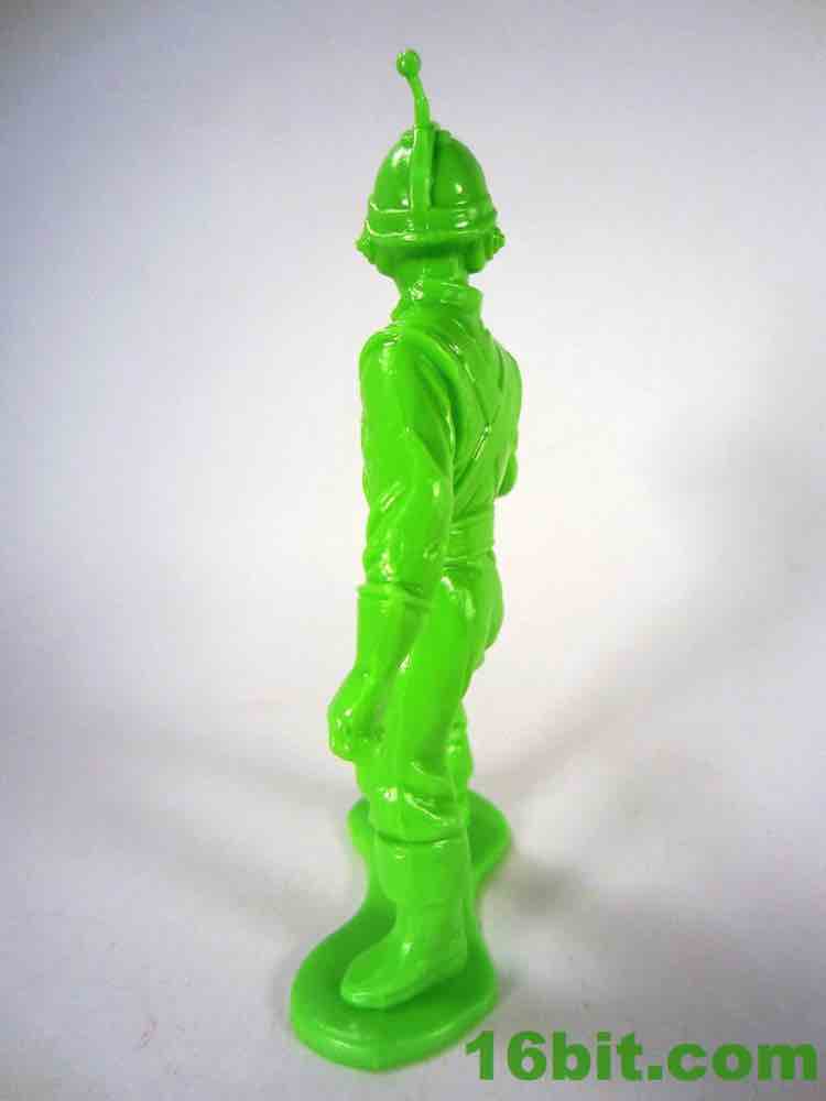 An enlarged quasi Han Solo/Buck Rogers is also just an upsized version of the original, with a thicker antenna on his helmet - which I found out is also an old roleplay toy sold under the name Lunar Patrol Helmet. Standing a hair under 5-inches tall, his pose seems right at home for any space combat scene and the mold's seam doesn't get in the way of his face - even though it runs down the middle. Seeing how badly a split face like this can turn out in other army men figures, it's really spectacular to see it hold up once enlarged to this scale. Like the fake Chewbacca, this space warrior has a blaster pistol based on an old Tim Mee ray gun toy that (so far) hasn't found its way back into production.
