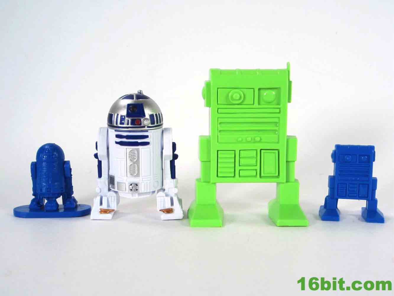 The 2 3/4-inch robot seems to have the most changes. The front is very similar, but the body on my sample is a little wavy - it could be a defect, I'm not certain. An antenna on the left side of his head is absent on the smaller figure, giving this one a distinctly different personality. The feet seem a little different as well, now wider than before. Ultimately, it still looks like a cubist remix of R2-D2.