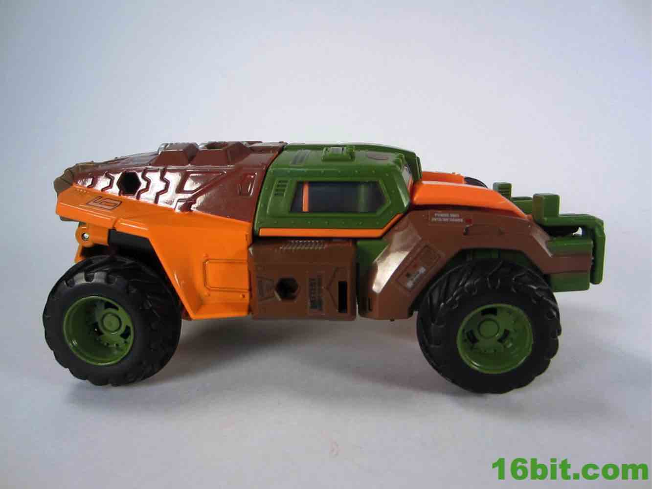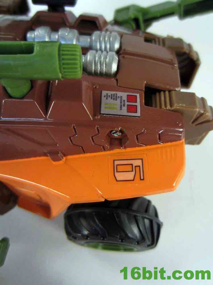 The combat 4x4 has good rolling wheels and little else. As you can see, weapons and BMOG bits fit in it nicely allowing you to store weapons on board or to lose them in a baggie somewhere. Unlike some of the deluxe vehicles, the wheels roll freely and it looks quite colorful with orange, green, and brown plastic. And paint. There's a lot of paint, so take care to not scrape it off.