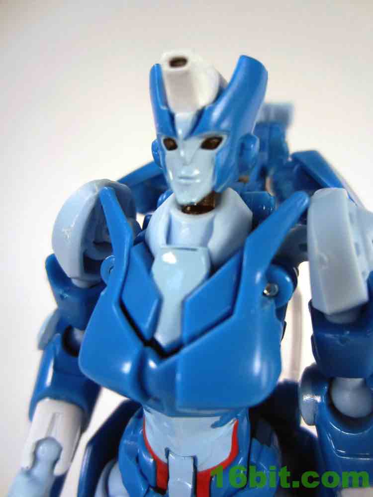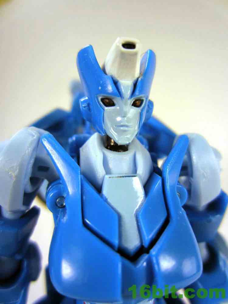 So! The robot head sculpt has a nose - the comic art doesn't have one, so a noseless Chromia would've been neat and a nod to the toy's origins in Prime. It's still a very nice sculpt, with subtle lips, a nose that doesn't stick out too much, and eyes that probably could have benefitted from paint. The figure has a light-up eyeport with a smokey grey plastic, which does her no favors. Arcee's glow blue, while Chromia's peepers are sort of dead and hollow. The rest of her is great, so perhaps a good customizer might want to take her noggin apart and splatter some blue paint on there to a little more personality.