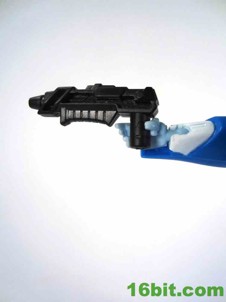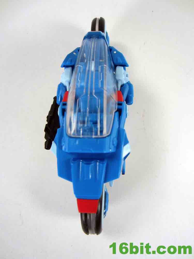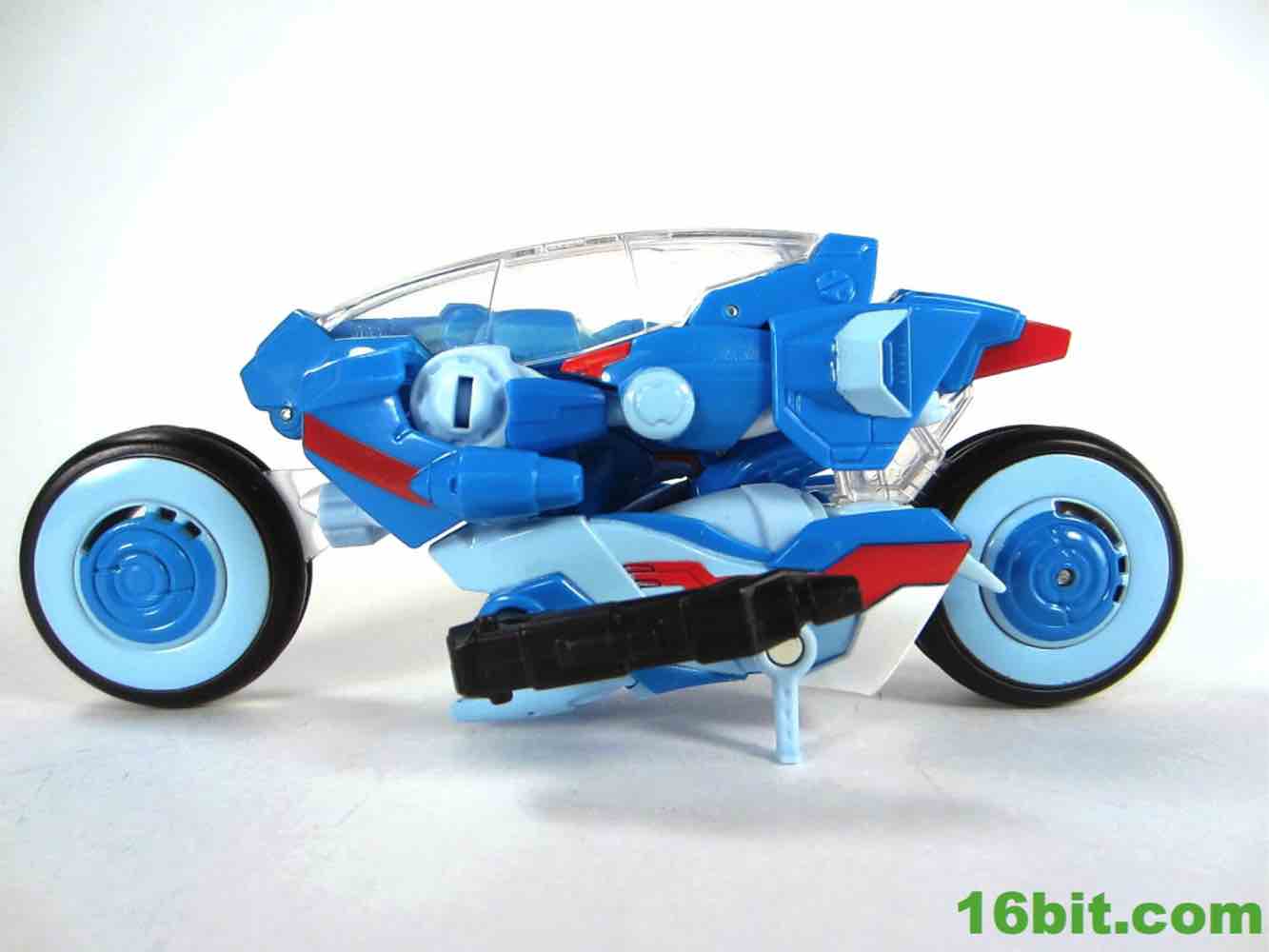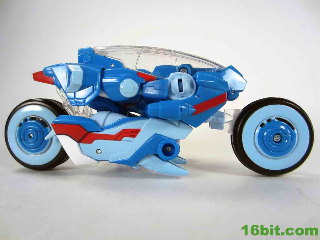 She's basically similar to a Tron bike or Afterburner's alt mode, which is great. The good news is the vehicle is beautiful and futuristic, and you can plug her pistol in the side while scooting her along on your table. She pieces together nicely with some clever bits and nearly everything tabs in place. There's even a kickstand to keep the bike upright, and that really works well.