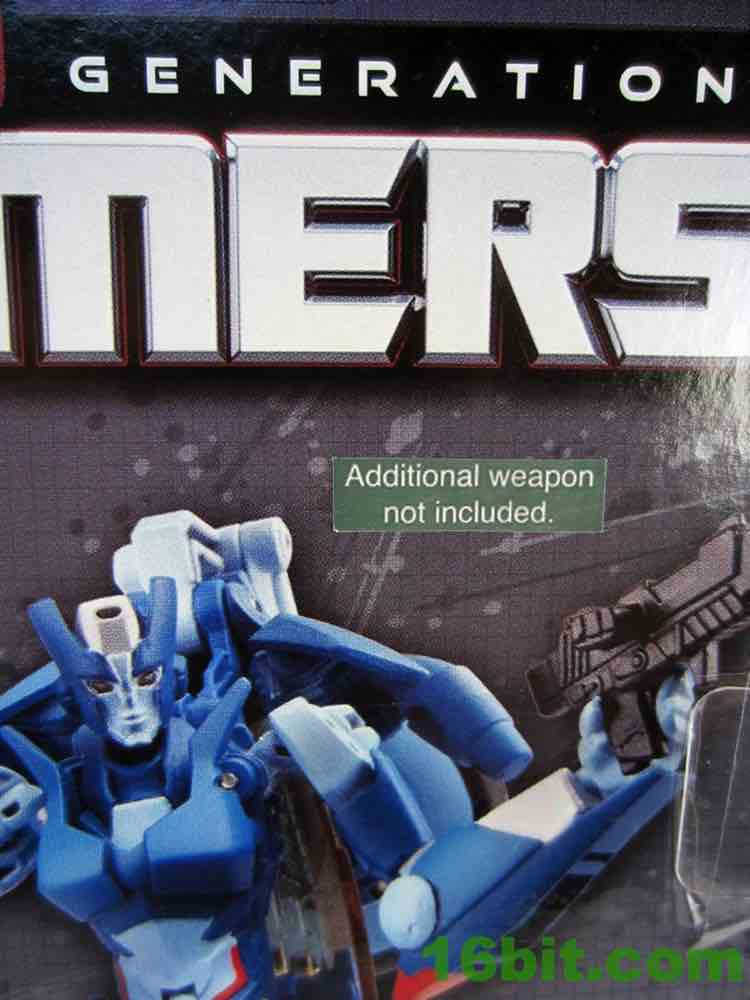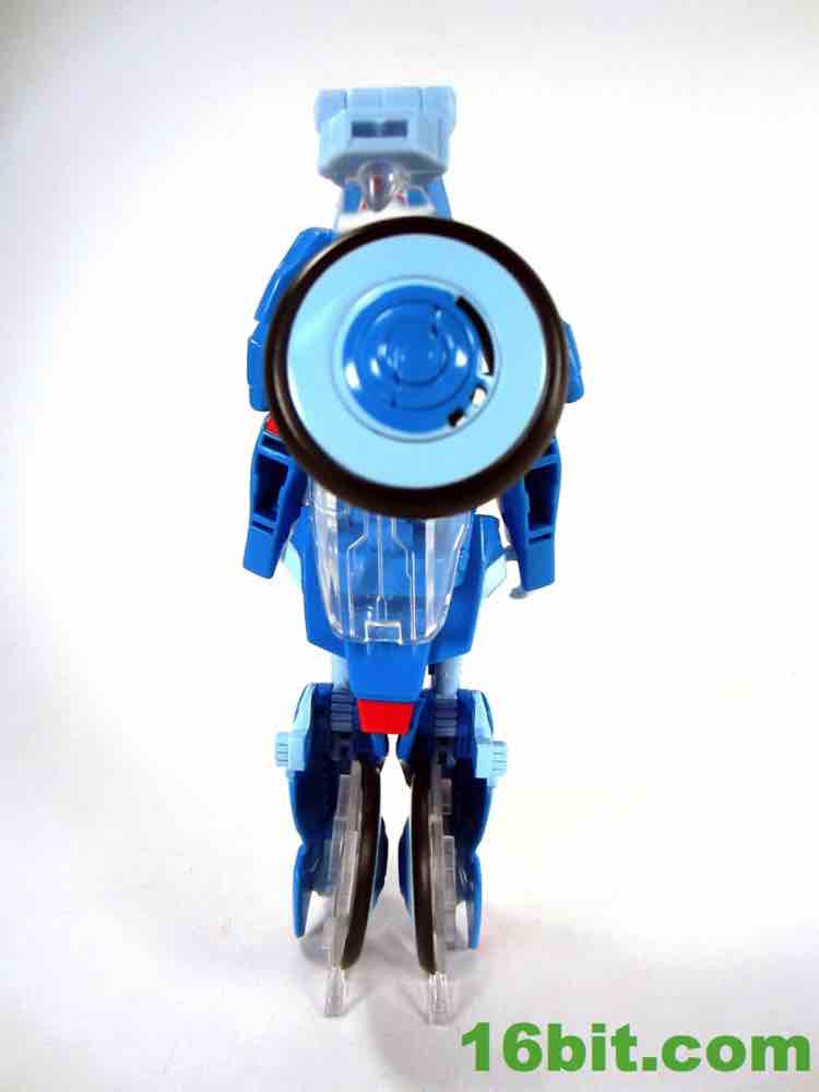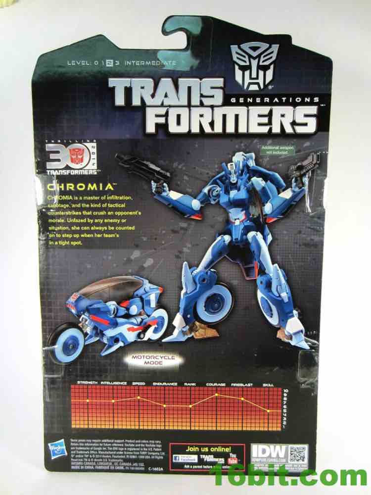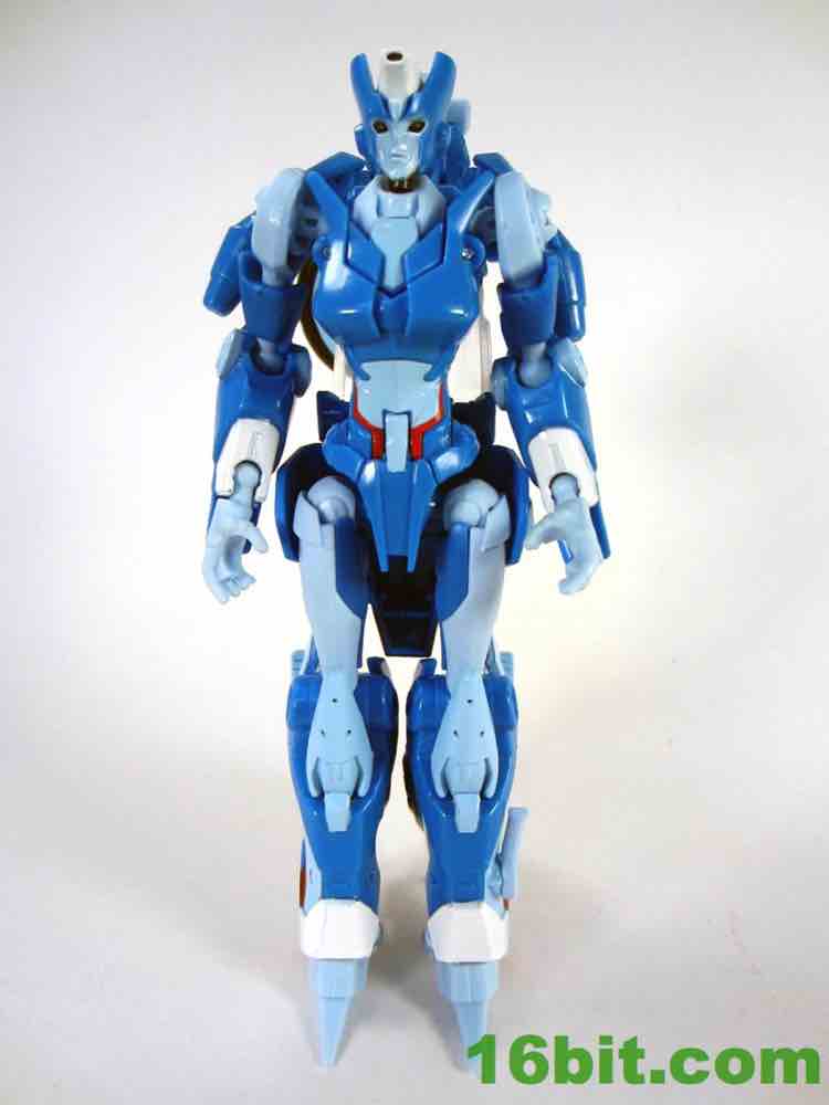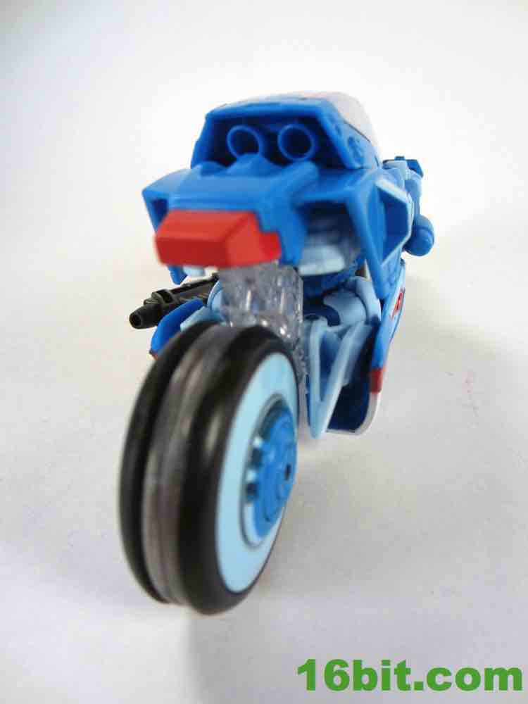 Transformations is pretty painless, everything unfolds nicely and the end result is a good-looking robot with a few articulation issues - specifically, the elbows and the hips. Also, the "windshield" of the bike is not removable to serve like a riot shield, as you saw in the comics. She only has a blaster with which to defend herself, and the back of the package has photography showing her with Arcee's alternate gun. A sticker confirms it isn't included.