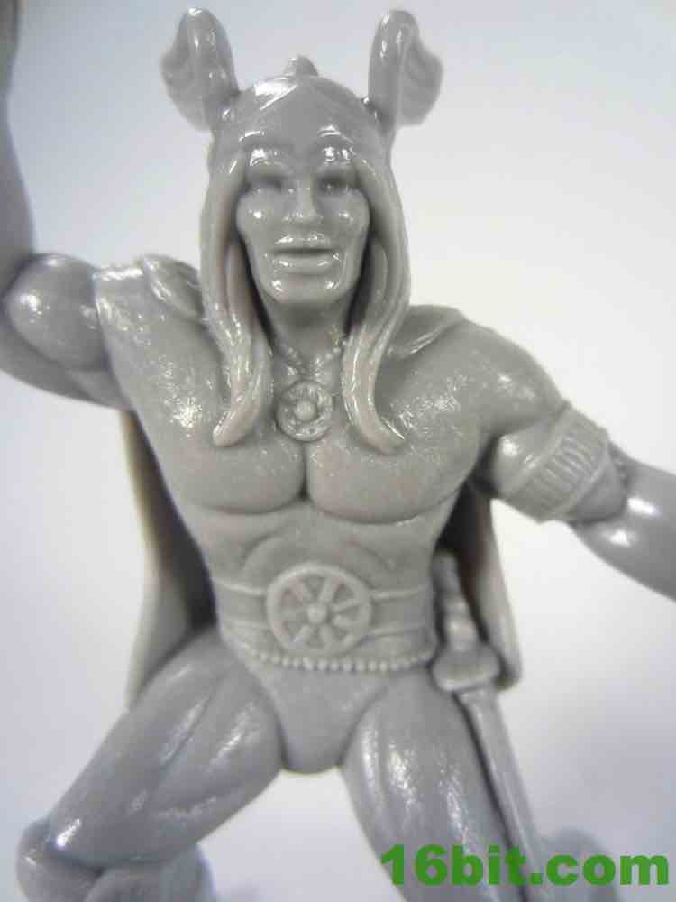 Inspired by a certain God of Thunder, the Medieval Viking has a big axe and a cape, with nary a hammer in sight. A dagger on his belt, a cape on his back, retooled wings on his helmet, and a revised belt make this figure feel quite a bit different from the original - but there are some looks that are hard to avoid. There's a slightly grainy texture on the cape and costume which looks and feels great, especially on the grey figures. The axe is nifty and the boot detail is pretty great, too. A lot of work seems to have gone into this one, although it isn't obvious at first glance.