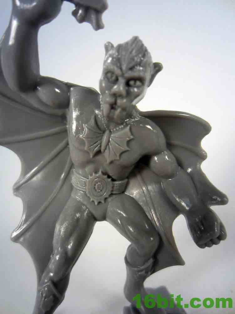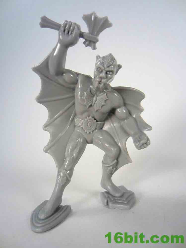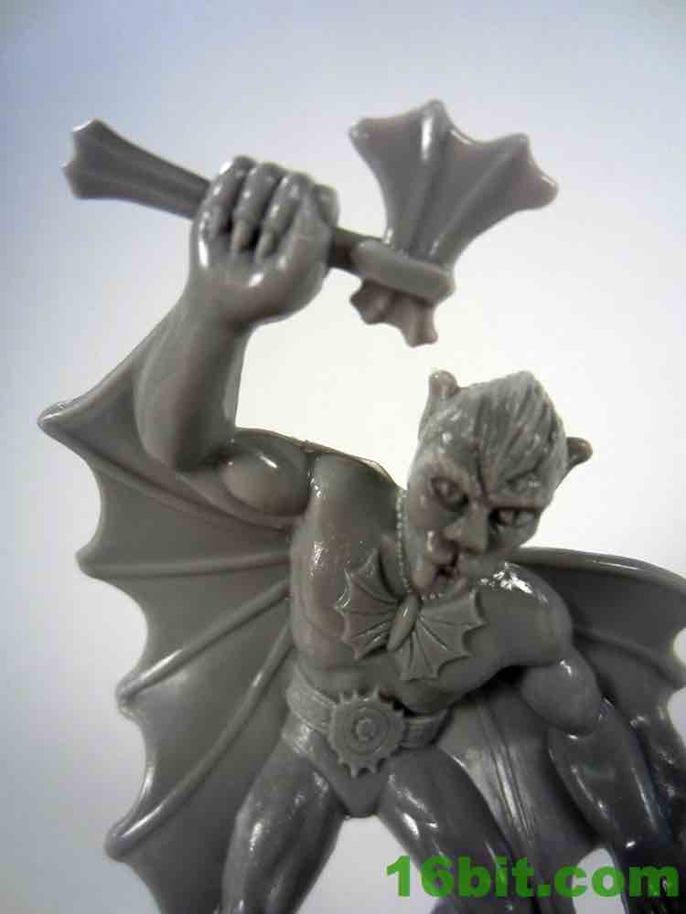 A horde of Winged-Tiger Demon figures based loosely on the pose of an old Falcon in some regions (and Human Torch in others) will just baffle you - there's very little similarity. Now given an axe, wings, and freaky heads, it's a unique monster unto itself The head sculpt is a smidgen rough around the edges, but the Demon - one of few figures I own called a demon - has slicked-back hair and great teeth. I assume the areas under the chin and behind the face were cut this way to function correctly in the tool, as there are some great details elsewhere that the head lacks. The axe looks like a bone and a bat wing joined up, while the chest and belt have some really good design work. This looks like a refugee from Eternia, or a gargoyle of some sort. It's a great design and likely a good addition to Hordak's forces. Each boot also has some nice design work, with a little bat symbol on each shin. It's an old fantasy figure that looks and feels like an old fantasy figure.