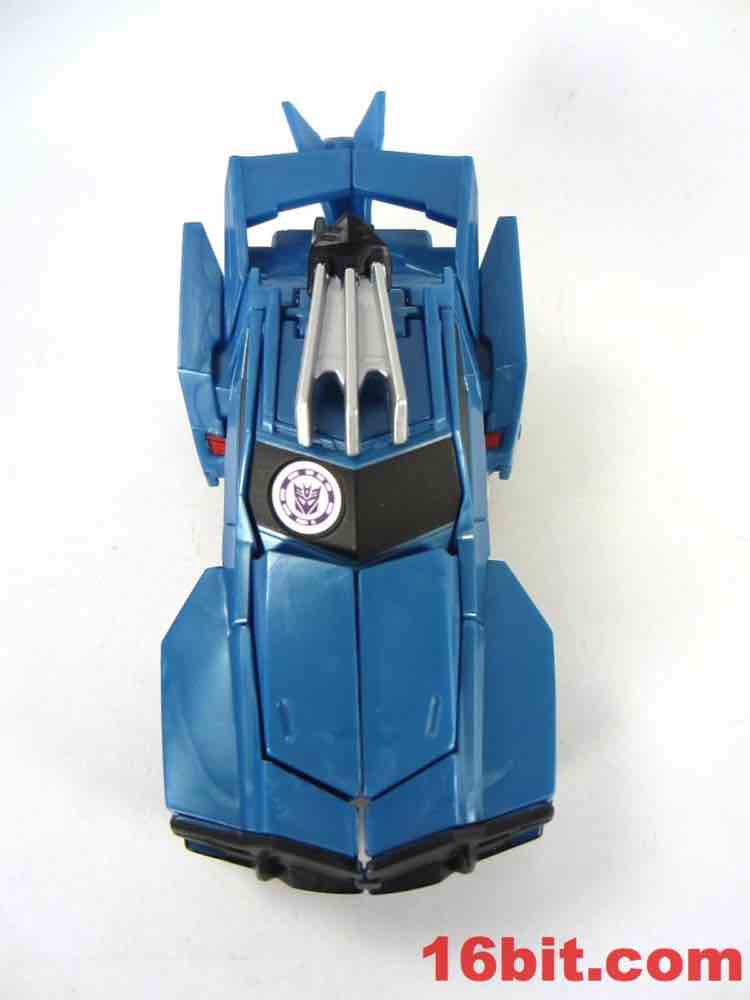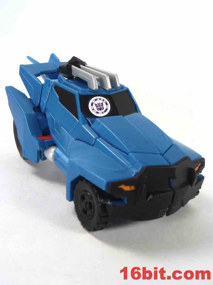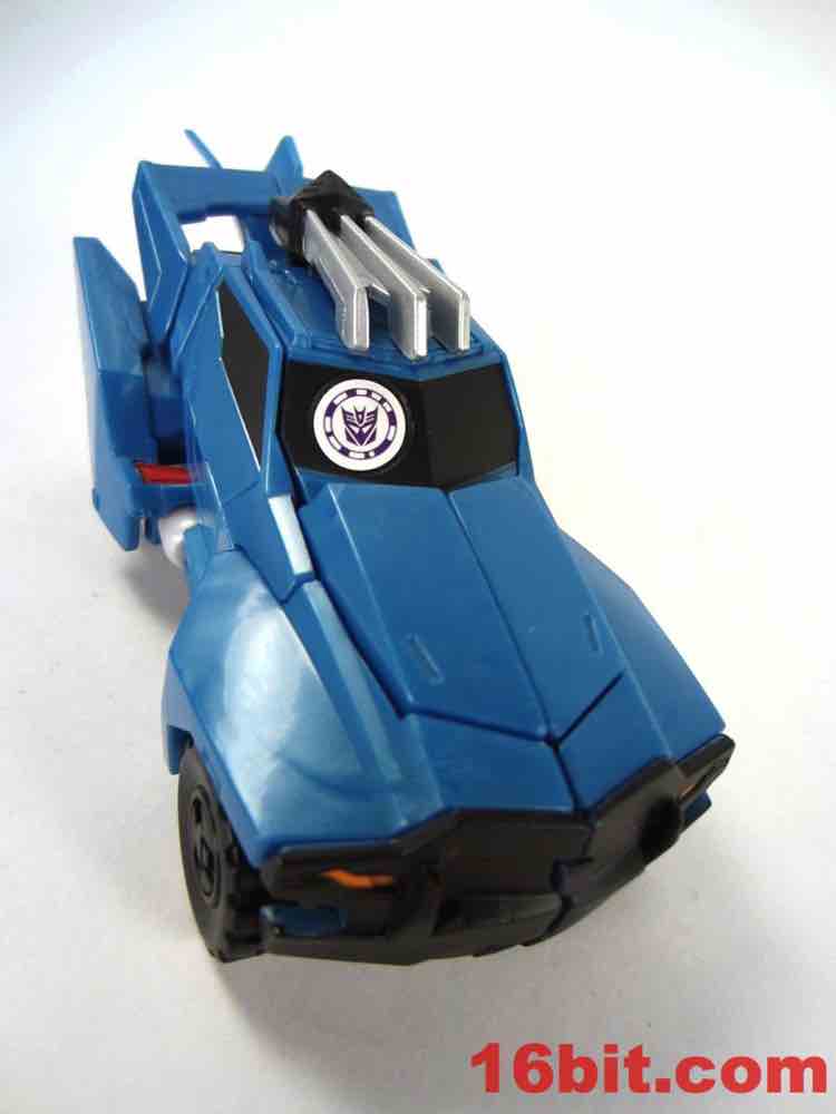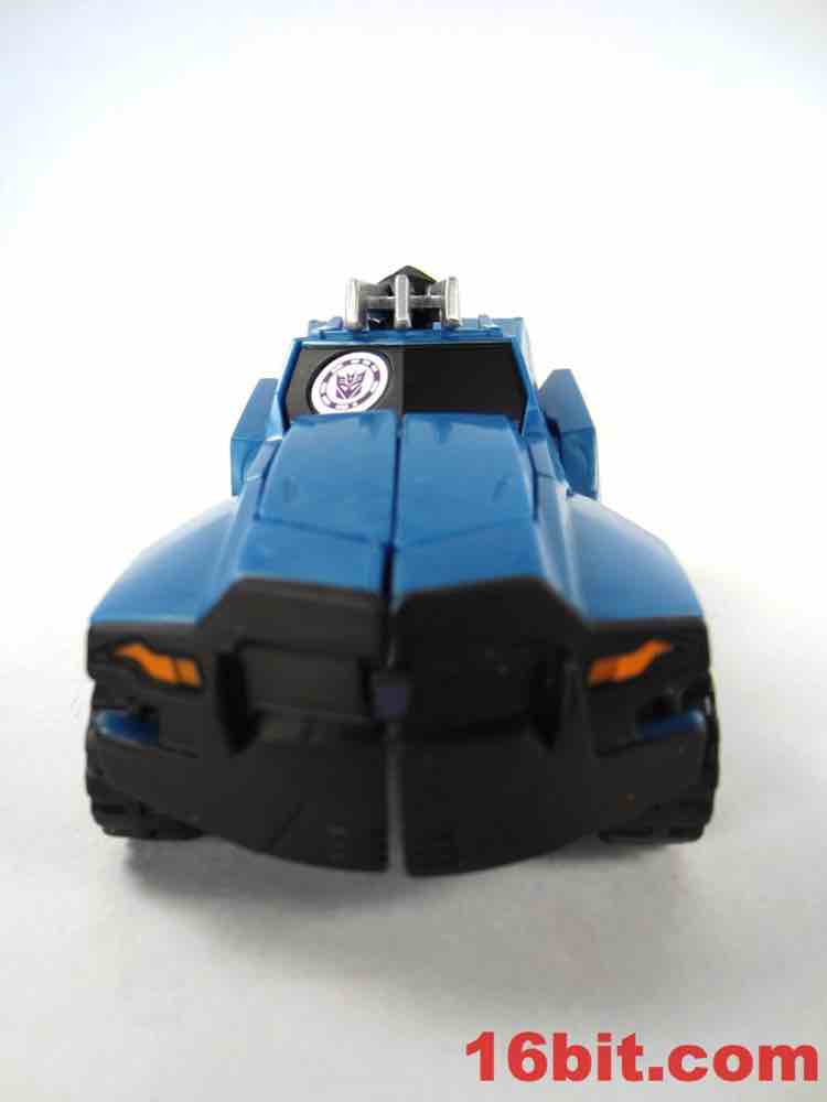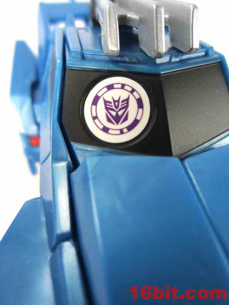 Since the show hasn't aired yet we don't know his deal - he shares a name with a classic cassette transformer, but his persona is a new one. Since the toy decided any biographical information on the package was a waste of time, you can pretty much just guess that he's a Decepticon - it's on the goofy sticker thing on his windshield and can be scanned by an application on a smartphone that I don't have - which is a new attempt to integrate some sort of game functionality into the toy. I find it comical, mostly because they literally just painted a target on the chest of a character whose purpose is to fight in a robot gang war. I assume that must be over his spark chamber, so in terms of sensibility it's just a poor design. I'm theoretically all for toy-game integration but I'm not a huge believer that smart phone apps add much value to the toy, or vice-versa. That and it seems Transformers and gaming go together like pizza and a punch in the skull.