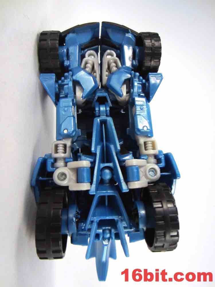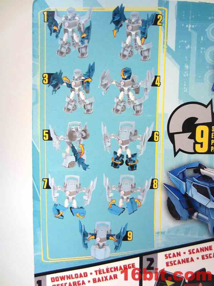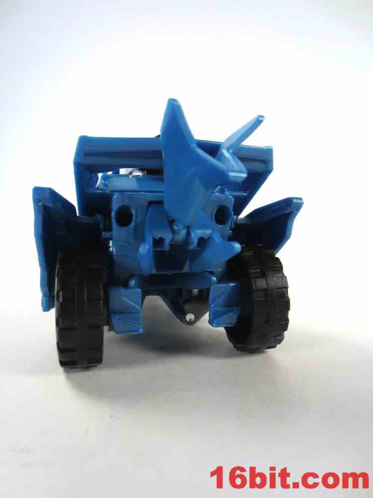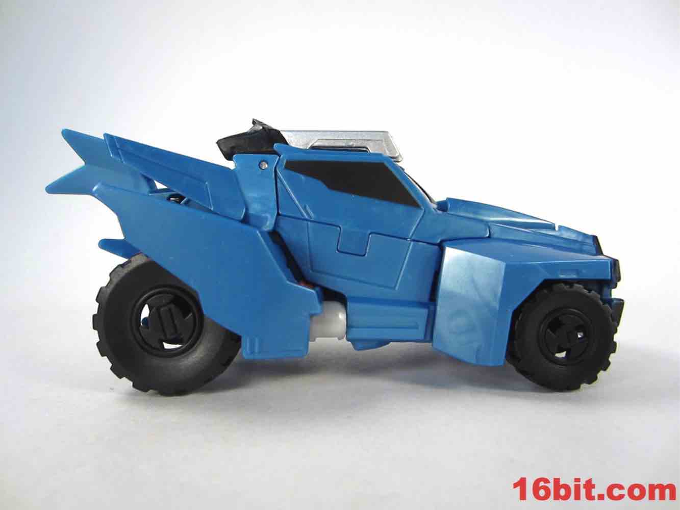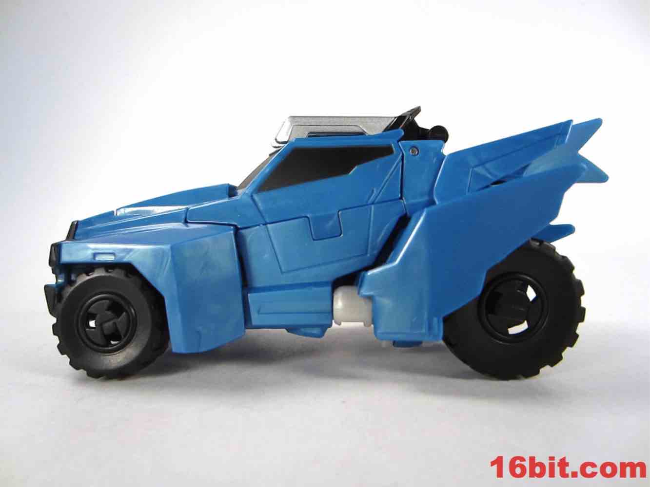 Since the show hasn't aired yet we don't know his deal - he shares a name with a classic cassette transformer, but his persona is a new one. Since the toy decided any biographical information on the package was a waste of time, you can pretty much just guess that he's a Decepticon - it's on the goofy sticker thing on his windshield and can be scanned by an application on a smartphone that I don't have - which is a new attempt to integrate some sort of game functionality into the toy. I find it comical, mostly because they literally just painted a target on the chest of a character whose purpose is to fight in a robot gang war. I assume that must be over his spark chamber, so in terms of sensibility it's just a poor design. I'm theoretically all for toy-game integration but I'm not a huge believer that smart phone apps add much value to the toy, or vice-versa. That and it seems Transformers and gaming go together like pizza and a punch in the skull.