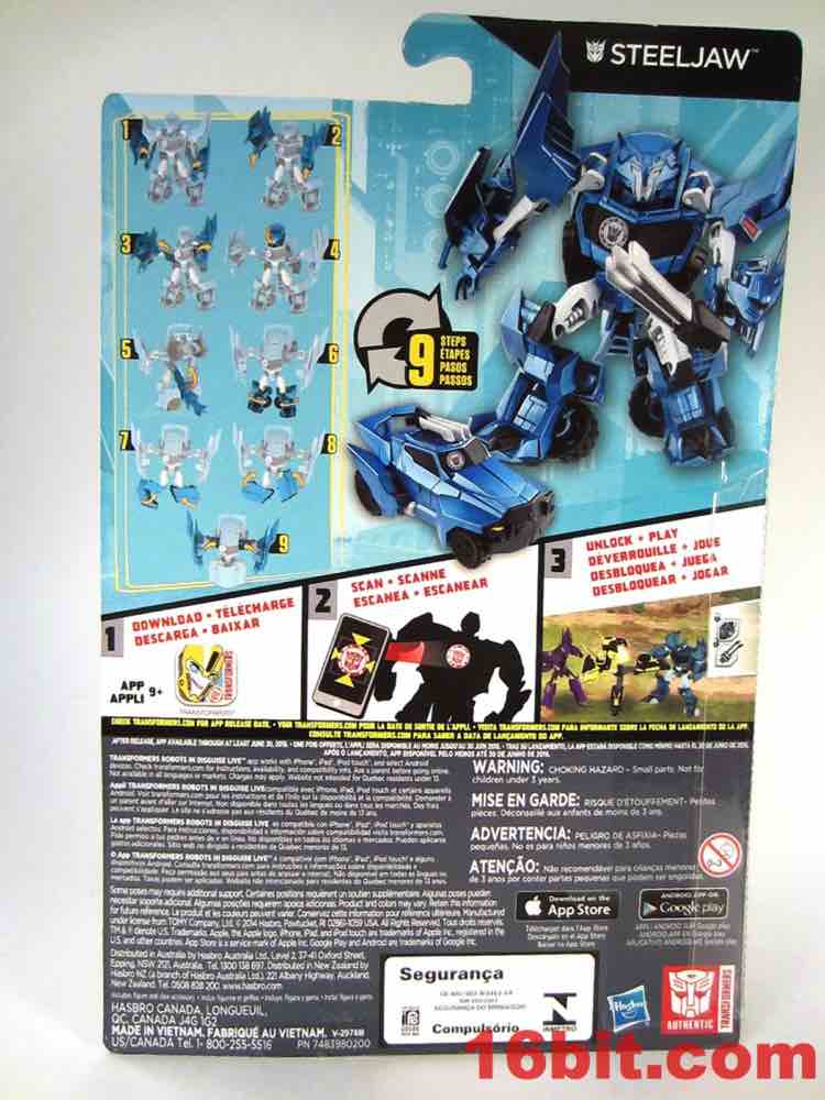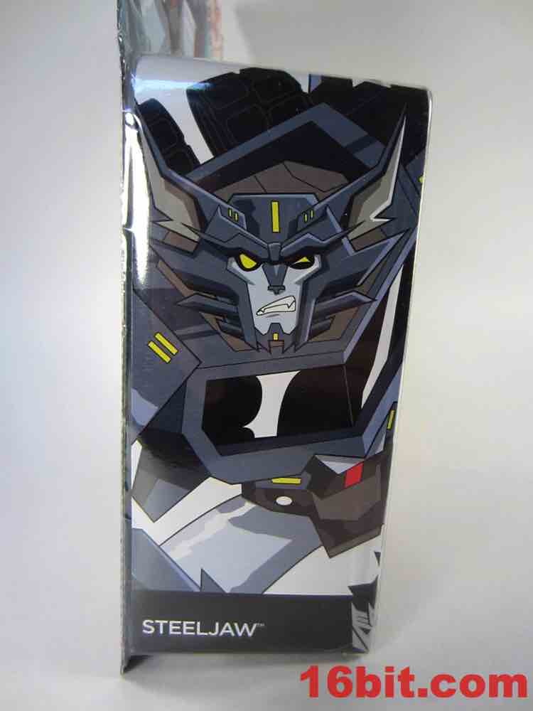 When I first saw Steeljaw I showed it to my long-suffering wife and said "hey, werewolf robot." She doesn't care about Transformers or, on the whole, a good chunk of the toy population of this basement. She said "that looks like those wolf figures that you like" and dang if she wasn't right. Finding new twists for this kind of toy is tricky, especially as Hasbro tries to find ways to keep the toy decent without raising the price too much. These guys are made in Vietnam (and not China anymore), with slightly less in the way of paint and accessories. The packaging is now one-size-fits-all with multiple languages barfed onto the cardback along with the instructions for the toy - that's right, the fold-out pamphlets are gone. Clearly we're seeing a big change in how the toys are done so Hasbro can keep the deluxe-ish toys as close to $10 as possible, which we're already seeing not happen over in the companion Combiner Wars series. Those are going to be in the $17-$20 range at most places. I would say that the production values of Steeljaw are very close to one of my other recent favorite toys, Fall of Cybertron Optimus Prime. The wheels snap in, there's not a lot of action here, and it's a little bit smaller.
