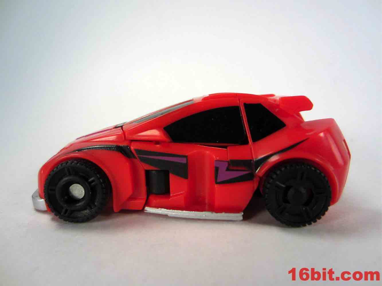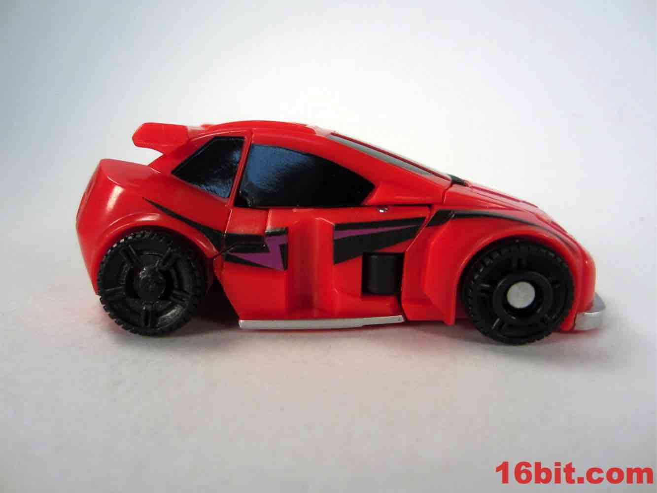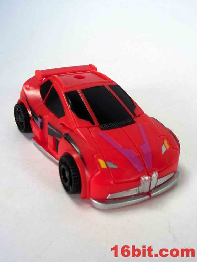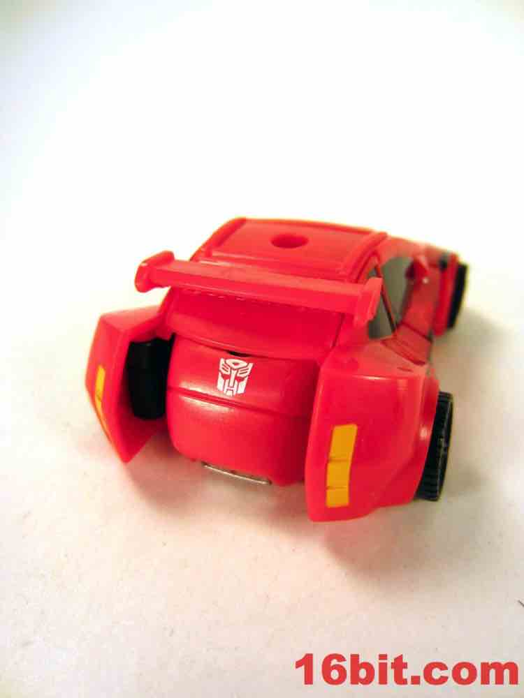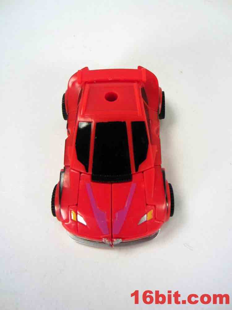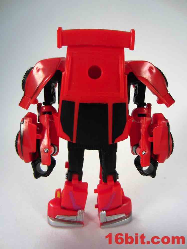 Transformation of this 4-inch tall robot is pretty simple - the fists rotate in, the arms become the sides of the car, the head rotates in, and the feet fold down. Presto - you get a red car. The wheels aren't very useful and despite having the ability to spin seem mostly ornamental - they're not really great rollers.