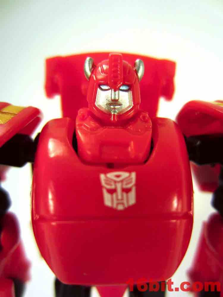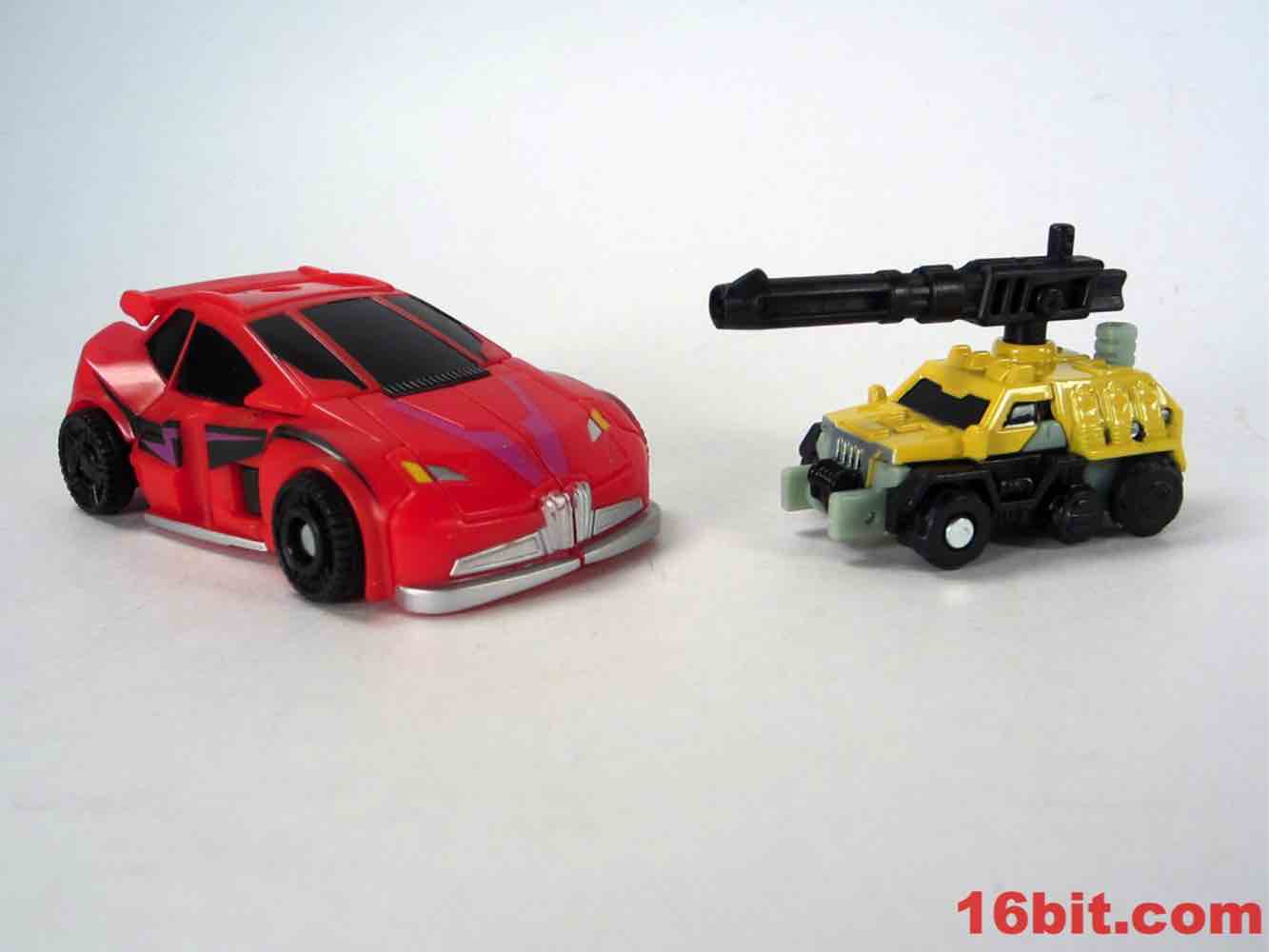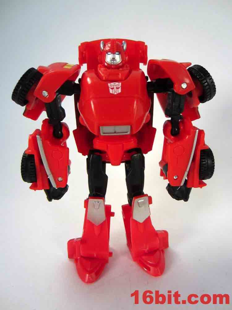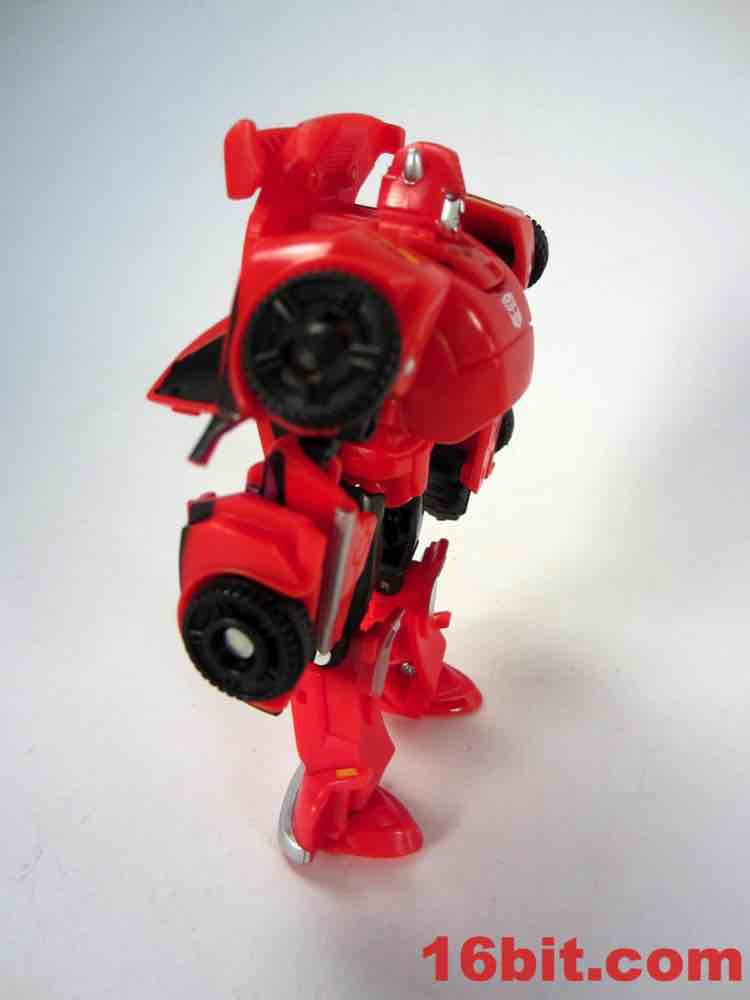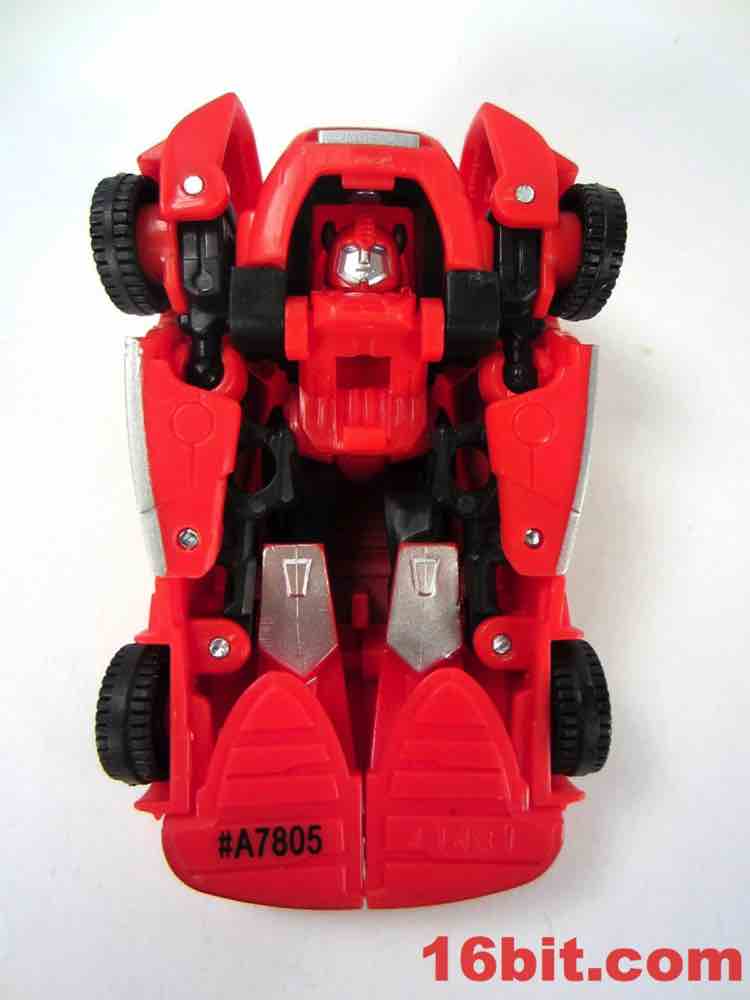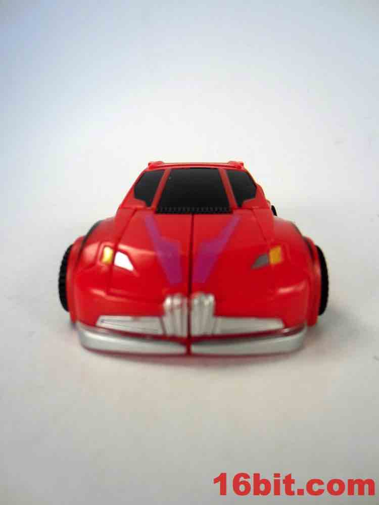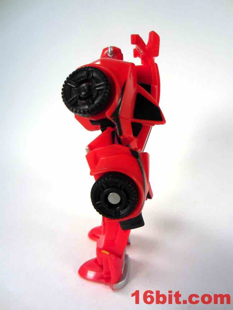 Transformation of this 4-inch tall robot is pretty simple - the fists rotate in, the arms become the sides of the car, the head rotates in, and the feet fold down. Presto - you get a red car. The wheels aren't very useful and despite having the ability to spin seem mostly ornamental - they're not really great rollers.