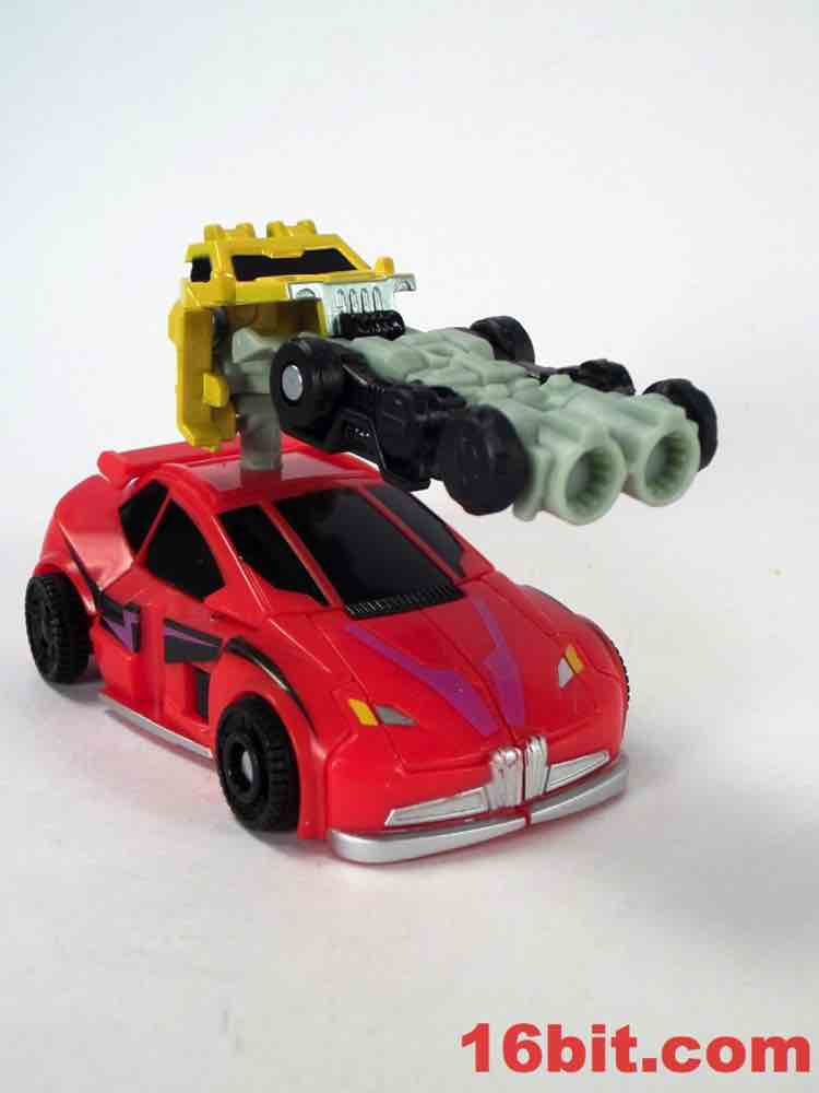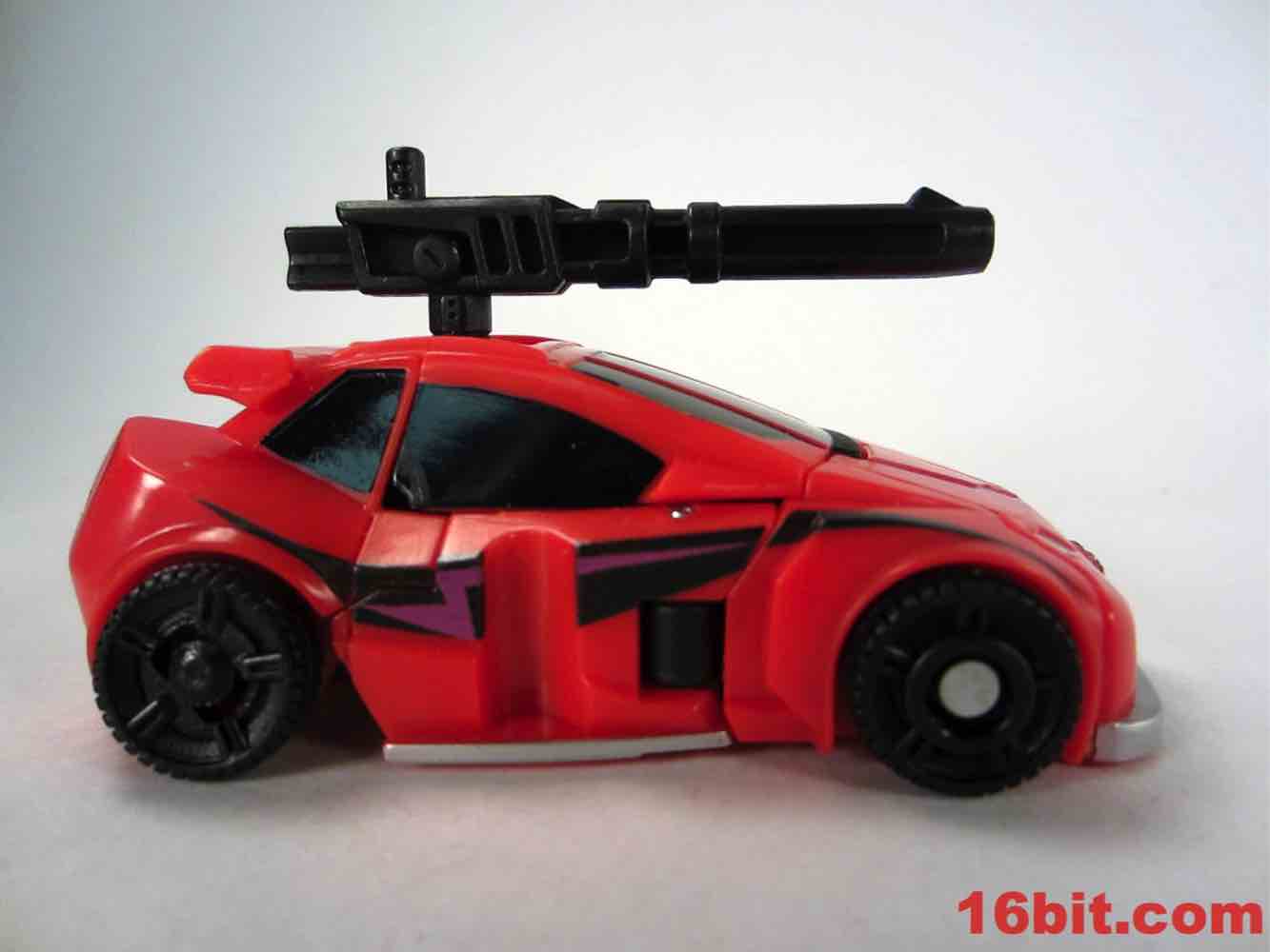 I love the deco because it vaguely reminds me of the M.A.S.K. Thunderhawk vehicle frm tom the 1980s with its red body and purple deco on the doors. While it can't fly or drop bombs, you can mount a 5mm weapon like the included blaster or Suppressor in gun mode on the roof, which is nice. Some vehicle alt modes don't even have that much in terms of play features.