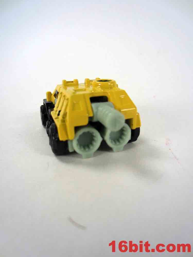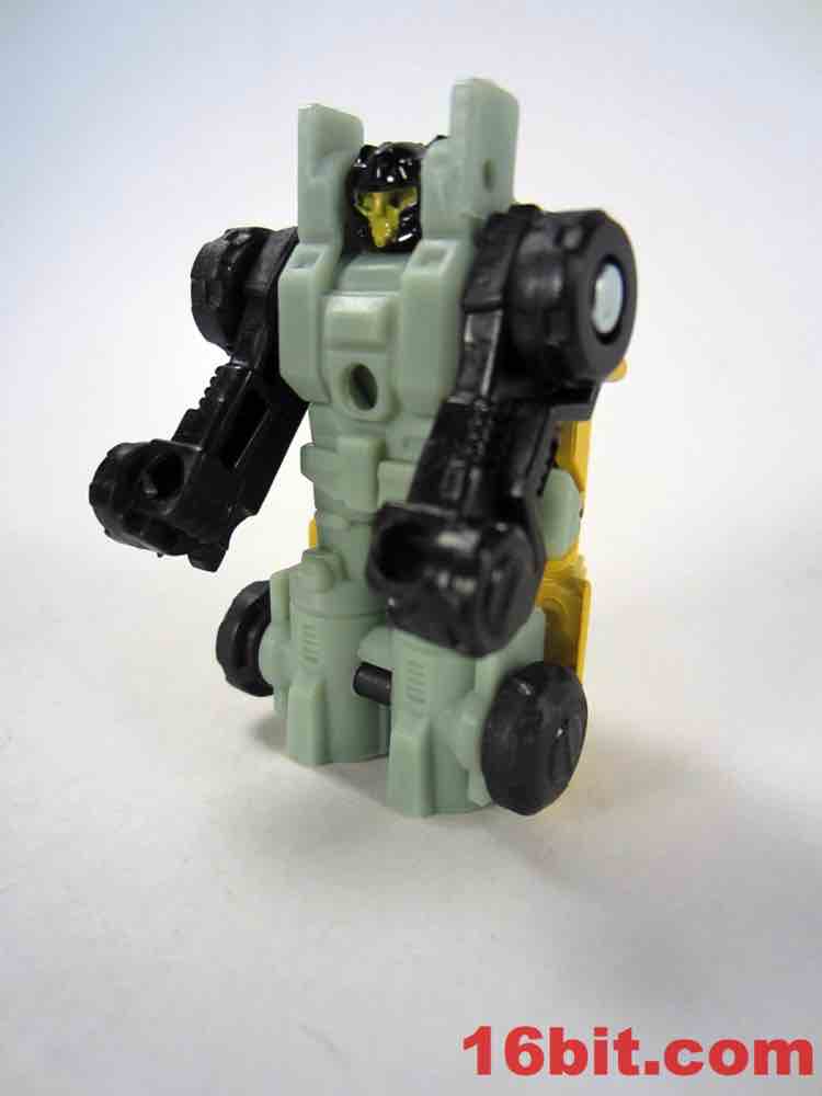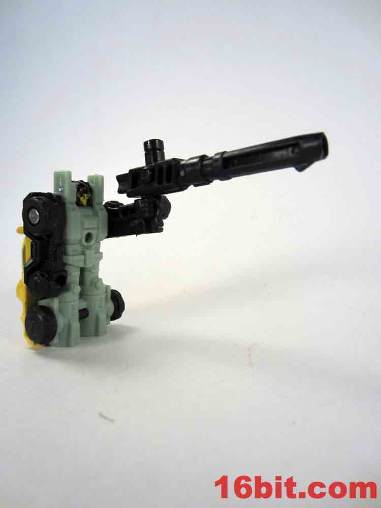 Suppressor is a redeco of Roller, with a lot more paint. The yellow parts are entirely painted, with a silver girlle and some black bits. It makes the toy look a little sharper, and transformation is as simple as always. Take the truck, and stand it up on the back end and presto - robot. He has articulated arms which can hold the big gun, as it also sports a 3mm peg. To get a blaster, rotate the 5mm peg on Suppressor down and fold down the back of the truck to get a giant, dual-blaster thing that seems more appropriate for a larger toy. Or for Cliffjumper, since he's kind of crazy abotut weaponry. Unlike Spinister the name doesn't seem to come from an obvious existing source, but he does hold a resemblance to Ironworks and Erector from the late 1980s.
