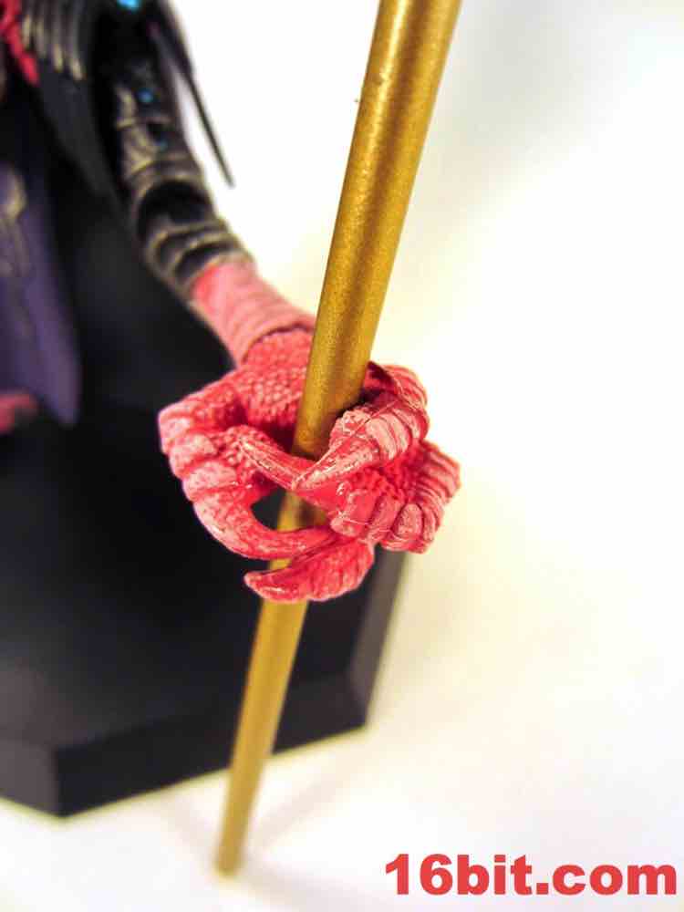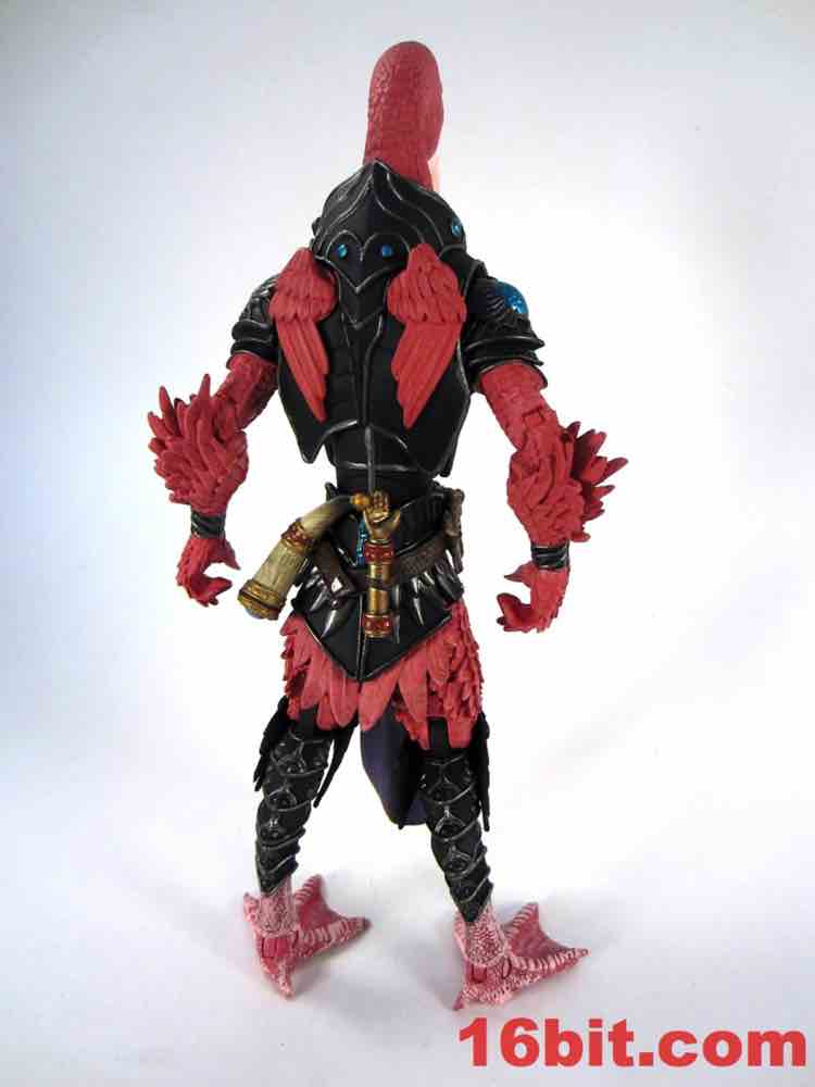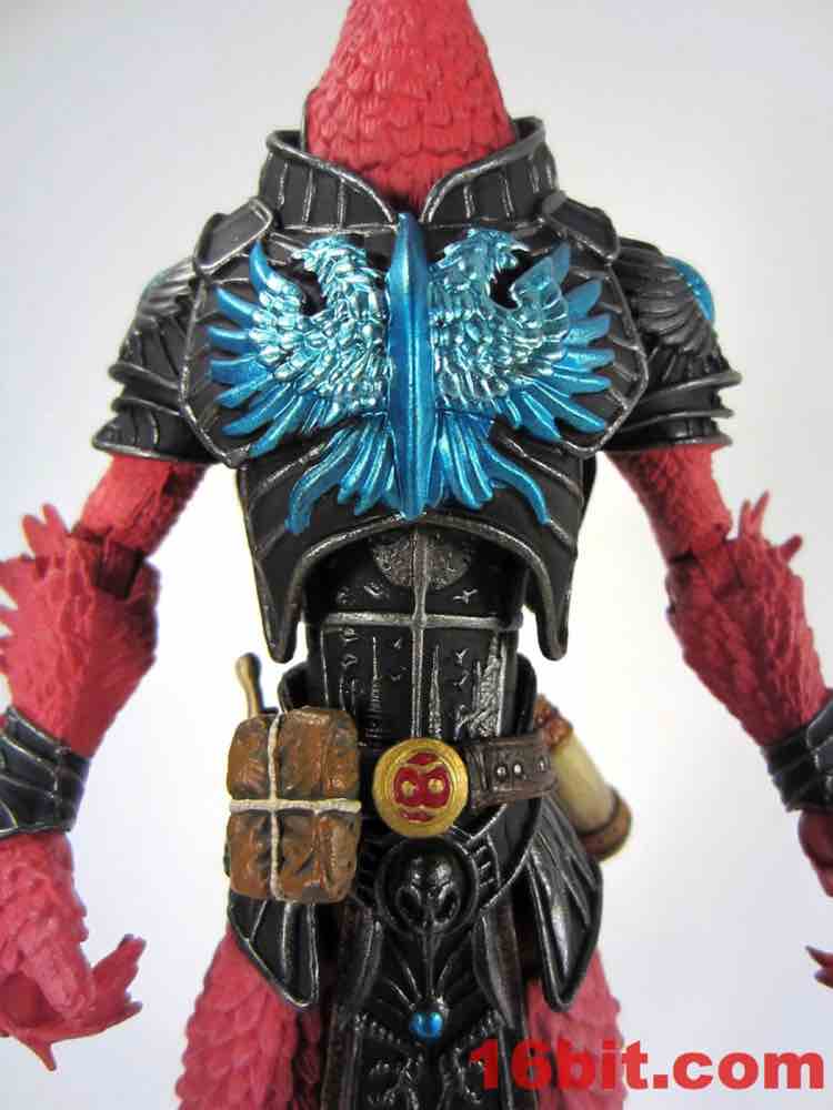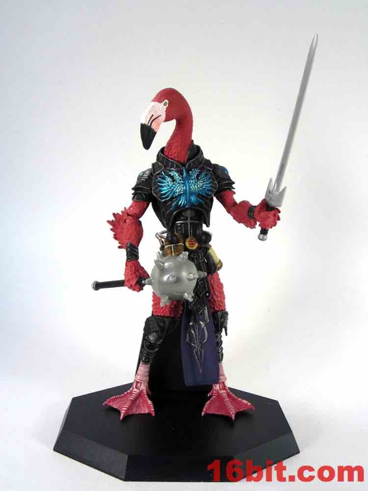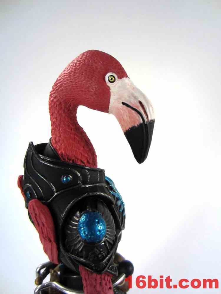 The body sculpting is basically the same and the head is incredibly realistic. The beak paint needs a little work - white paint on pink plastic can do that - but it's still pretty excellent. If you're really looking to be wowed, check out the armor. Metallic blue elements are all over this one, as are some gunmetal bits like a castle and a moon hidden over what I assume is a feathered six-pack. Each and every feather is nicely decorated, and the webbed feet are brushed over nicely. I've paid more for statues and mini busts that don't look half this good.