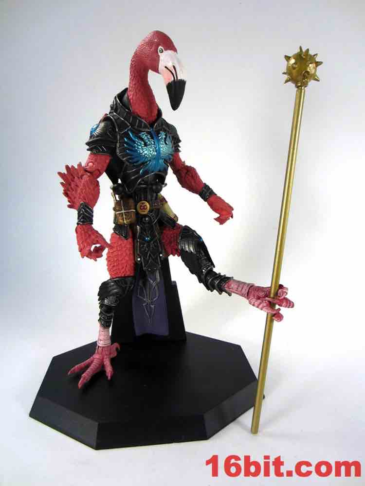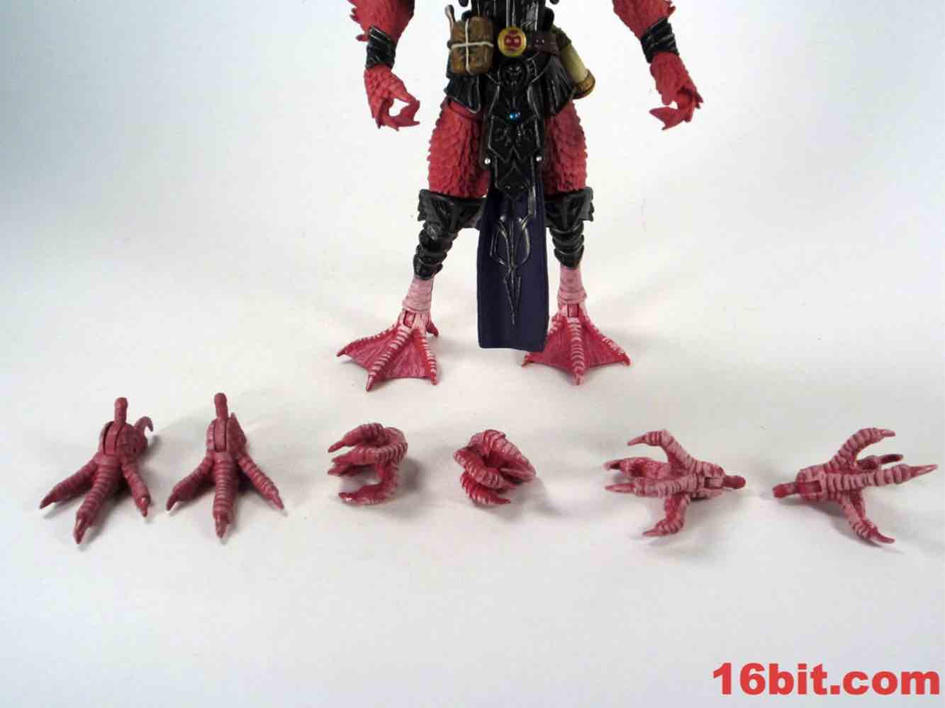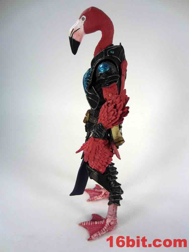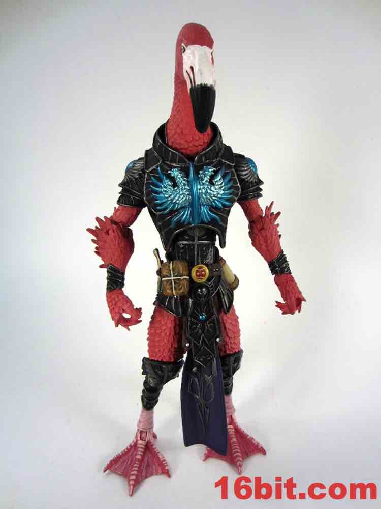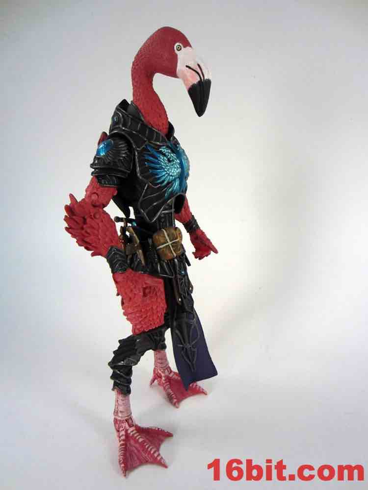 Flamingus has a few customizable bits. He pops apart at the waist so you can remove his belt, which is a separate piece with lots of intricate paint applications. His feet easily pop off, and you can swap the default clawed toes for webbed feet, gripping feet, and something in between gripping and flat. If you choose to use these, I would suggest using the display stand. Actually, with Flamingus I've found that gravity and his dozens of joints will cause him to fall over in a couple of hours. As such, use a doll stand or one of the Four Horsemen stands of this guy because you don't want him to fall and crash on the ground.